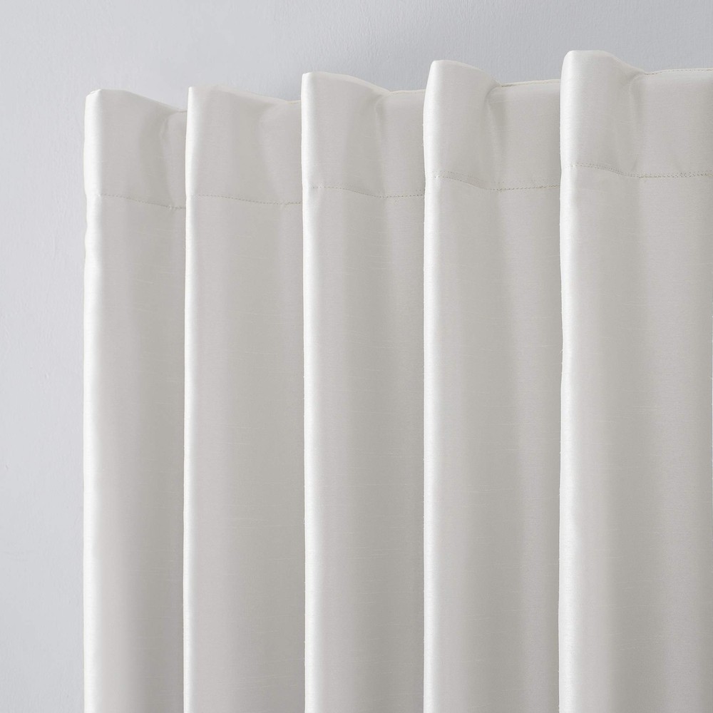Introducing the Greyson Faux Dupioni Silk Thermal Extreme Total Blackout Back Tab Curtain Panel, a perfect blend of style and functionality. Measuring 50" x 84", this panel is made of elegant faux dupioni silk fabric with a raw slub texture, adding a touch of opulence to your room. The Extreme Blackout Thermal Lining ensures 100% light blockage, creating a dark and peaceful environment, ideal for bedrooms. This energy-efficient design helps reduce energy loss through windows by up to 40%, keeping your home comfortable in all seasons. The thermal properties also help in noise reduction by up to 30%, ensuring a sounder sleep. The back tabs fit curtain rods up to 1.5" in diameter. This curtain panel is hand wash only, do not tumble dry, and low iron. It is designed for indoor use and is not water-resistant. Experience the perfect balance of style and comfort with the Greyson Curtain Panel. Elegant faux dupioni silk fabric with a raw slub texture imparts opulent radiance Extreme Blackout Thermal Lining blocks out 100% of outside light Energy Efficient design reduces energy lost through your windows by up to 40% Thermal properties help keep summer heat and winter chill out of your home Noise reduction by up to 30% helps you get a sounder, more uninterrupted sleep Back tabs fit curtain rods up to 1. 5" in diameter