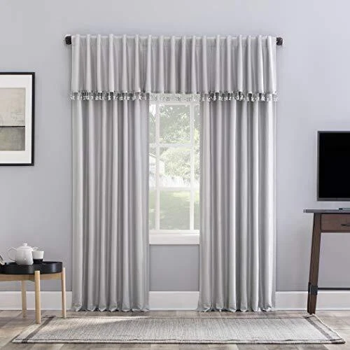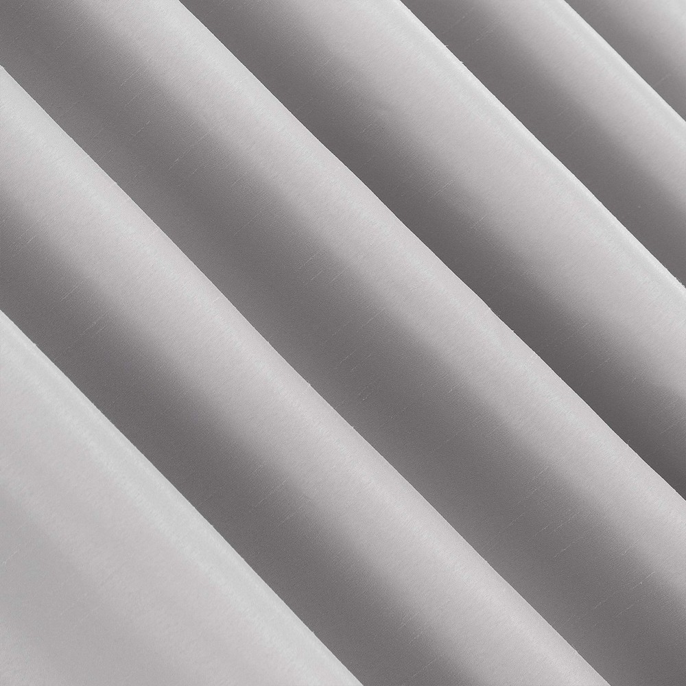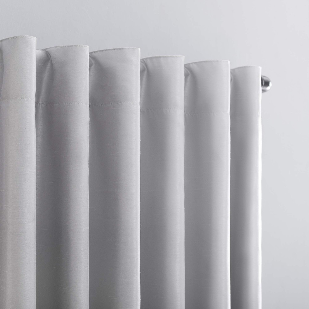 Featuring an elegant dupioni faux silk fabric with a raw slub texture, Greyson Faux Dupioni Silk Extreme 100% Blackout Back Tab Curtains provide the ultimate in light blocking technology to keep out even the harshest of light while adding opulent radiance to any room of your home. Extreme Blackout Thermal Lining is laboratory tested to block out 100% of light, reduce outside noise by up to 30%, and decrease energy lost through your windows by up to 40%. Comfort is optimized with thermal properties that help keep summer heat and winter chill out of your home. Built-in hidden back tabs allow for easy slide-through installation on curtain rods up to 1.5" in diameter. Hang in your entertainment room to eliminate screen glare and reduce distracting outside noise, or in your bedroom for enhanced privacy and a sounder, more uninterrupted sleep. Sold as individual panels measuring 50" width by 84" length in color chrome gray. Measure carefully before selecting your desired size and quantity. Rod not included. Machine wash cold on gentle cycle. Use non-chlorine bleach when needed. Tumble dry on low heat, using a cool iron as needed. Elegant faux dupioni silk fabric with a raw slub texture imparts opulent radiance Extreme Blackout Thermal Lining blocks out 100% of outside light Energy Efficient design reduces energy lost through your windows by up to 40% Thermal properties help keep summer heat and winter chill out of your home Noise reduction by up to 30% helps you get a sounder, more uninterrupted sleep Back tabs fit curtain rods up to 1.5" in diameter