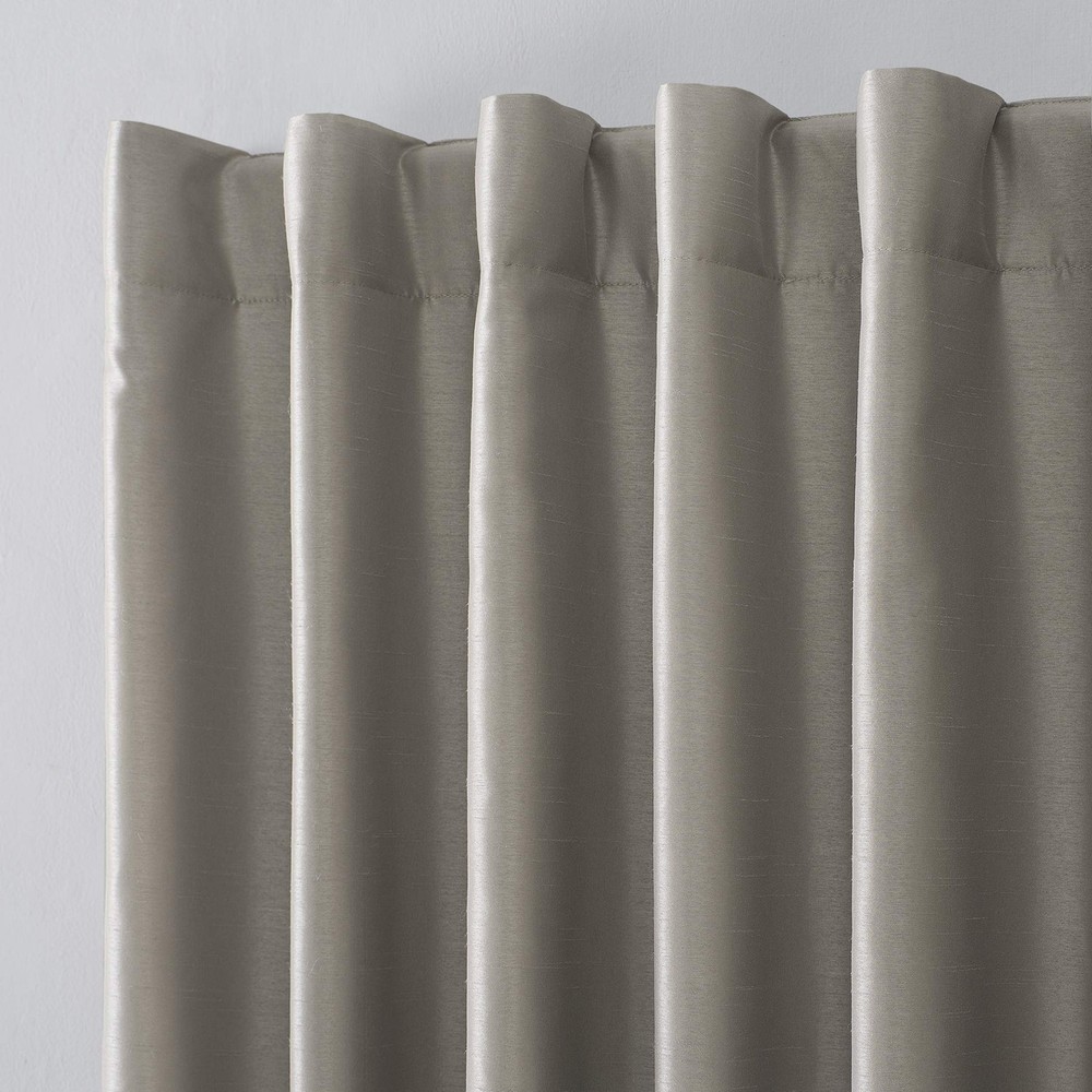 Elegant faux duping silk fabric with a raw slub texture imparts opulent radiance Extreme Blackout Thermal Lining blocks out 100% of outside light Energy Efficient design reduces energy lost through your windows by up to 40% Thermal properties help keep summer heat and winter chill out of your home Noise reduction by up to 30% helps you get a sounder, more uninterrupted sleep Back tabs fit curtain rods up to 1. 5" in diameter Item Package Dimension: 10.28L x 8.27W x 2.36H inches Item Package Weight - 1.8 Pounds Item Package Quantity - 1 Product Type - CURTAIN