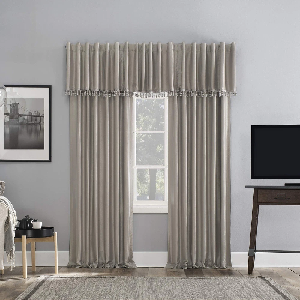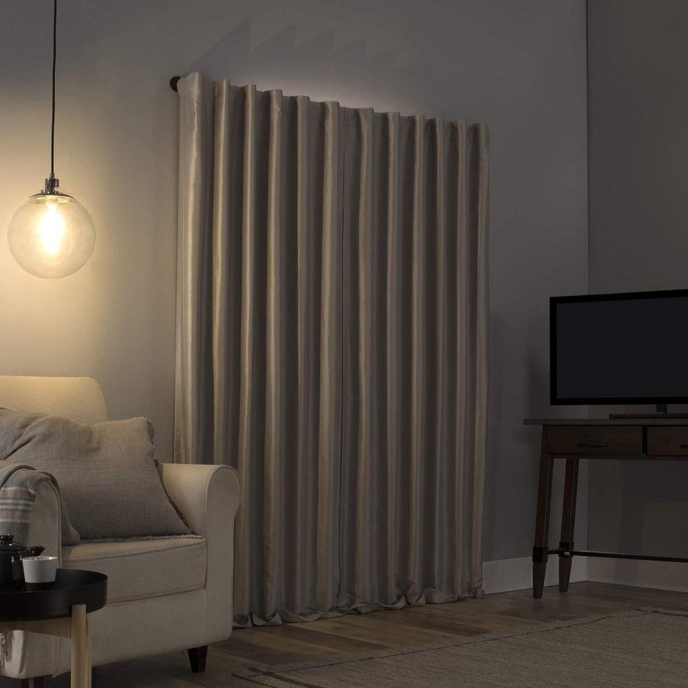 Elegant faux dupioni silk fabric with a raw slub texture imparts opulent radiance Extreme Blackout Thermal Lining blocks out 100% of outside light Energy Efficient design reduces energy lost through your windows by up to 40% Thermal properties help keep summer heat and winter chill out of your home Noise reduction by up to 30% helps you get a sounder, more uninterrupted sleep.Back tabs fit curtain rods up to 1. 5" in diameter.material type: Silk Stone