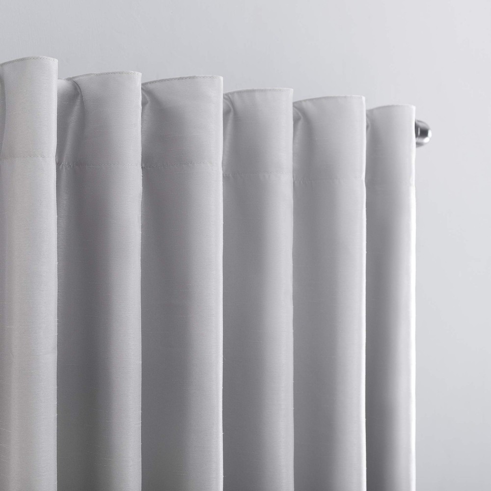 Elegant faux dupioni silk fabric with a raw slub texture imparts opulent radiance Extreme Blackout Thermal Lining blocks out 100% of outside light Energy Efficient design reduces energy lost through your windows by up to 40% Thermal properties help keep summer heat and winter chill out of your home Noise reduction by up to 30% helps you get a sounder, more uninterrupted sleep Back tabs fit curtain rods up to 1.5" in diameter