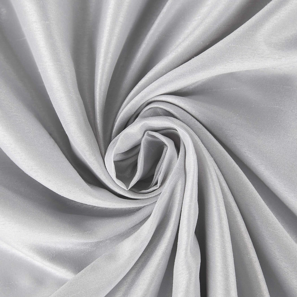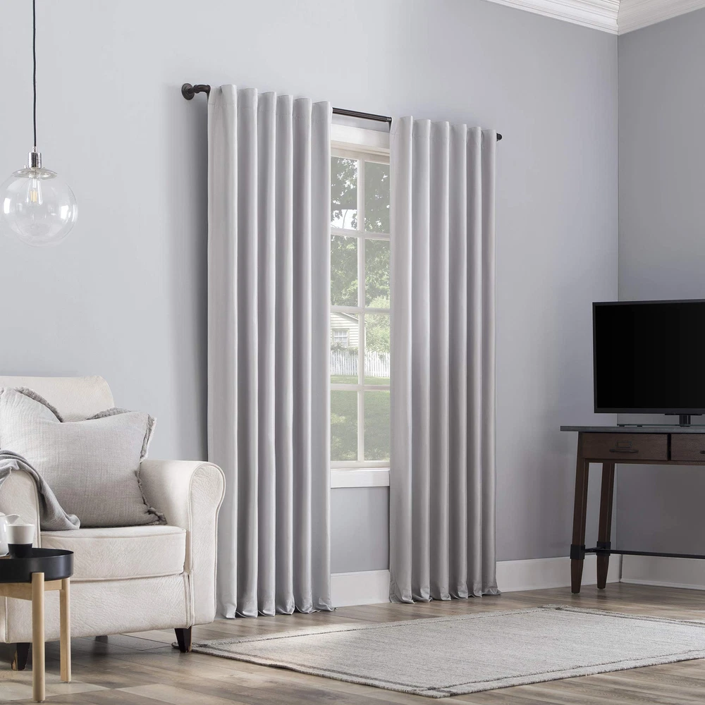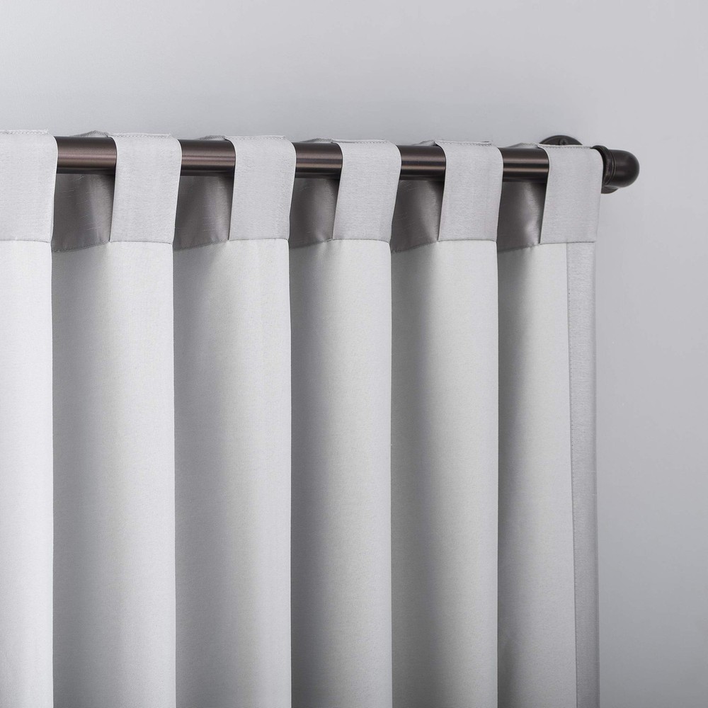Featuring an elegant dupioni faux silk fabric with a raw slub texture, Greyson Faux Dupioni Silk Extreme 100% Blackout Back Tab Curtains provide the ultimate in light blocking technology to keep out even the harshest of light while adding opulent radiance to any room of your home. Extreme Blackout Thermal Lining is laboratory tested to block out 100% of light, reduce outside noise by up to 30%, and decrease energy lost through your windows by up to 40%. Comfort is optimized with thermal properties that help keep summer heat and winter chill out of your home. Built-in back tabs allow for easy slide-through installation on curtain rods up to 1.5" in diameter. Hang in your entertainment room to eliminate screen glare and reduce distracting outside noise, or in your bedroom for enhanced privacy and a sounder, more uninterrupted sleep. Sold as individual panels measuring 50" width by 95" length in color chrome gray. Measure carefully before selecting your desired size and quantity. Rod not included. Machine wash cold on gentle cycle. Use non-chlorine bleach when needed. Tumble dry on low heat, using a cool iron as needed. Elegant faux dupioni silk fabric with a raw slub texture imparts opulent radiance Extreme Blackout Thermal Lining blocks out 100% of outside light Energy Efficient design reduces energy lost through your windows by up to 40% Thermal properties help keep summer heat and winter chill out of your home Noise reduction by up to 30% helps you get a sounder, more uninterrupted sleep Back tabs fit curtain rods up to 1.5" in diameter