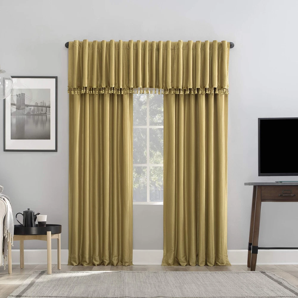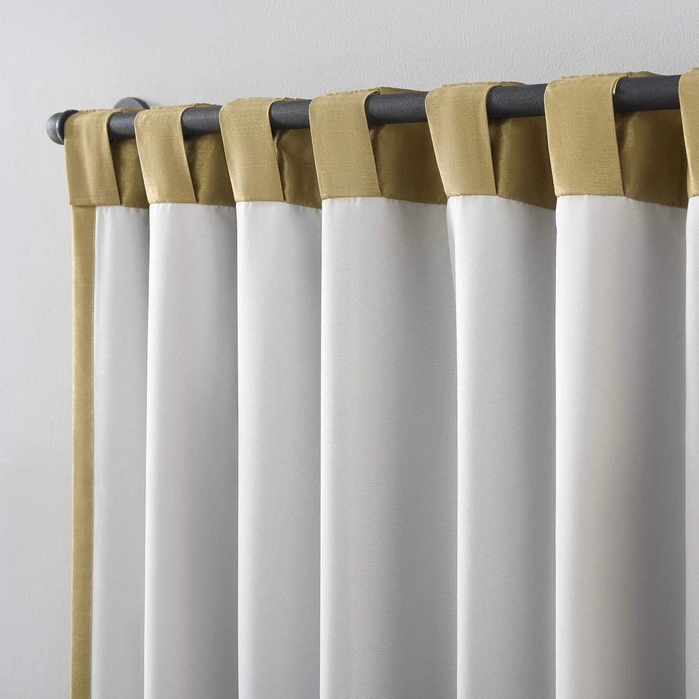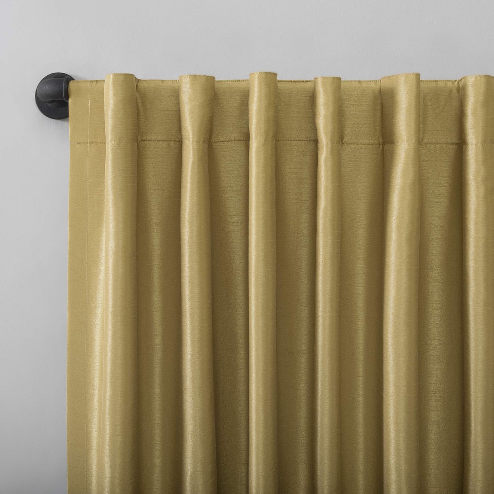 Featuring an elegant dupioni faux silk fabric with a raw slub texture, Greyson Faux Dupioni Silk Extreme 100% Blackout Back Tab Curtains provide the ultimate in light blocking technology to keep out even the harshest of light while adding opulent radiance to any room of your home. Extreme Blackout Thermal Lining is laboratory tested to block out 100% of light, reduce outside noise by up to 30%, and decrease energy lost through your windows by up to 40%. Comfort is optimized with thermal properties that help keep summer heat and winter chill out of your home. Built-in back tabs allow for easy slide-through installation on curtain rods up to 1.5" in diameter. Hang in your entertainment room to eliminate screen glare and reduce distracting outside noise, or in your bedroom for enhanced privacy and a sounder, more uninterrupted sleep. Sold as individual panels measuring 50" width by 95" length in color gold. Measure carefully before selecting your desired size and quantity. Rod not included. Machine wash cold on gentle cycle. Use non-chlorine bleach when needed. Tumble dry on low heat, using a cool iron as needed. Elegant faux dupioni silk fabric with a raw slub texture imparts opulent radiance Extreme Blackout Thermal Lining blocks out 100% of outside light Energy Efficient design reduces energy lost through your windows by up to 40% Thermal properties help keep summer heat and winter chill out of your home Noise reduction by up to 30% helps you get a sounder, more uninterrupted sleep Back tabs fit curtain rods up to 1.5" in diameter