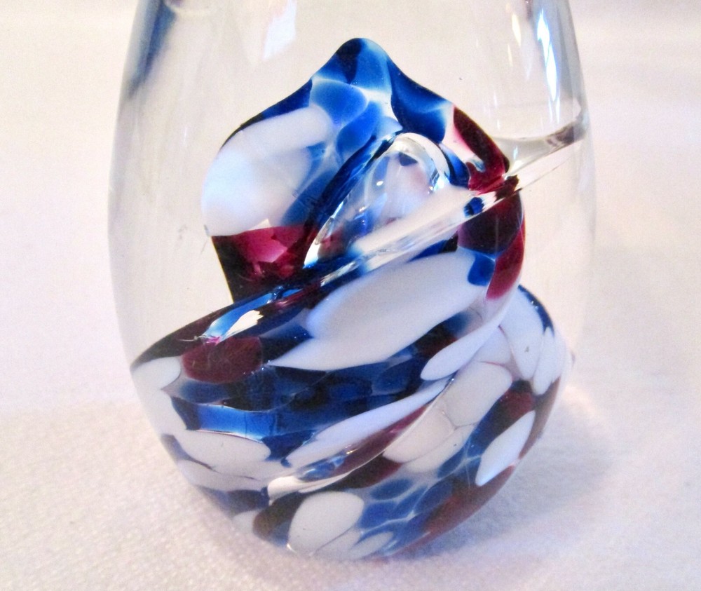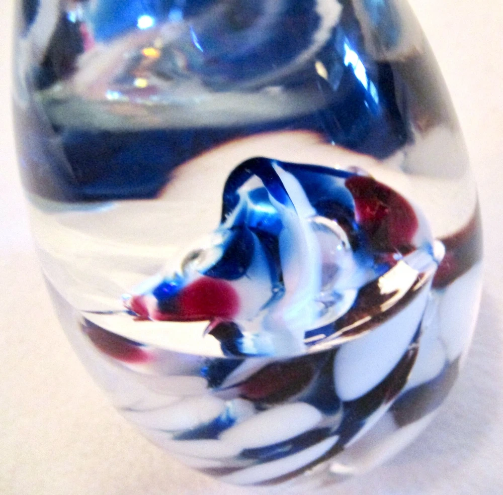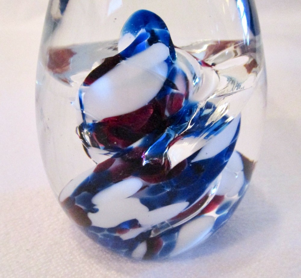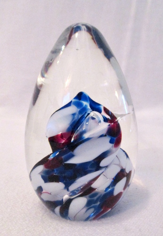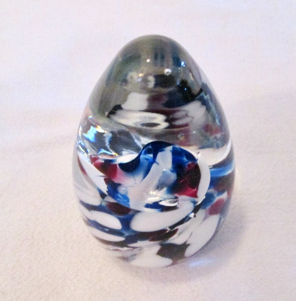 HAND BLOWN STUDIO ART GLASS EGG SHAPED PAPERWEIGHT SIGNED RED WHITE BLUE SWIRL This listing is for HAND BLOWN STUDIO ART GLASS EGG SHAPED PAPERWEIGHT SIGNED RED WHITE BLUE SWIRL . This is a clear glass egg with a red, white and blue swirl design. It is marked or signed on the bottom as pictured. It has a small scratch/chip on the bottom that is very hard to see. Measures 3 3/4" tall x 2 1/4" diameter at widest point. I am not an expert and I do describe as accurately as I can. If you have questions, please ask PRIOR to bidding. This is being sold as listed. We have many items in our store, so take a look and see what else you might like. Your satisfaction and positive feedback is important to us, so please contact us if your experience has been less than positive so that we can do our best to fix it. We do accept returns. The buyer does pay for return shipping. Thank you.
