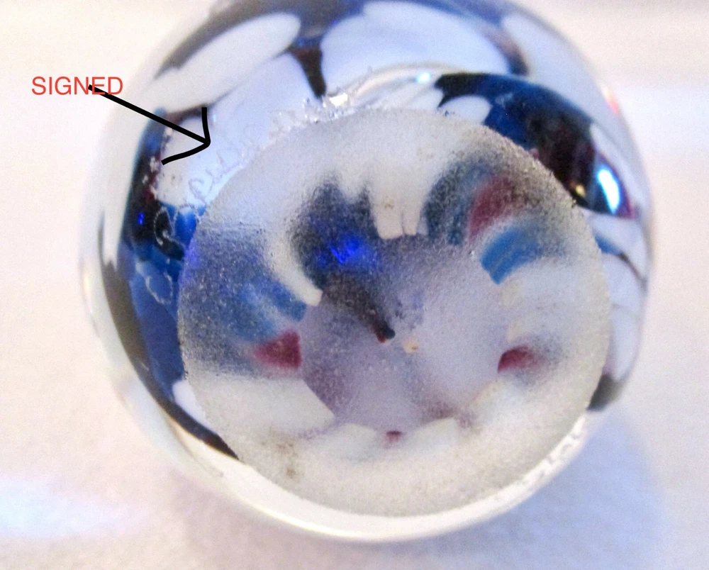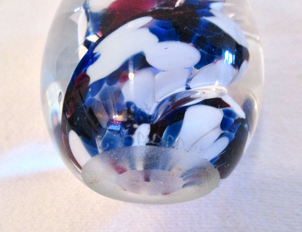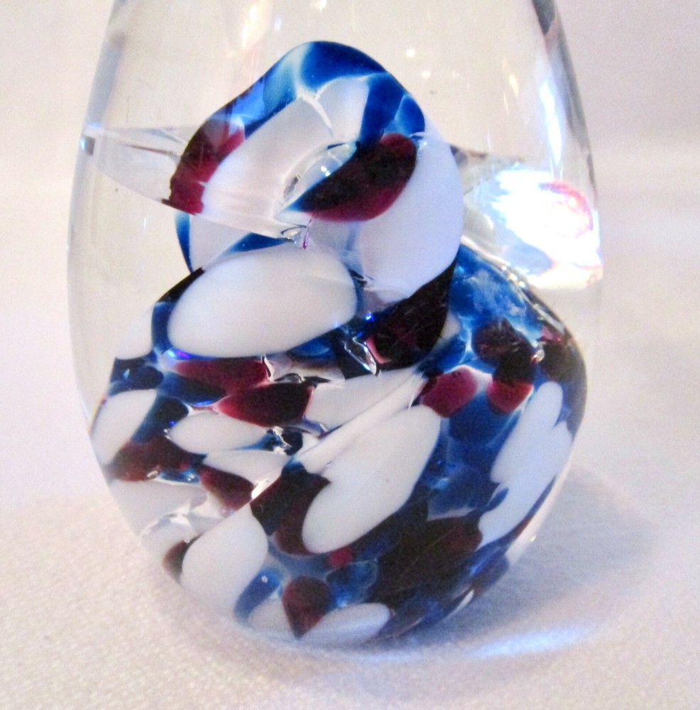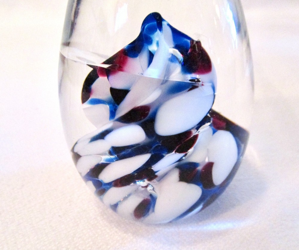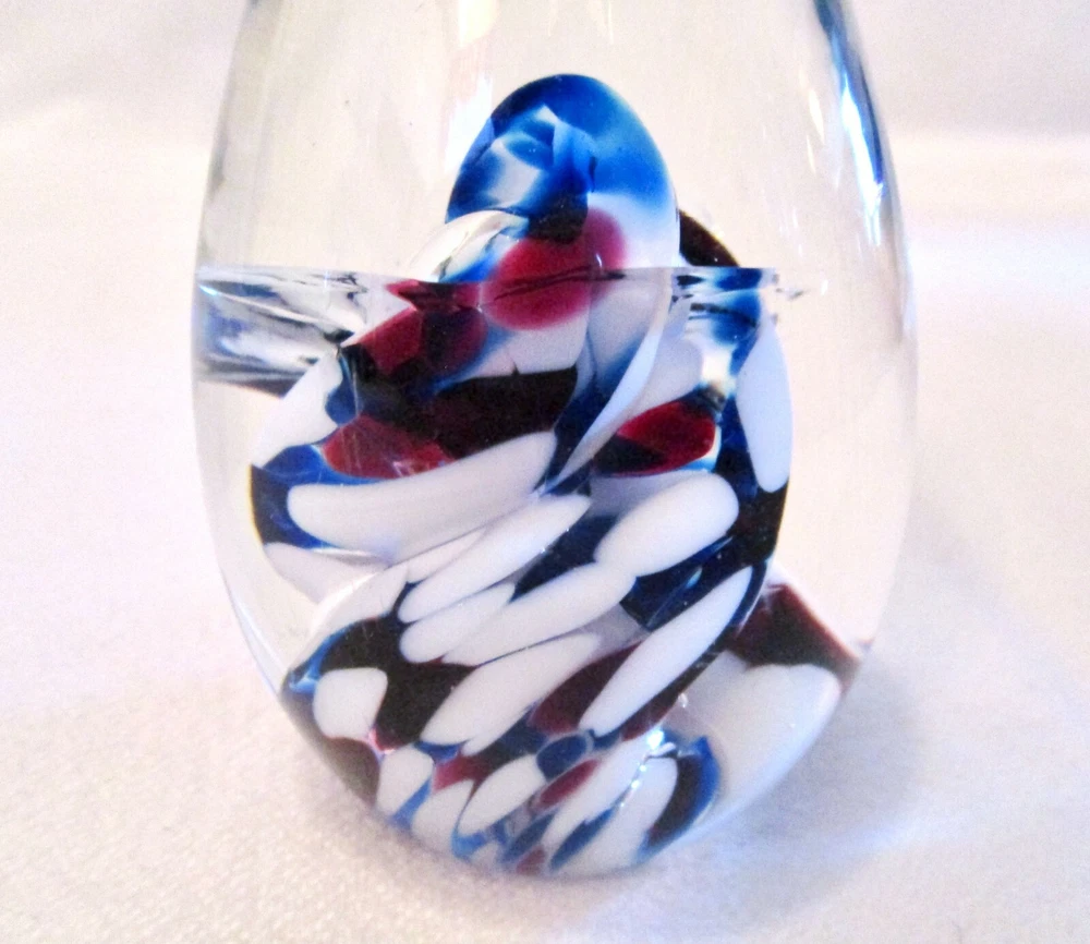 HAND BLOWN STUDIO ART GLASS EGG SHAPED PAPERWEIGHT SIGNED RED WHITE BLUE SWIRL This listing is for HAND BLOWN STUDIO ART GLASS EGG SHAPED PAPERWEIGHT SIGNED RED WHITE BLUE SWIRL . This is a clear glass egg with a red, white and blue swirl design. It is marked or signed on the bottom as pictured. It has a small scratch/chip on the bottom that is very hard to see. Measures 3 3/4" tall x 2 1/4" diameter at widest point. I am not an expert and I do describe as accurately as I can. If you have questions, please ask PRIOR to bidding. This is being sold as listed. We have many items in our store, so take a look and see what else you might like. Your satisfaction and positive feedback is important to us, so please contact us if your experience has been less than positive so that we can do our best to fix it. We do accept returns. The buyer does pay for return shipping. Thank you.