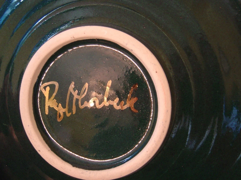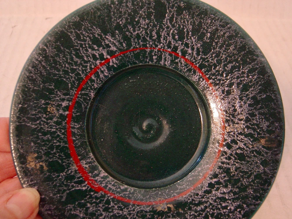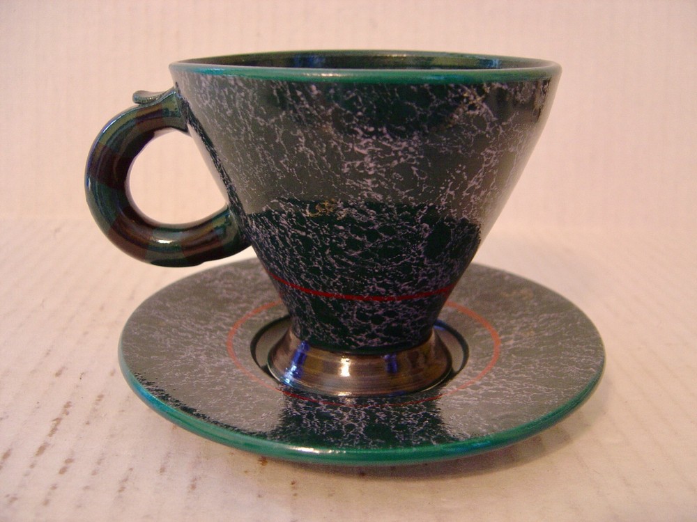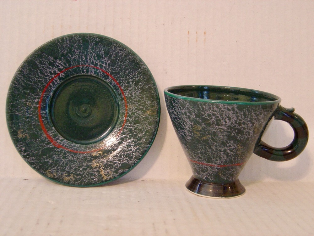 This is a very nice whimsical hand crafted studio pottery cup and saucer. They are a dark green and black textured glaze and trimmed in dark red. The cup is cone shaped with a striped handle. They are in excellent condition with no chips, cracks or crazing. The cup is 3-1/4" high and is 3-3/4" in diameter across the top. The saucer is 5-3/8" in diameter. The bottom is signed by the artist which I cannot make out. I am also listing other pieces by this artist that are not signed and would be happy to combine shipping.