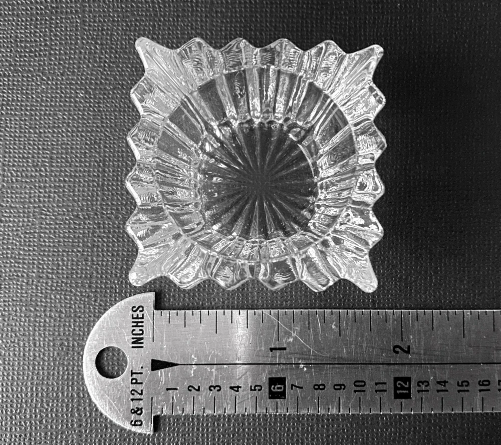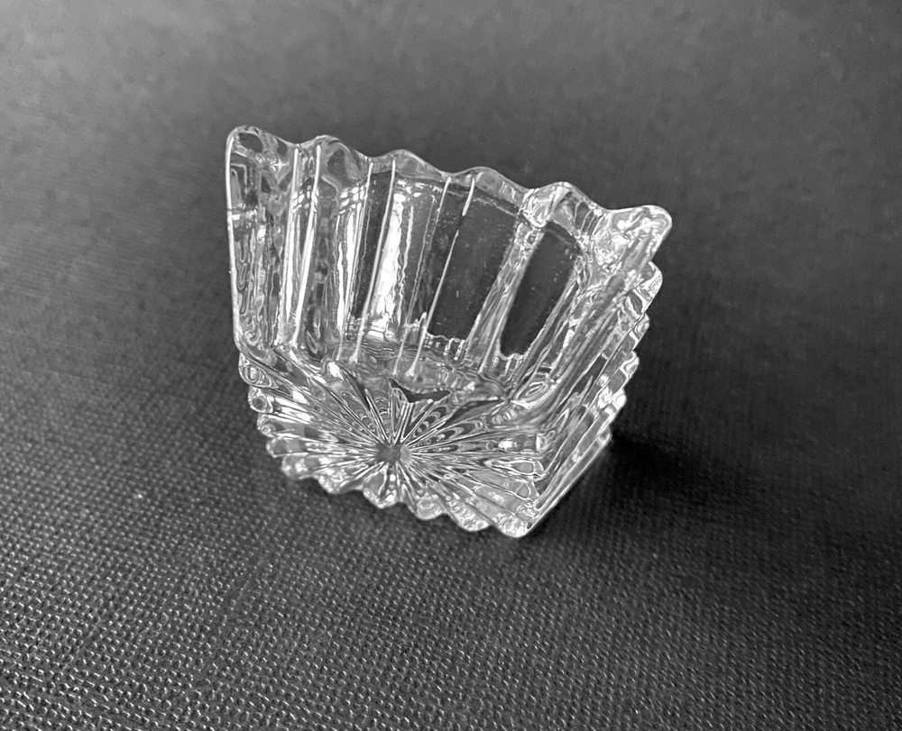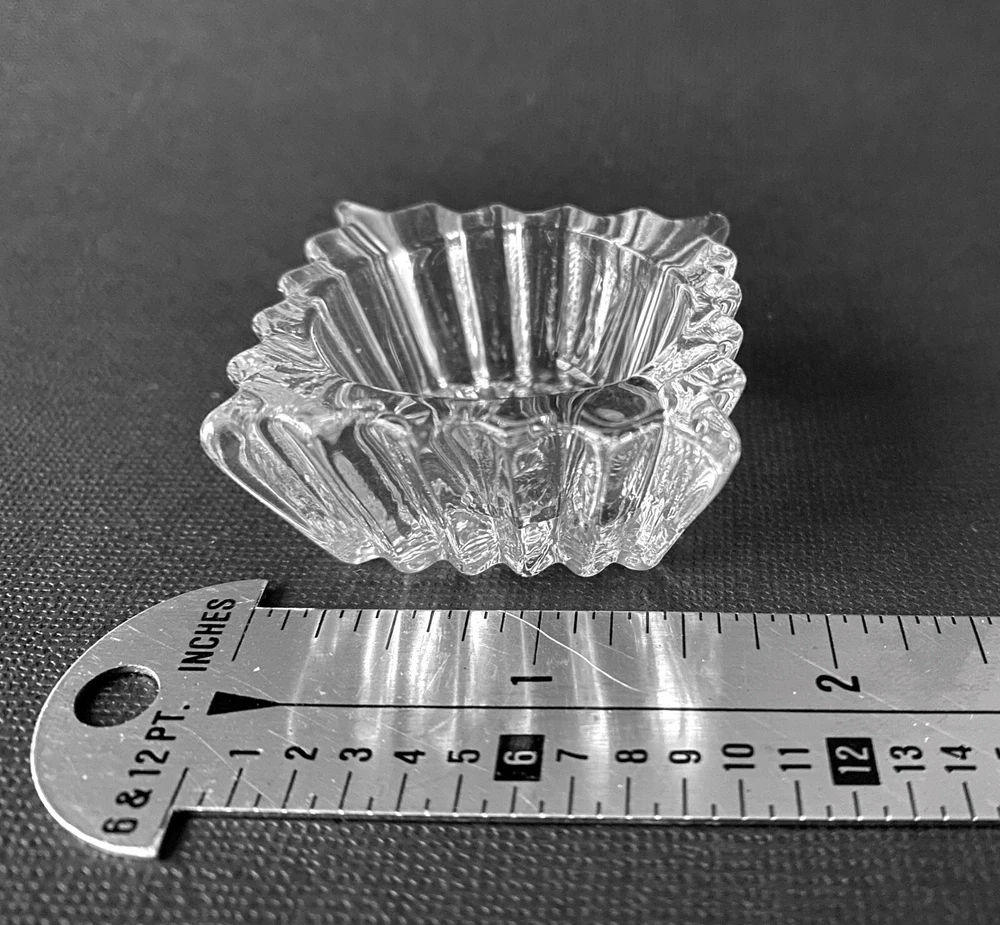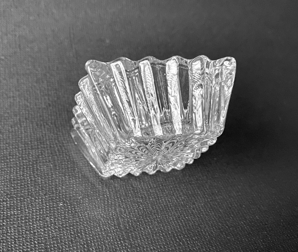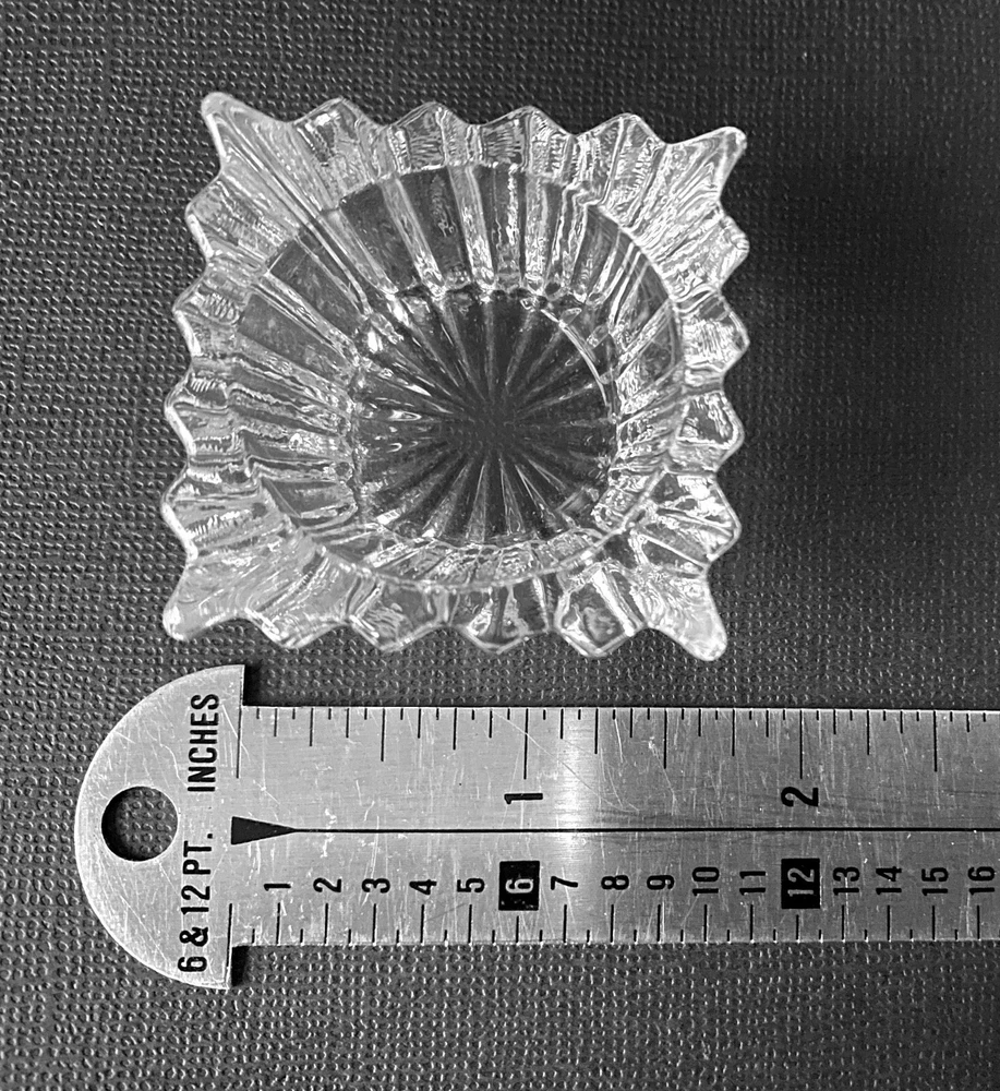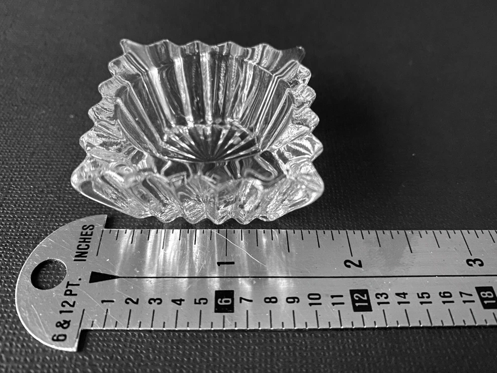 HEISEY #1469 RIDGELEIGH 1.75 INCH SQUARE INDIVIDUAL SALT DIP OR SALT CELLAR Manufacturer: 1936 - 1940 Heisey Glass, Inc. made in Crystal only. Very faint Heisey diamond "H" Heavy pressed ridge pattern Approximate size: 1.69" Square x 0.875" High Multiple item savings: If you wish to purchase more than one item from my store, place the item(s) in your cart and send me a request for an invoice for combined shipping.