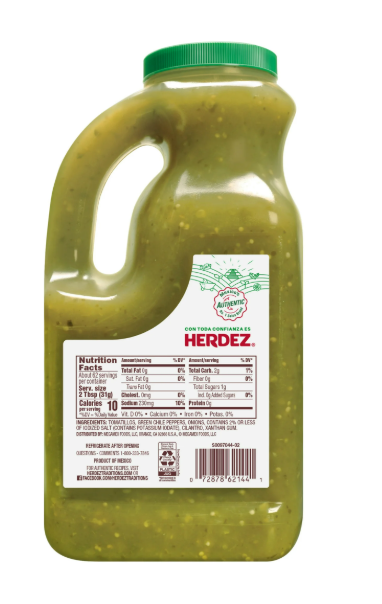 HERDEZ Salsa Verde Mild, Tortilla Chip Dip, Shelf Stable, Large 68 oz Plastic Jug About this item : Made with tomatillos and green chille this tangy salsa has a mild heat; Pair it with meat or make it your go-to dip for tortilla chips Mild heat level that's perfect combination of heat and flavor 10 calories per serving; Og trans fats per serving Deliciously complements chicken, pork, seafood, chilaquiles, garden salads and more; Make it a savory part of breakfast, lunch and dinner meal prep Includes one, large 68 oz plastic jug of HERDEZ Salsa Verde Mild; Packaged for freshness and great taste It's an ideal shelf-stable, pantry staple Product details : Dip into tangy, complex flavors and endless possibilities with HERDEZ Salsa Verde Mild. It’s the perfect blend of roasted tomatillos, jalapeño peppers, cilantro, and onions. Refreshing hints of citrus and herbal notes of cilantro turn up the taste on everything from fish tacos, vegetable wraps, chilaquiles, carnitas, garden salads, and even eggs. It's an ideal pantry staple that makes a tasty topping for snacks or entrees, and pairs perfectly with chips and guacamole. Serve it for taco night, party spreads, special occasions or any meal of the week. Includes one, large 68 oz plastic jug of HERDEZ Salsa Verde Mild. The HERDEZ Brand is the No.1 selling brand of salsa in Mexico. All trademarks, logos and images are owned by Hormel Foods Corporation, its subsidiaries and affiliates. Copyright MegaMex Foods, LLC.