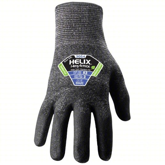 Product Details Brand HEXARMOR ANSI/ISEA Cut Level A3 ANSI/ISEA Abrasion Level 5 Knit Material Bamboo/Fiberglass/HPPE Thickness 13 ga Coating Texture Textured Cuff Style Knit Glove Coating Color Gray Knit Material Color Gray Includes Reinforced Thumb Crotch No Touchscreen Compatible No Silicone-Free Yes Coating Type Dipped Coating Material Nitrile Glove Coating Coverage Palm Double-Dipped No Size- Alpha 2XL Size- Numeric 11 Glove Hand Style Left and Right Glove Style Seamless Knit Additional Hazard Protection Abrasion-Resistant; Cut-Resistant; Puncture-Resistant ANSI/ISEA Cut Load 1,449 g Coating Coverage Palm and Fingertips FDA Compliant No EN 388 Rating 3X42C Standards ANSI/ISEA; EN388 Glove Construction Seamless Knit Hand Protection Style Glove Reflective Backing No ANSI/ISEA Abrasion Cycles 11,250 ANSI/ISEA Puncture Level 3 Lint-Free No Pairs per Package 1 Sold As Pair Glove Performance General Purpose Glove Liner Material HPPE Blend UNSPSC 0 Country of Origin Poland (subject to change) Product Description Light cut-level knit gloves with nitrile coating provide a good grip when handling oily workpieces. Light cut levels (ANSI A2-A3) protect against cuts from handling cardboard, light raw materials, and plastic. Nitrile resists abrasion, oils, and chemical splash and provides a secure grip when working with dry, greasy, and oily parts. It provides excellent abrasion resistance and good puncture resistance when handling blunt objects like burrs and dull wire.