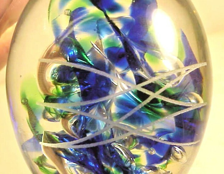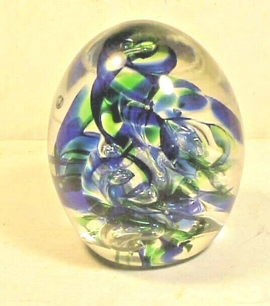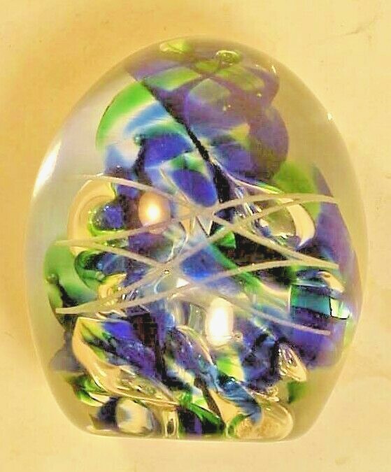 HG Studio Egg Shaped Art Glass Paperweight signed HG 2007 NOTE - there is no yellow tint to this item. Any yellow tint is caused by my photo lights. About 3" tall egg shaped art glass paperweight weighs 1 pound net. Like new condition with no chips, cracks or scratches. Buyer pays shipping on 2 lbs.. No International shipping. TERMS-PLEASE READ BEFORE YOU BID. EMAIL ANY QUESTIONS BEFORE YOU BID, I WILL ANSWER ASAP. I FOLLOW ALL EBAY RULES OF CONTACT AFTER THE SALE AND I EXPECT THE SAME FROM MY CUSTOMERS. Winners will be contacted with payment details within 24 hours of auction end