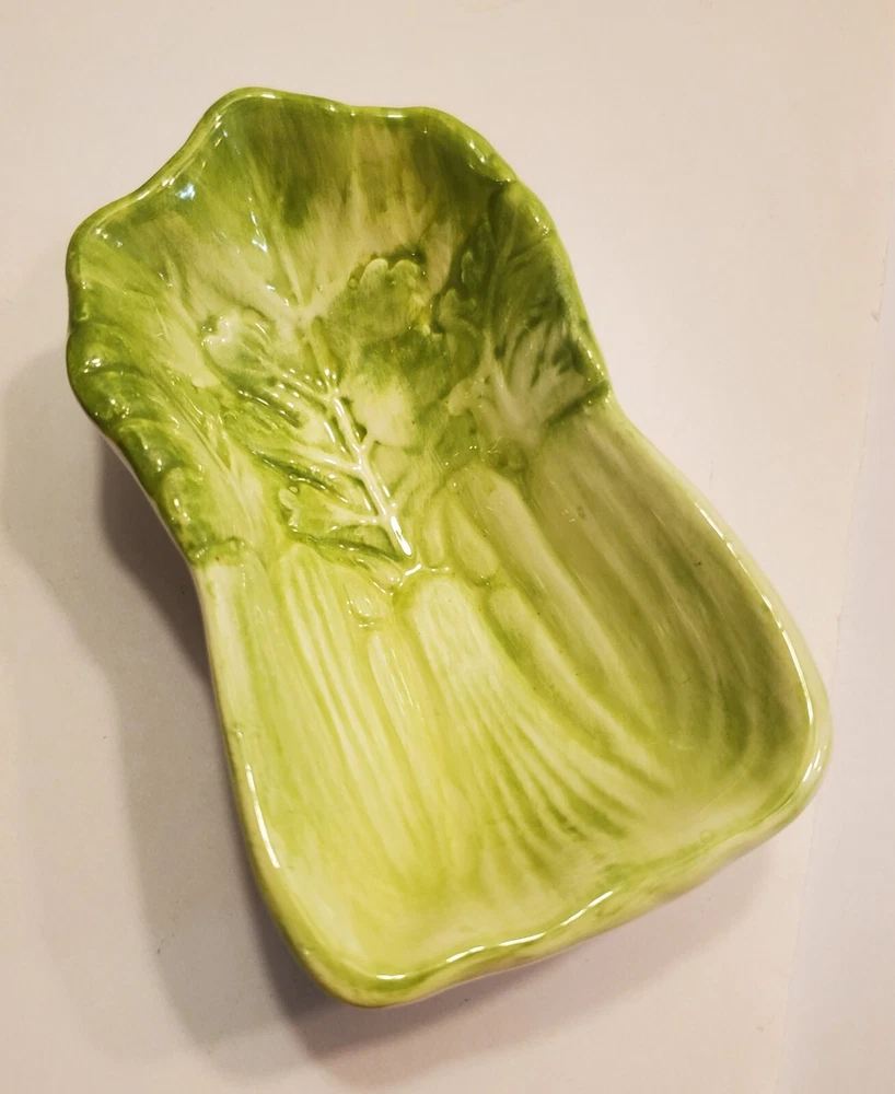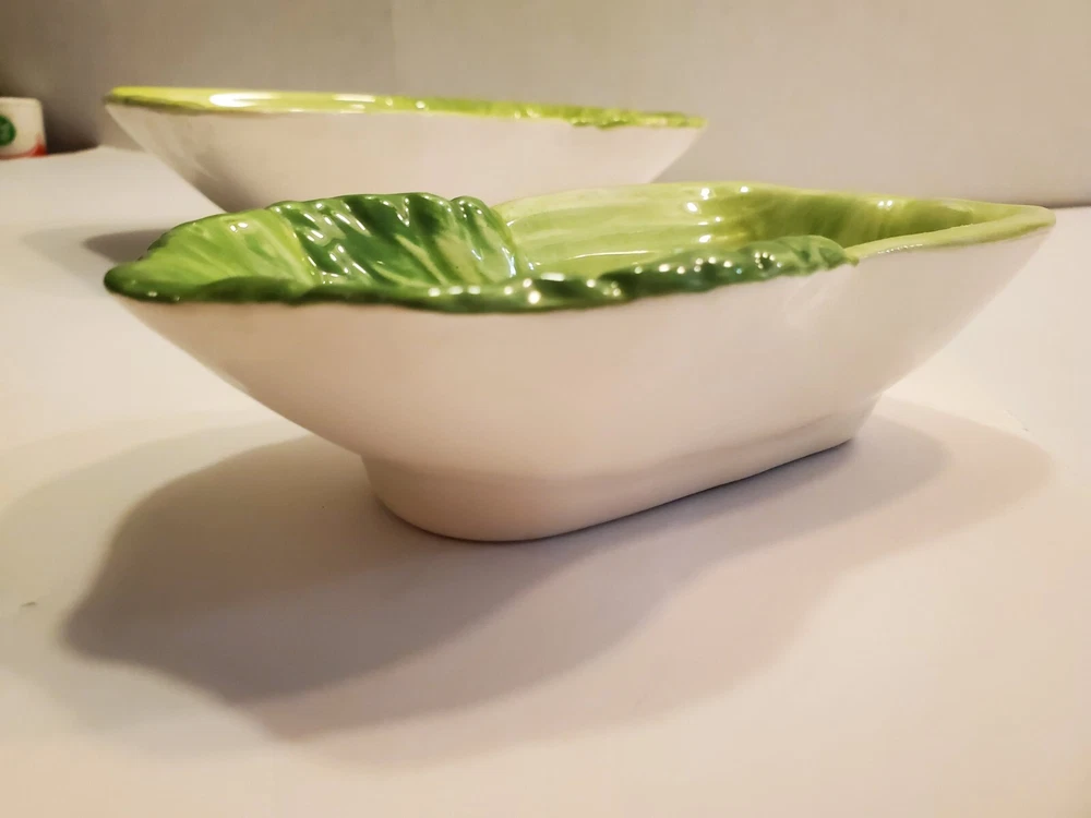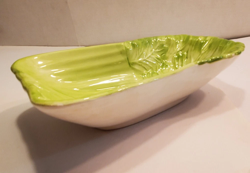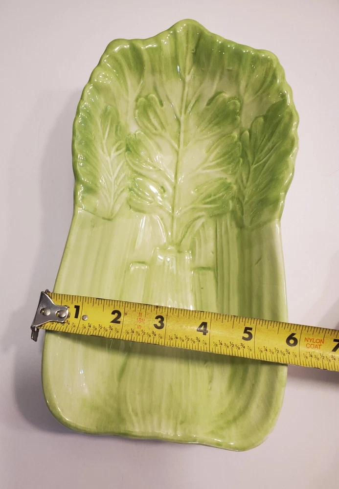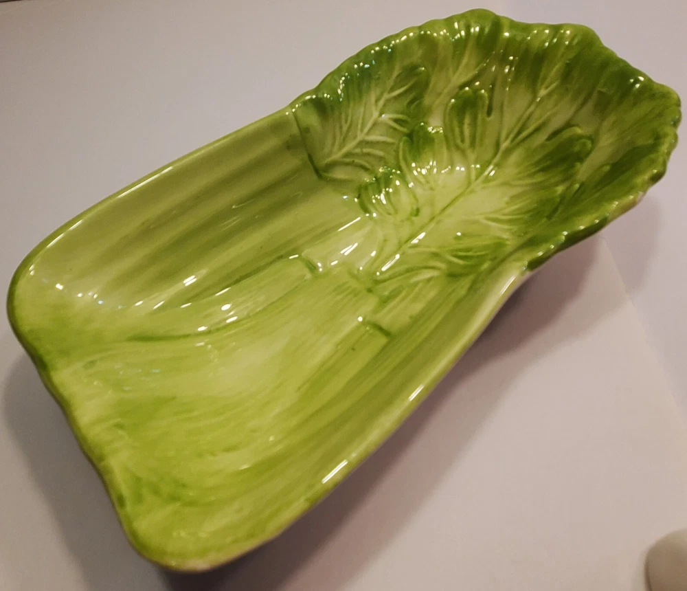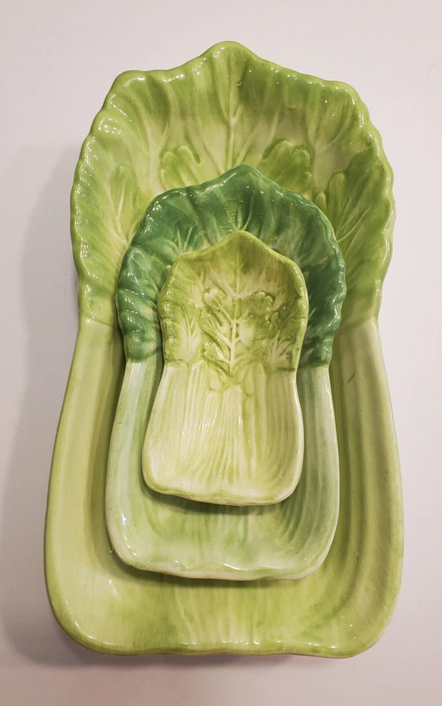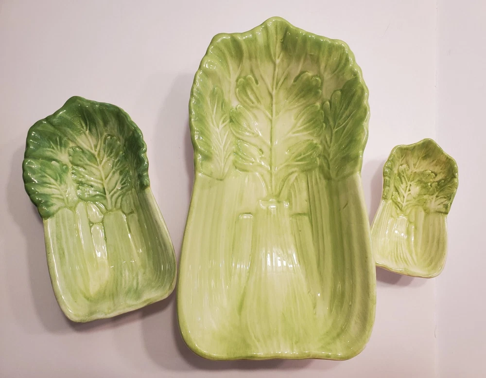 This three-piece set of HIMARK celery shaped bowls is a vintage addition to any collection. The glossy green bowls are stackable and decorative, perfect for all occasions. Made of ceramic art servware, they are original and studio crafted from China. Each bowl is oblong in shape and features a celery theme, making them a unique addition to any dinnerware collection. They are printed with a backstamp and were produced using the late 20th-century technique of studio crafted ceramics. These bowls are hand wash only and are perfect for serving your favorite dishes. ☆☆☆☆Clean and from a Smoke-free home.Please look closely at all of my photos to make sure that you like what you see and see exactly what you will be receiving. Photos are of the actual item that you will receive if you decide to purchase this from me. Any flaws noticed by the seller (including smoke, odors, large rips, tears, holes, stains, or noticeable repairs) will be noted in the item description. I do my best to look over the items and describe anything I think is noteworthy. However, I am human, and there may be something that I have overlooked. If you receive an item and it doesn't meet your expectations, please contact me prior to leaving feedback -- I will be happy to work something out with you!!!!! IF USPS IS SLOW PLEASE KNOW THAT THERE IS NOTHING I CAN DO ABOUT THAT AND IT IS OUT OF MY CONTROL. I DO NOT SET THE ESTIMATED DELIVERY TIME ON MY LISTING, IT IS DONE AUTOMATICALLY AND I DON'T THINK TO CHANGE WHATEVER POPS UP BECAUSE I USUALLY SHIP OUT AS QUICKLY AS I CAN ANYWAY! Thank you for looking at my listing and for taking the time to read this description. PLEASE Check out my other listings if you have time and don’t forget to hit the follow button so you can see everything I post, I would greatly appreciate it. THANK YOU VERY MUCH!💞😊