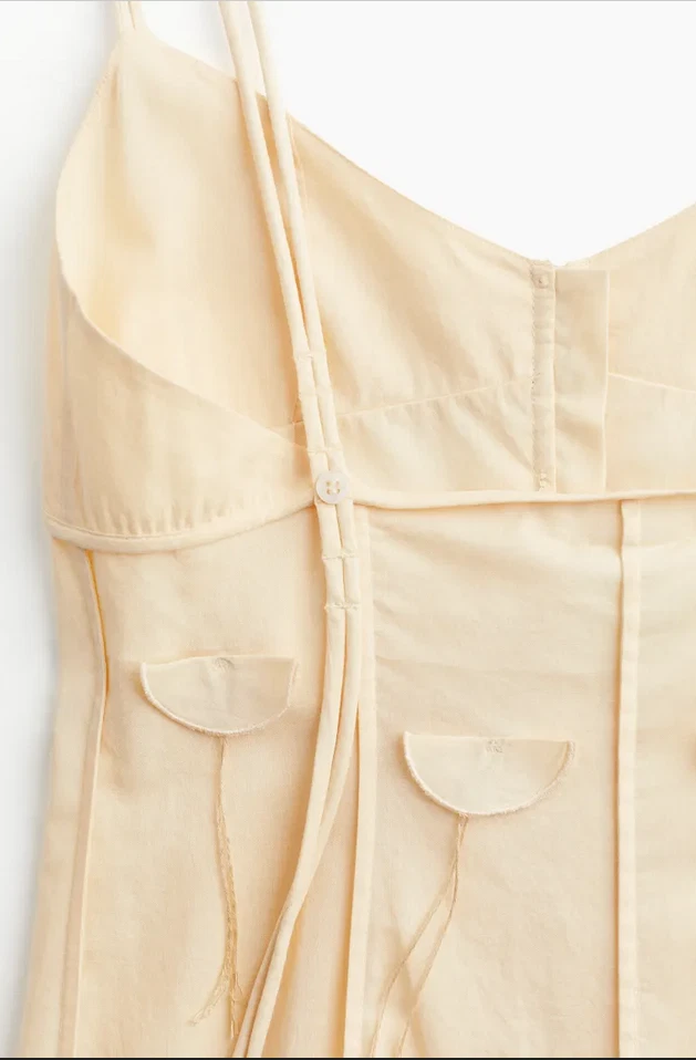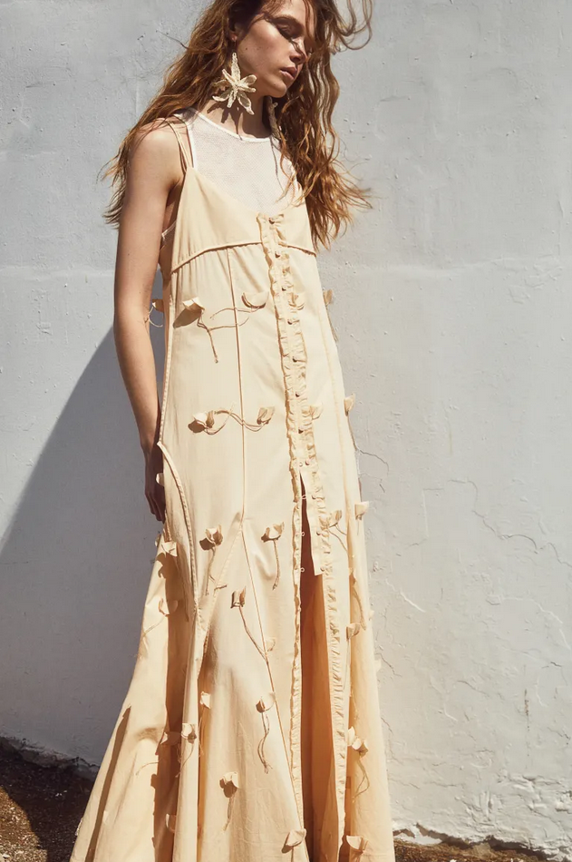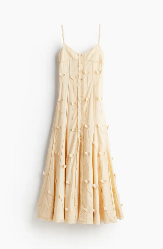 H&M Studio Collection Appliquéd button-front dress H&M Studio Collection New Arrival Studio Collection. Floor-sweeping dress in a soft cotton weave covered in intricate, irregular-shaped appliqués that create a striking effect. Sweetheart neckline, shaped, lined cups and pearly buttons down the front. Double spaghetti shoulder straps that are stitched at the front and have extended ends and adjustable buttoning at the back. Gently flared skirt with godet pleats for added width and movement. Double-layered hem with delicate, eyelash-stitch trims. Unlined for a lightweight feel. Article number: 1227110001 Size: XS: Width: 73 cm, Length: 1.05 m S: Width: 81 cm, Length: 1.06 m M: Width: 89 cm, Length: 1.07 m L: Width: 97 cm, Length: 1.08 m XL: Width: 1.09 m, Length: 1.09 m Length: Long Sleeve Length: Sleeveless Fit: Regular fit Style: Flared, Strappy dress Neckline: Sweetheart neckline Description: Light beige, Solid colour Collection: H&M Studio Collection Country of production: India Common generic name: Dress Net Quantity: 1 N Manufactured by: RADNIK EXPORTS GLOBAL PVT LIMITED E2, Sector 59, Noida, Gautam Buddha, NAGAR, 201301, Noida Marketed by: H&M Hennes & Mauritz Retail Pvt. Ltd. A-wing, D-3, 2nd Floor District Centre Saket New Delhi - 110017 India Date of manufacture: 05-2024 Composition Cotton 100% Material: Cotton Materials in this product explained Cotton Cotton is a soft and versatile natural fibre harvested from the cotton plant. SHIPPING FREE FAST FEDEX 10 TO 14 WORKINGDAYS