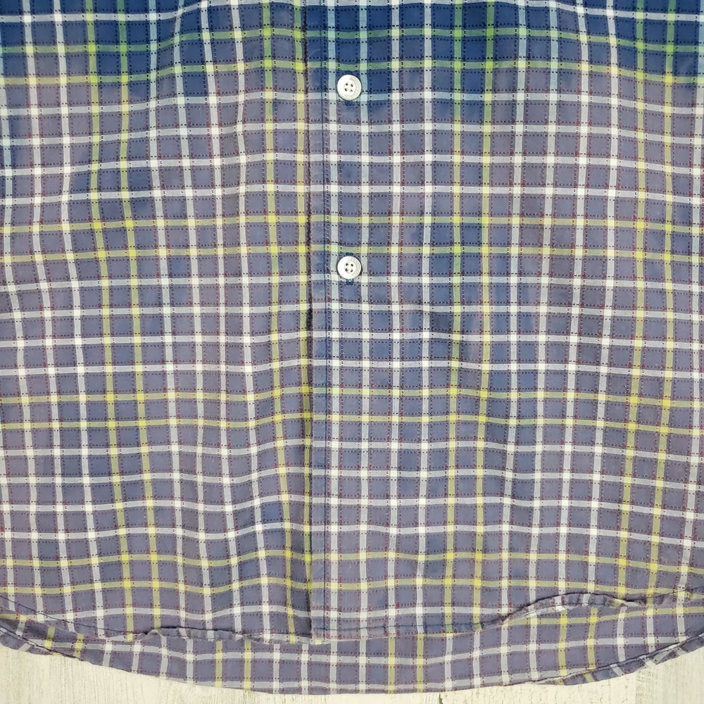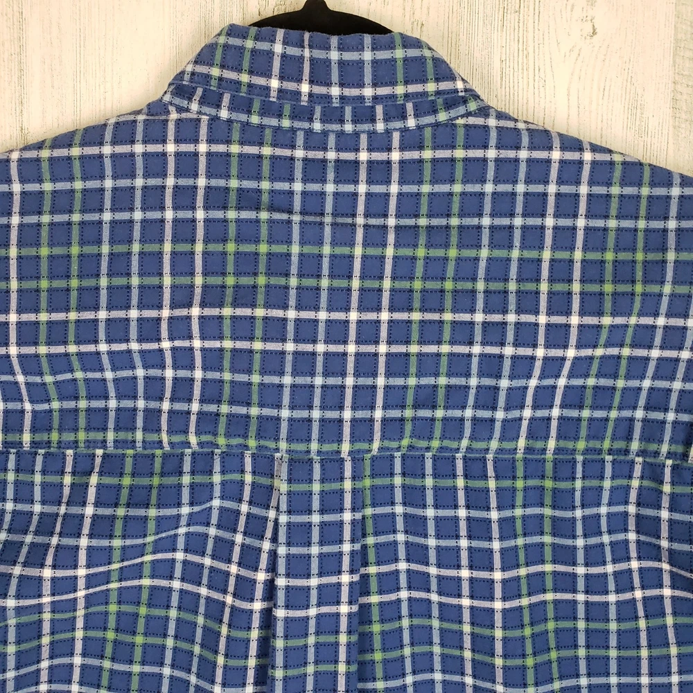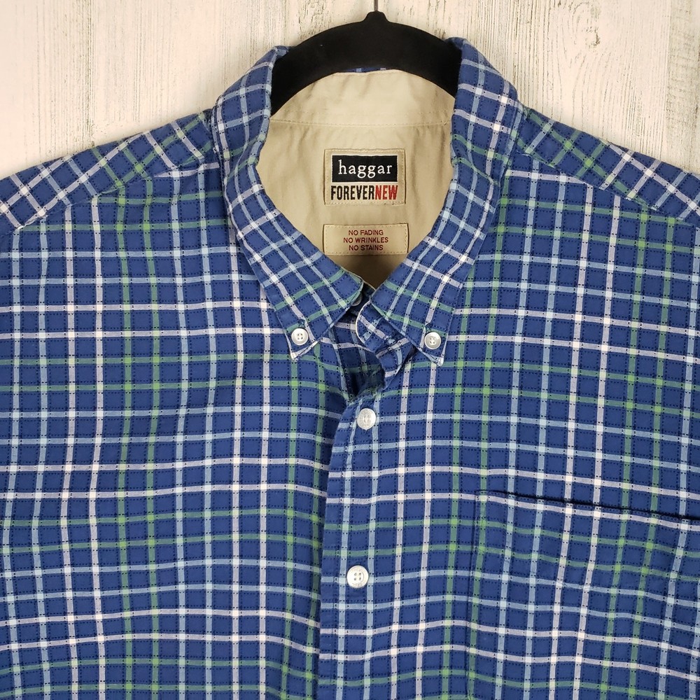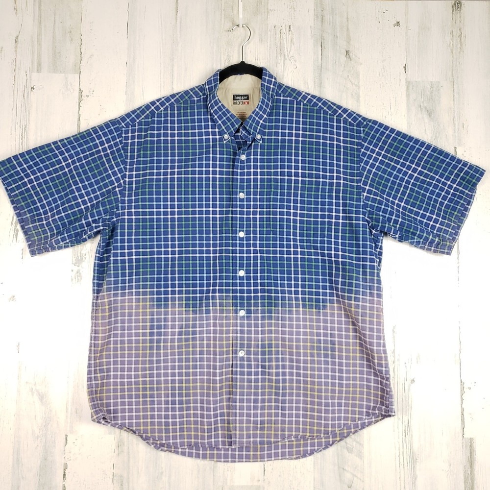 <![CDATA[<div>Haggar Forever New Dip Dye Short Sleeve Button Down Shirt Men’s Size XL Bleach ombre dip style tie dye Blue, green, white & black plaid Button front closure Short sleeve Collared Chest pocket No fading – no wrinkles – no stains Excellent condition 100% Cotton Chest: 27” Length: 31” Sleeve: 10.75” AP-1210