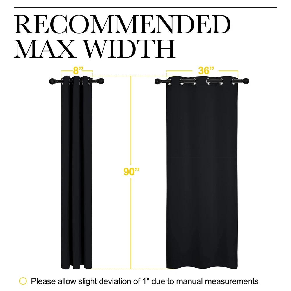 Blackout Curtains are so much more than just bits and pieces of fabric that are sewn together to prevent sunlight from entering your home, they go beyond that mundane function and provide additional benefits that do not meet the eye instantly. Light Blocking Energy Savers. Having the heavy, multi-layered microfiber blackout window curtains or drapes can make a world of a difference in reducing the amount of light that comes in from outside, which has green-conscious consumers excited about investing them as energy-efficient window treatments. A home insulated and remains warmer in wintertime relieves the strain on home heating and reduces 25 percent energy budget at most. Sleep Soother n Noise Buffer. It's hard to get babies to take a rest during the day when the sun is streaming brightly through a bedroom window. Blackout curtains encourage the best possible sleep and most comfortable setting for day sleepers and the ones who have trouble falling asleep, by automatically darkening and lowering noise levels. Absolute Privacy n Relax. Not only that but also make your resting zone truly blissful. They would be perfect for any home theater and supply you with the enjoyment of watching TV in real darkness. If you are looking for great and cost-effective ways of re-inventing the look of your home, readymade curtains would be the game changer in your shopping cart. They are crafted for the topmost and luxury, coming with the strong grommet ring top for easy installation and smooth sliding over a rod. Each curtain panel is carefully ironed and ready to serve as your window dressing. What color do you like? READY MADE: Set includes 2 BLACKOUT CURTAINS PANELS of 42" wide x 90" length with 6 grommets top each. 1.6-inch inner diameter ring fits easily with standard curtain rods. Quality fabric without liner feels soft and heavy. SERVE WELL: Curtains impede 85%-99% light and UV rays(Dark color curtains work well). Noise-reducing, better TV viewing thanks to the innovative triple weave technology. Thread trimmed and wrinkle-free, both sides are the same color. ENERGY SMART: Triple weave blackout fabric balances room temperature by insulating against summer heat and winter chill. Protect your furniture, floors, and artwork from the ravages of the sun, the drapes will pay for themselves off over time. WIDE COMPATIBILITY: Perfect fora late sleeper, shift workers, seniors, children, infants, students, computer operators. Curtains puddle on the floor, offering your room an elegant look. EASY TO MAINTAIN: blackout curtains are made to last. Machine washable in cold water, tumble dry. Quick ironing or steam clean when needed. Visiting the store, find out your favorite curtains.