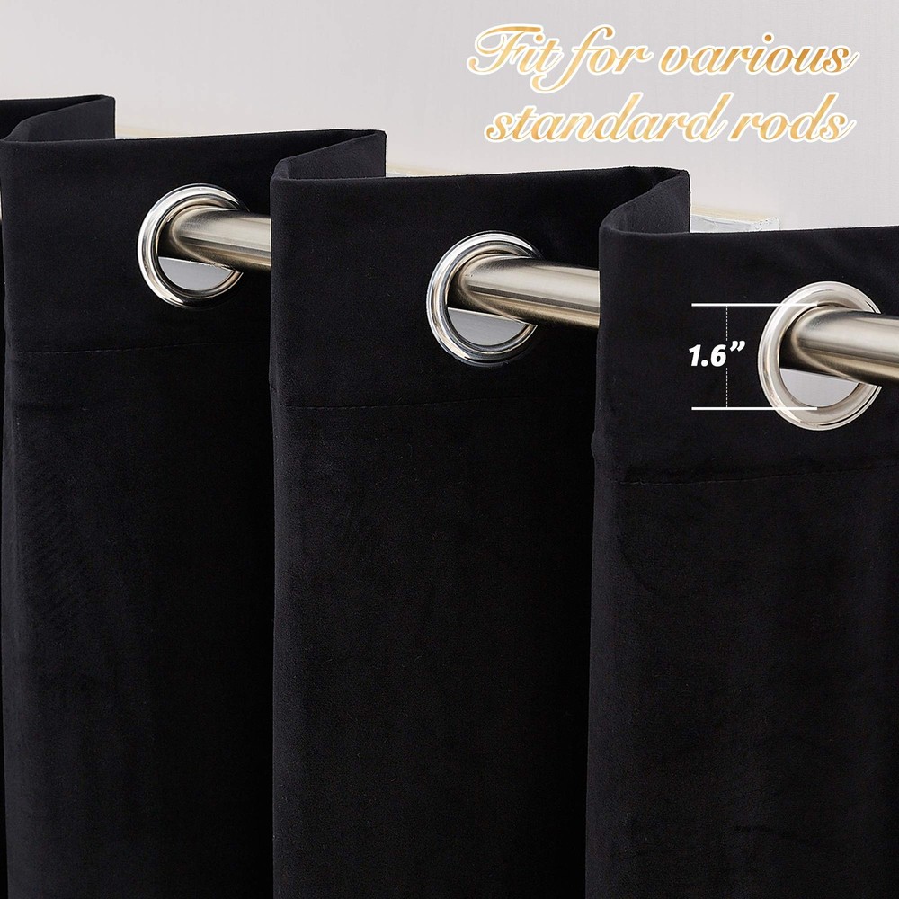 Ready Made: Package includes a pair of panels of W52"x L84"(132cm x 213cm) each | W104"x L84"(264cm x 213cm) in total. The design of silver grommet (1.6 inch inner diameter) creates casual elegance for your house, which makes the curtains easy to install and slide. Velvet Fabric: Smooth, soft, and drapey velvet curtains offer a delightful tactile experience. The texture of the fabric lending the curtains a beautiful light-catching quality, which creates a cozy and luxurious ambiance in any room, elevating its overall aesthetic. Light Dimming: The curtains with dense fabric are capable of blocking 65% to 90% of natural light, effectively shielding the room from harmful UV rays. The darker color has better blackout effect. For 100% blackout shading, add the curtain liners(ASIN: B01KX24LVRC). More Advantages: Velvet curtains offer noise reduction, thermal insulated, and privacy protection. The dense fabric help to reduce external noise and regulate indoor temperature, creating a peaceful and cosy environment. They provide maximum privacy, protecting your personal space. Easy Care: Good quality finishing will withstand years of use. Machine washable and Wash the water temperature below 110℉. Mild detergent no bleaching. Quick ironing when needed. Please be free to contact us if you have any question with our products.