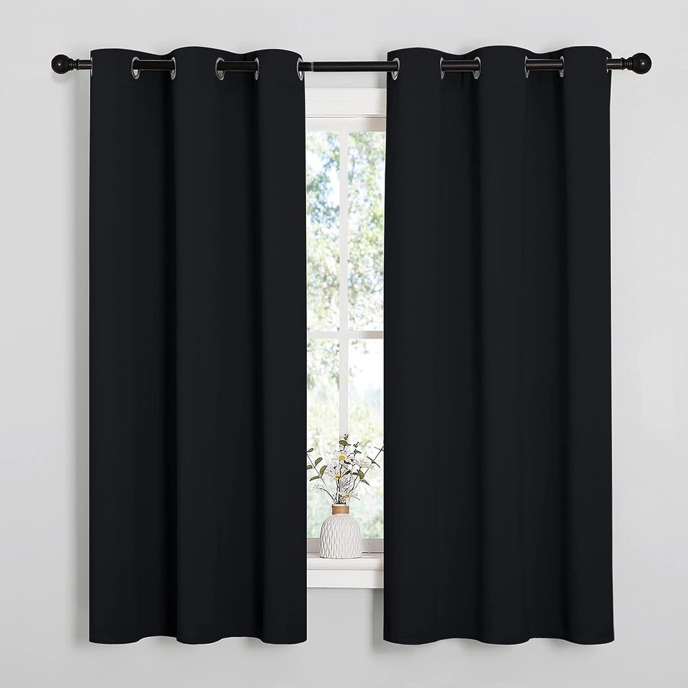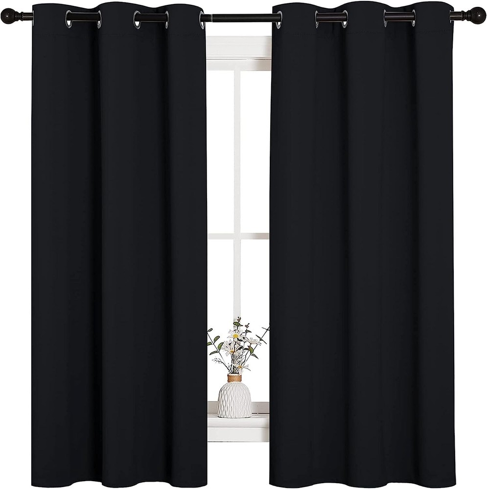 Brand NICETOWN Color Black Material Polyester, Polyester Blend Product Dimensions 63"L x 42"W Opacity Blackout Polyester Imported curtains READY MADE: Set includes 2 BLACKOUT CURTAINS PANELS of 42" wide x 63" length with 6 grommets top each. Quality fabric without liner feels soft and heavy. SERVE WELL: Curtains impede 85%-99% light and UV rays(Dark color curtains work well). Noise-reducing, better TV viewing thanks to the innovative triple weave technology. ENERGY SMART: Triple weave blackout fabric balances room temperature by insulating against summer heat and winter chill. Protect your furniture, floors, and artwork from the ravages of the sun, the drapes will pay for themselves off over time. BRAND NEW ITEM FAST SHIPPING