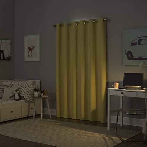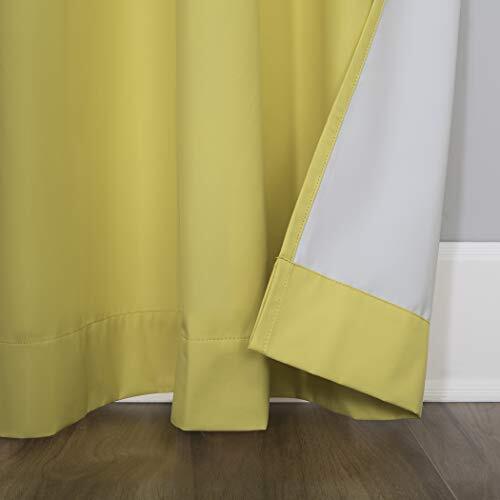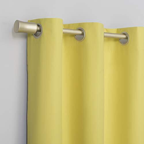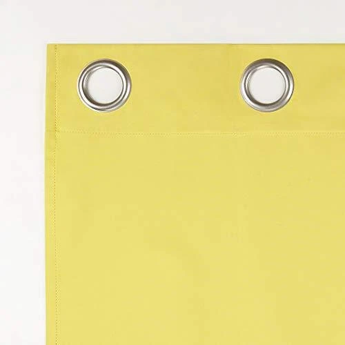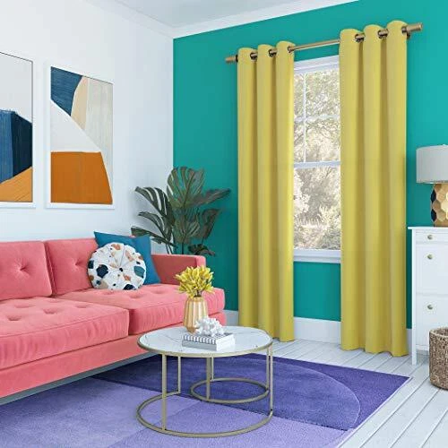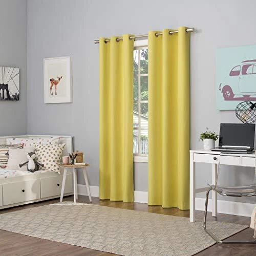 Halton Bright Vibes 100% Blackout Grommet Curtain Panels add a bright, fun pop of color to a bedroom, playroom, or any room of your home. Total Blackout technology is laboratory tested to block out 100% of light, reduce outside noise by up to 35%, and decrease energy lost through your windows by up to 35%. Comfort is optimized with thermal insulation that helps keep summer heat and winter chill out of your home. Equipped with built-in metal grommets for easy hanging on standard curtain rods up to 1.5" in diameter. Hang in your entertainment room to eliminate screen glare and reduce distracting outside noise, or in your bedroom for enhanced privacy and a sounder, more uninterrupted sleep. Sold as individual panels measuring 40" width by 84" length in color sunflower yellow. Measure carefully before selecting your desired size and quantity. Rod not included. Machine wash cold on gentle cycle. Use non-chlorine bleach when needed. Tumble dry on low heat, using a cool iron as needed. Block out 100% of outside light with a bright, fun pop of color in a bedroom, playroom, or any room of your home Thermal insulation helps keep summer heat and winter chill out of your home Energy efficient design reduces energy lost through your windows by up to 35% Noise reduction up to 35% helps you get a sounder, more uninterrupted sleep Built-in metal grommets fit curtain rods up to 1.5" in diameter Each panel sold separately. (Image features 2 panels)