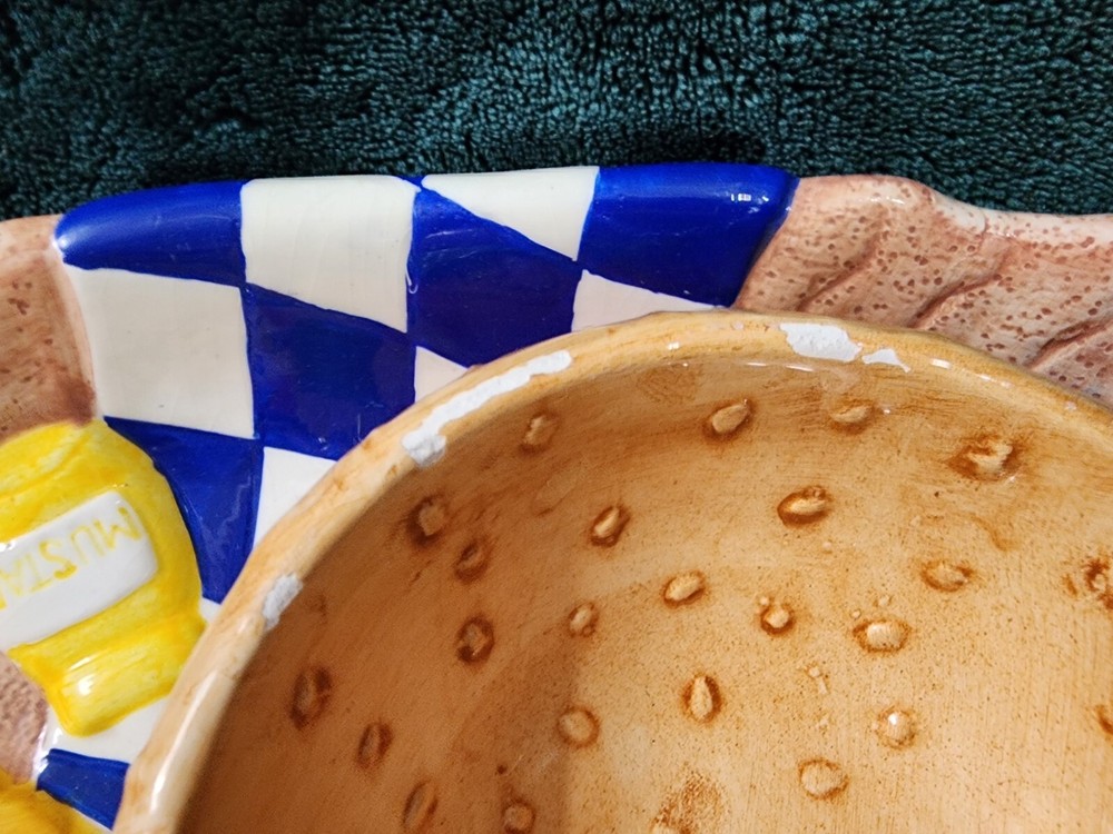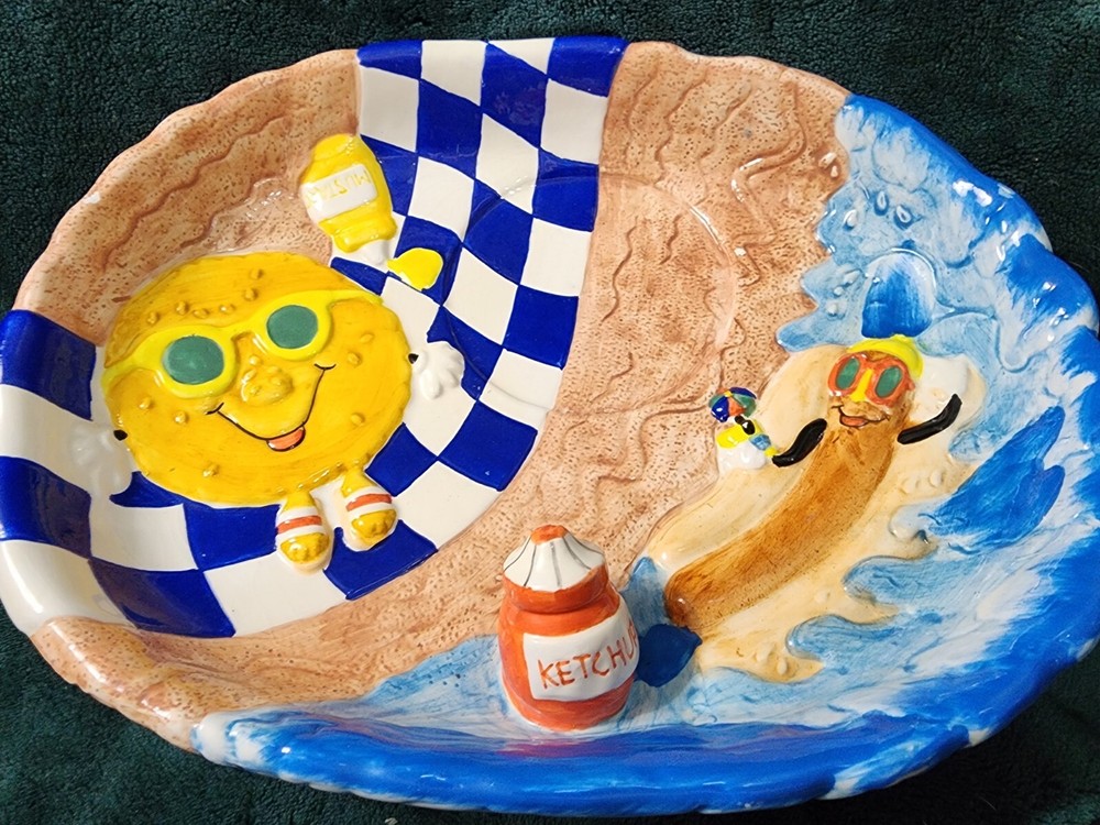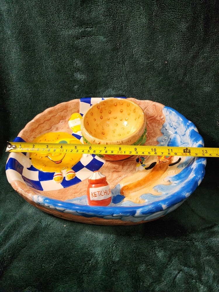 This product is a large, hand-painted ceramic serving tray with two compartments in a novelty beach-themed design. It features a hamburger, hot dog, and chip dip bowl, making it perfect for summer fun and entertaining. The brand is Cardinal, Inc. and the finish is painted.