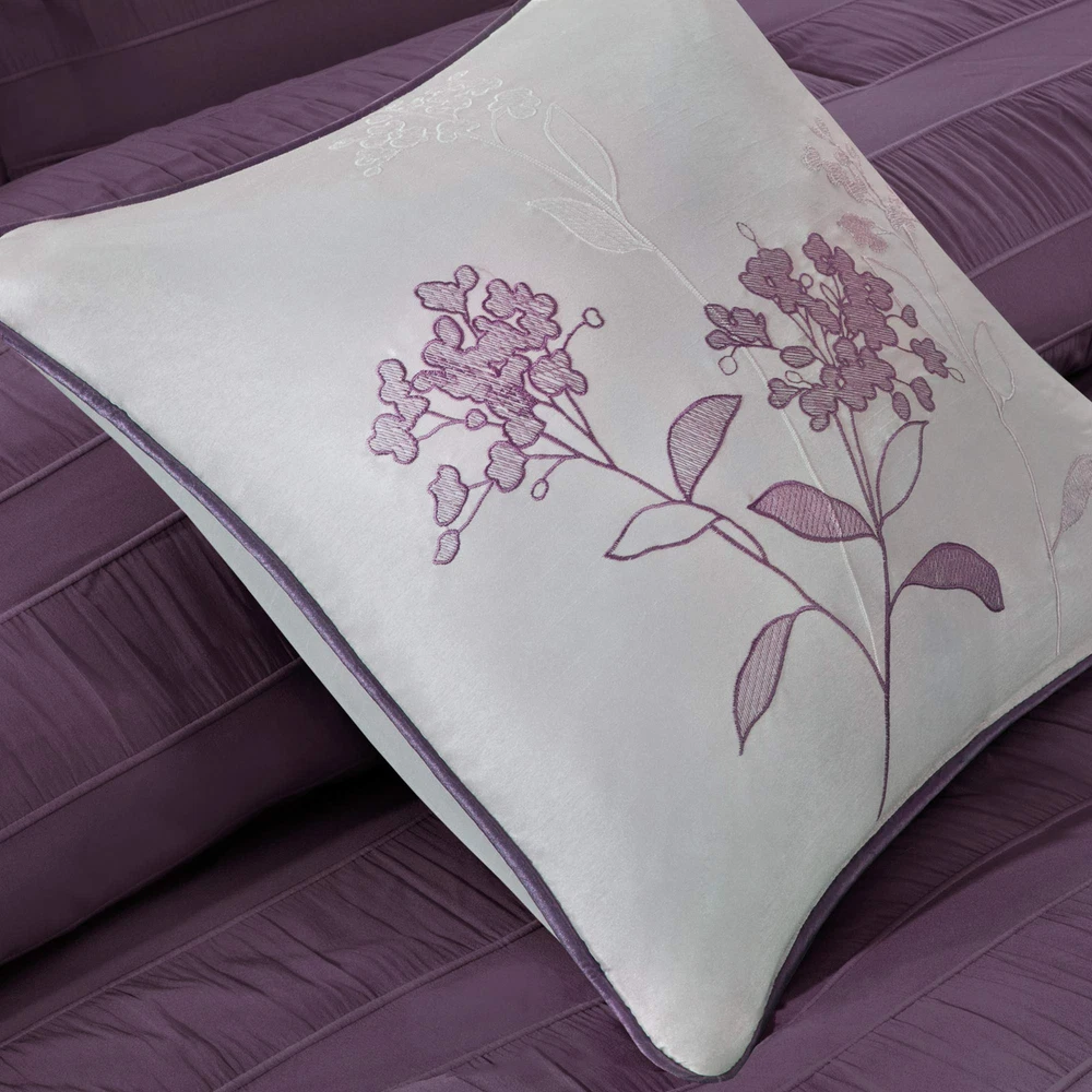 The Hampton Collection adds dimension with the use of fabric manipulation. This unique polyester jacquard fabric has a wrinkle feature that is used in a striped fashion horizontally across the comforter and shams. The Hampton Collection adds dimension with the use of fabric manipulation. This unique polyester jacquard fabric has a wrinkle feature that is used in a striped fashion horizontally across the comforter and shams. Three decorative pillows top of bed fabrics complete this cohesive look. Set includes: 1 Comforter: 90"W x 90"L, 2 Standard Shams: 20"W x 26"L, 1 Bed Skirt: 60"W x 80"L + 15"D, 3 Decorative Pillows: 18"W x 18"L/16"W x 16"L/12"W x 18"L Care instructions: Machine wash cold, gentle cycle, and separately. Do not bleach. tumble dry low, remove promptly. Do not iron. If there is no free movement in the washer or dryer, use large capacity commercial washer/dryer.