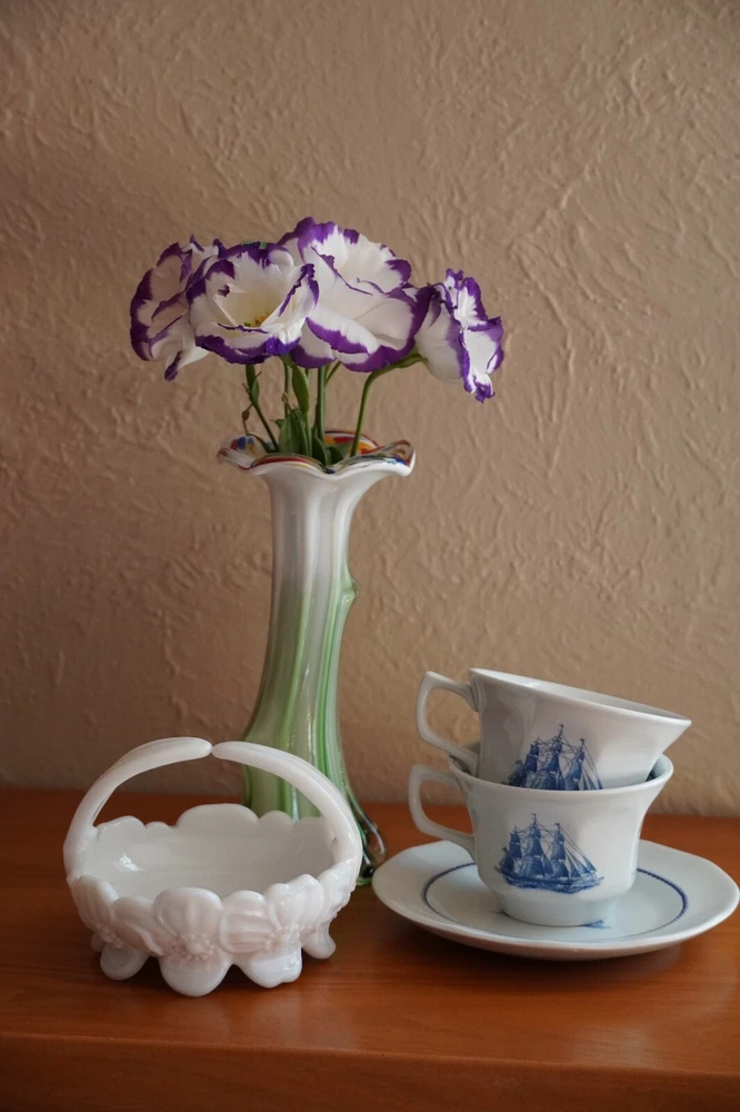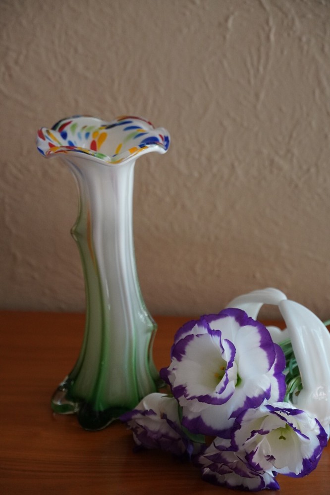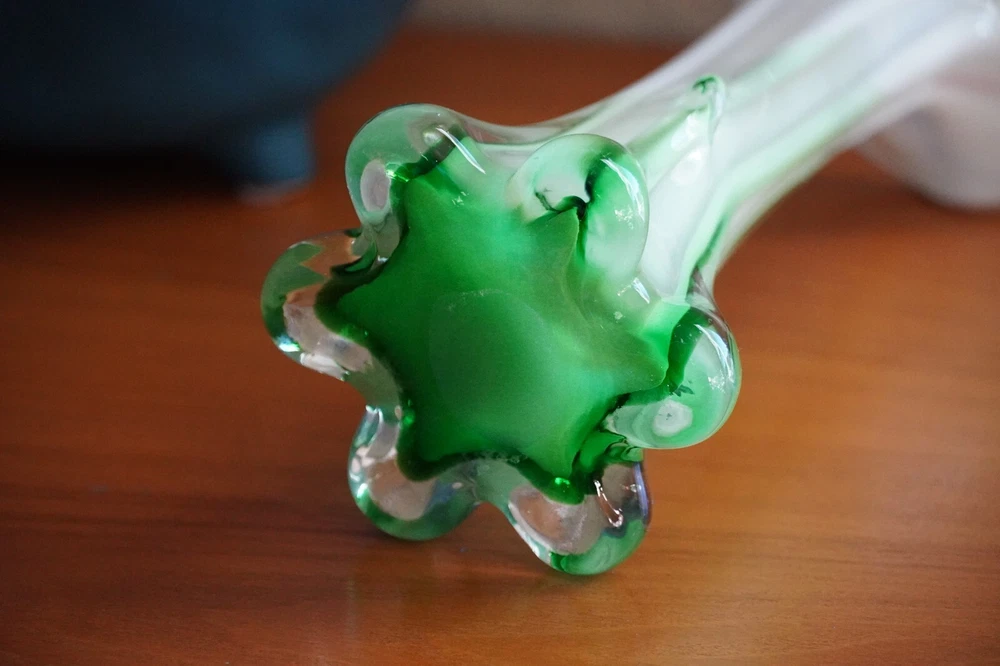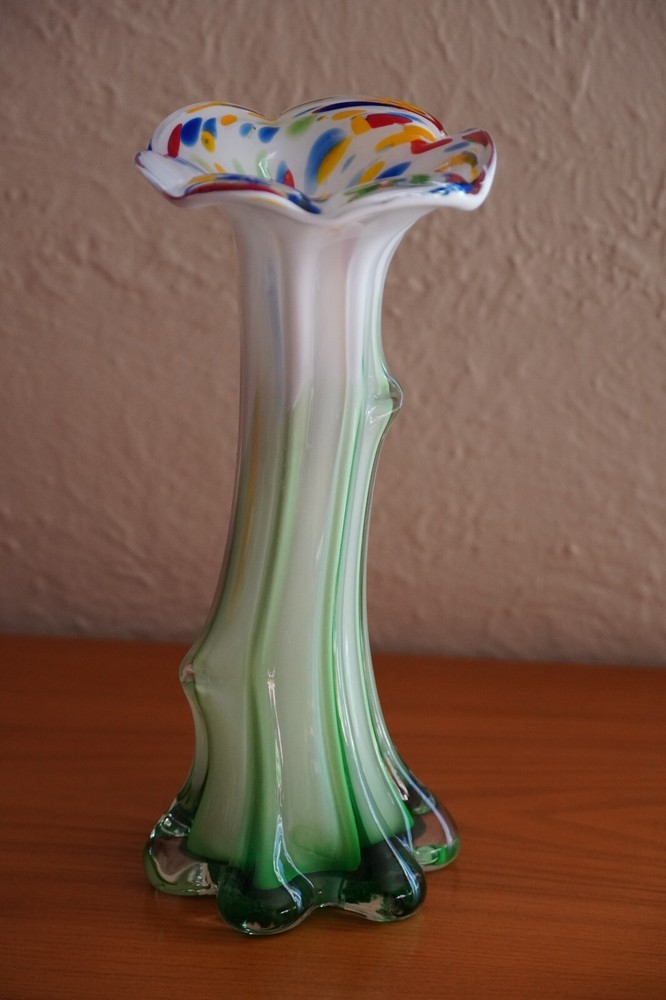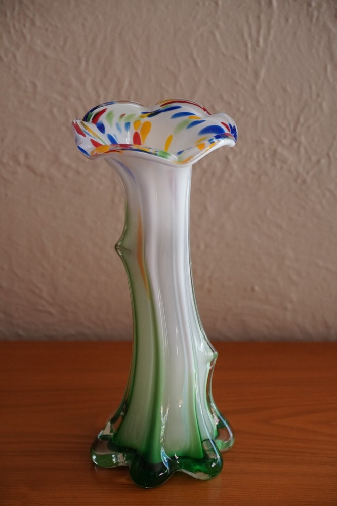 Add a touch of elegance to your home decor with this pretty vintage hand-blown glass vase featuring a beautiful flower shape in vibrant shades of green, red, yellow, and blue, making it a perfect decorative piece for any room. Crafted from high-quality glass material, this 8" vase is durable and steady. The handmade production technique ensures unique and original pieces. Other items in the pictures may be listed for sale. To see all of my listings, click here: multipli-city-bazaar