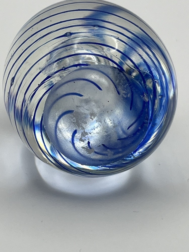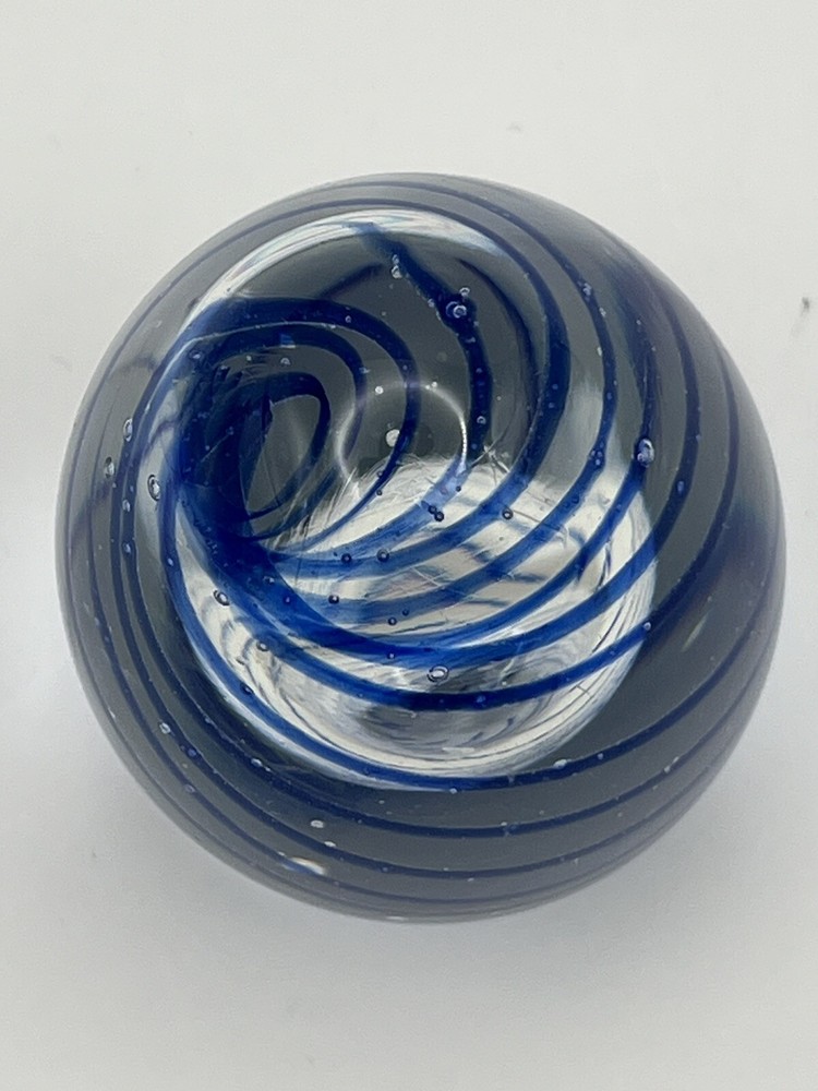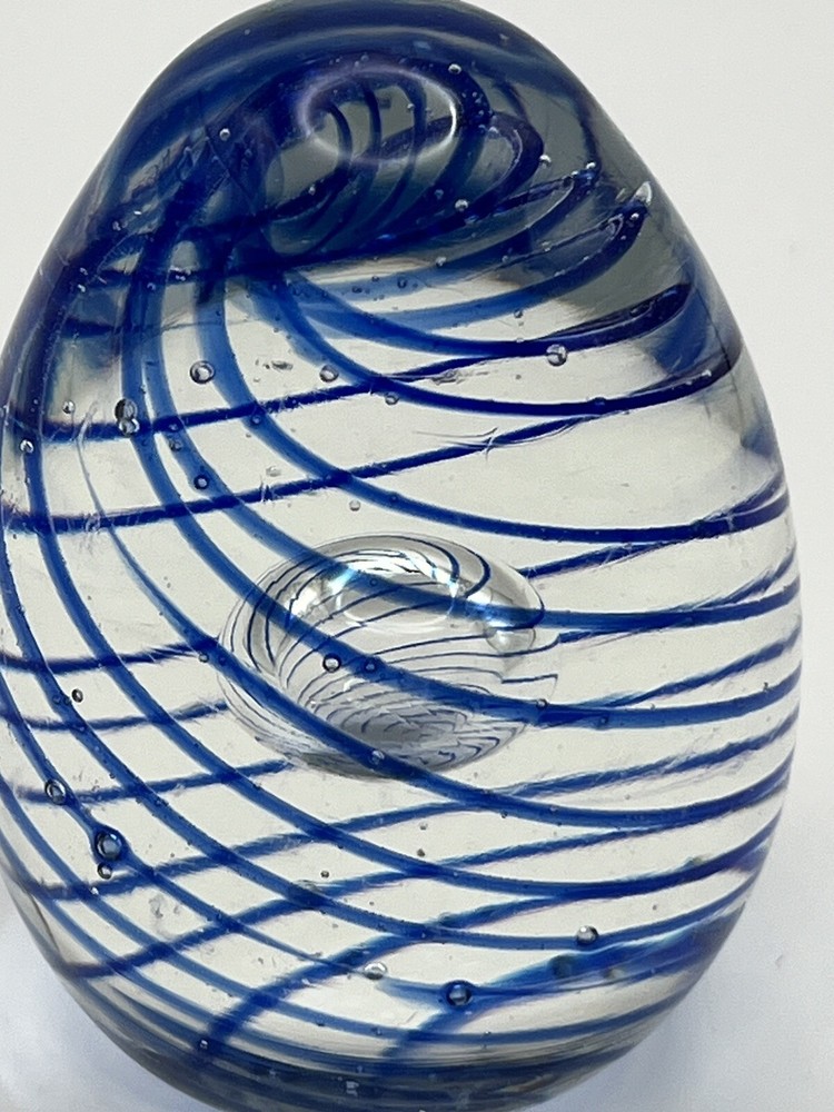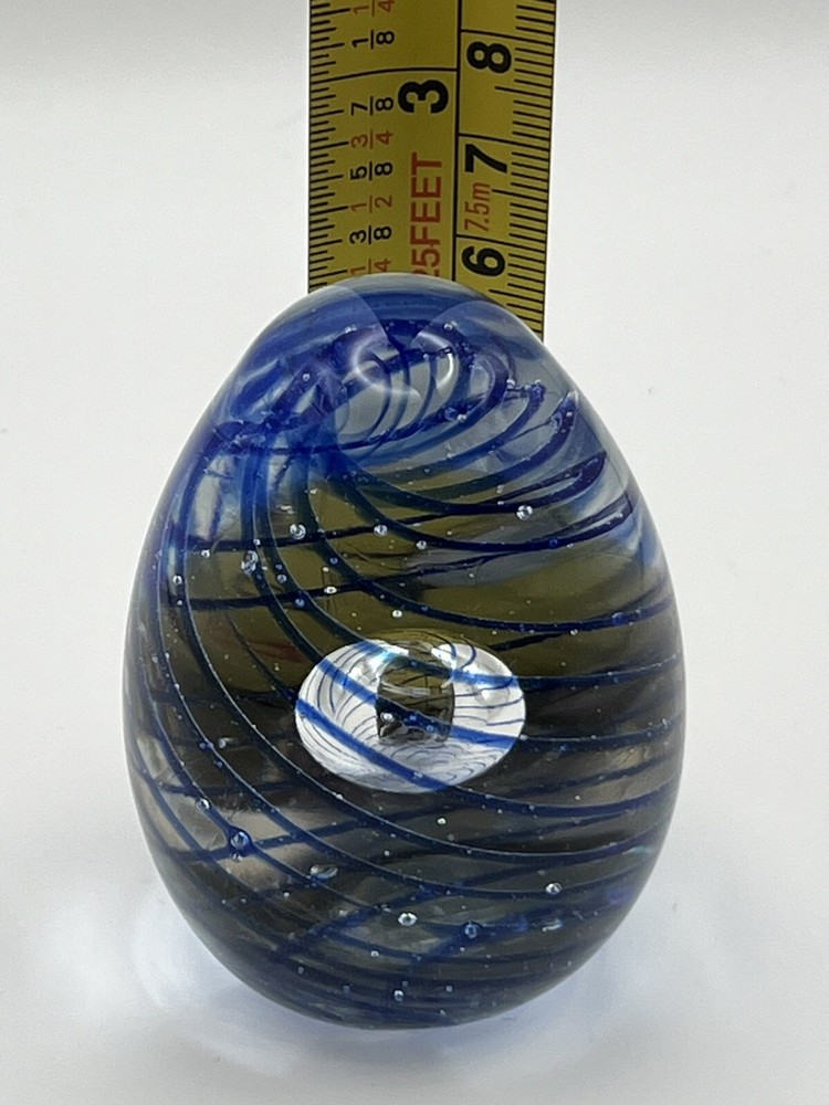 This beautiful egg-shaped paperweight is a perfect addition to your collection. The unique blue swirl pattern is hand-blown with a glossy finish. Featuring a controlled bubble, this art glass paperweight is handmade with precision and is of studio quality. The brand and country of origin are unknown, but the quality and craftsmanship speak for themselves. This paperweight is not just a decorative item, but also a functional one that can hold down papers on your desk or be displayed on a shelf. Add this one-of-a-kind piece to your collection today! Please check out my other listings for more treasures. Thank you and happy shopping!!