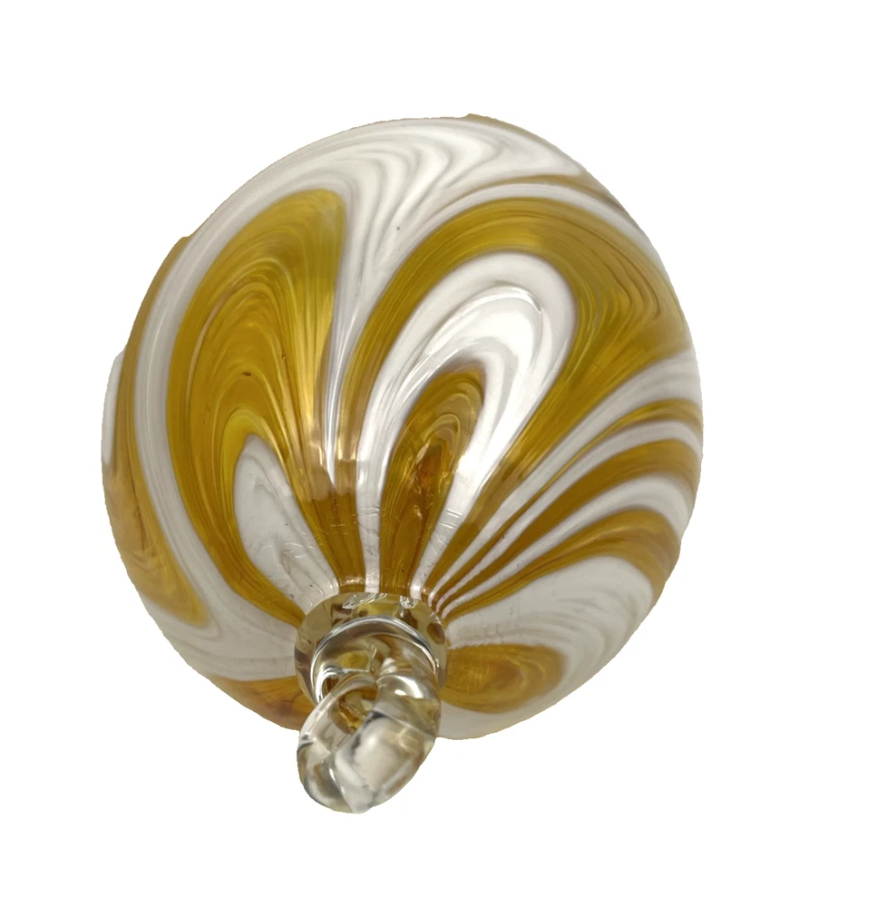 Absolutely stunning piece! The vibrant yellow swirls catch the sunlight beautifully, creating a gorgeous glow in any room. The hand-blown craftsmanship is evident—such delicate details and a nice weight to it. Perfect for adding a pop of color near a window. Even in used condition, it looks flawless. Lightweight yet feels high-quality. Very happy with this unique find!