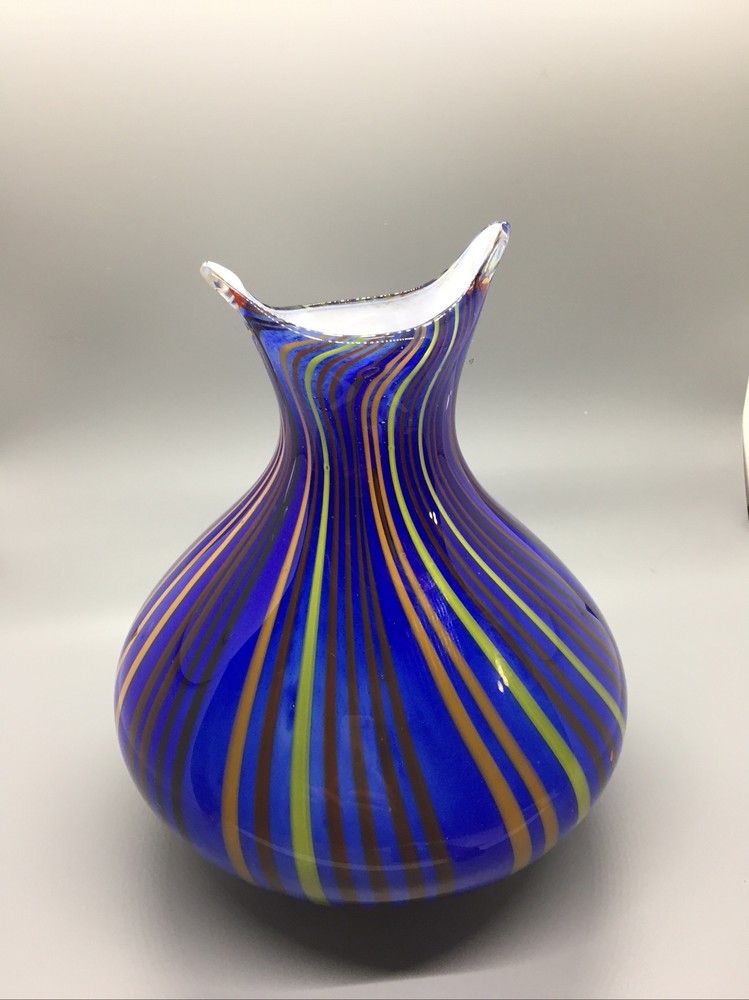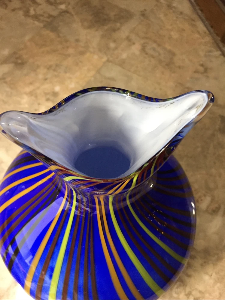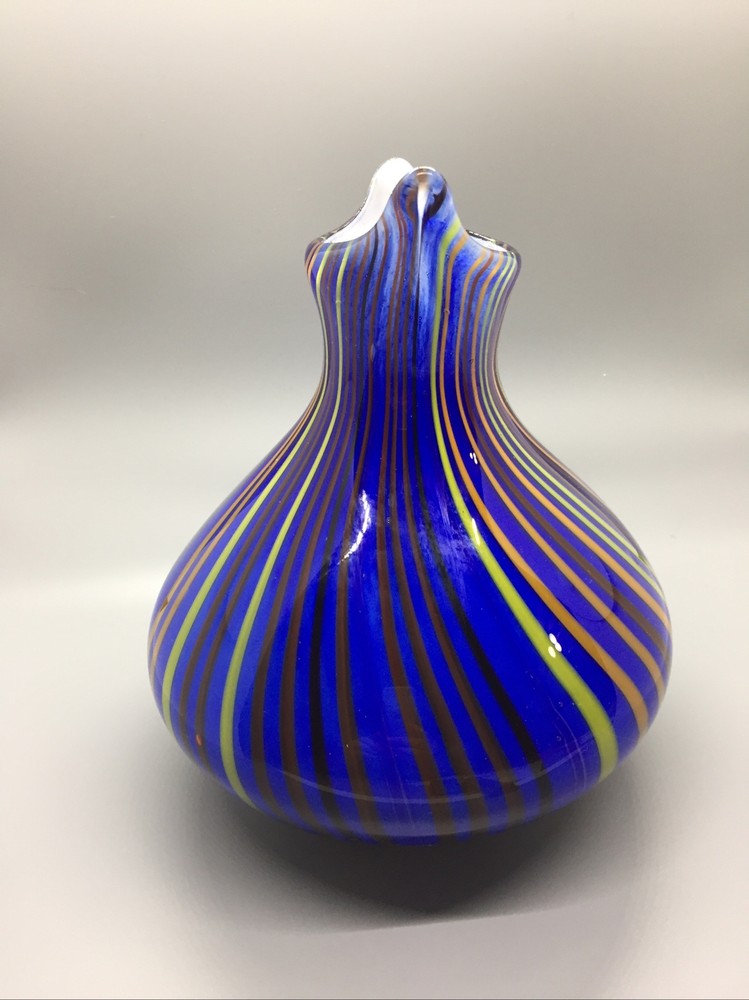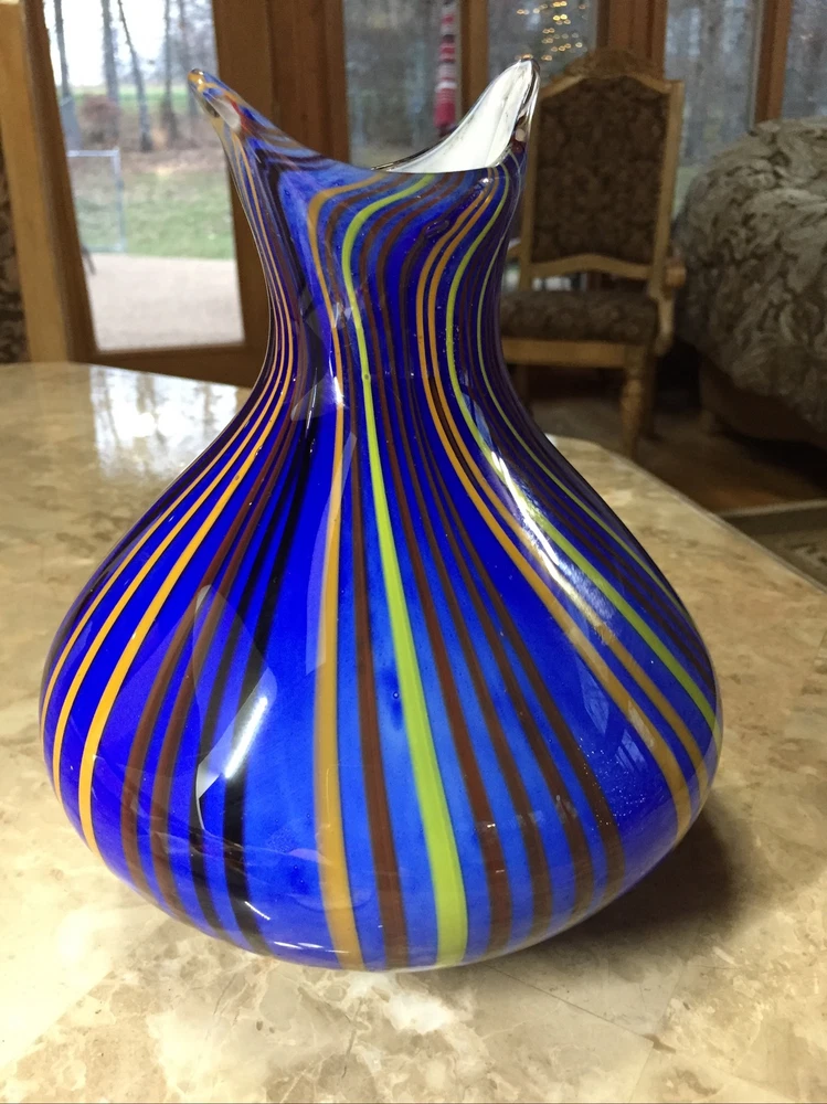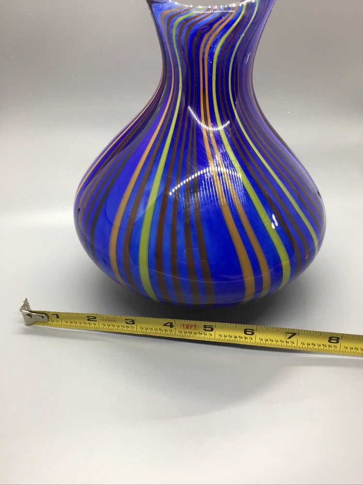 This stunning hand-blown glass owl vase is a true work of art! The deep blue and white swirl pattern with vertical lines gives it a mesmerizing, one-of-a-kind look. Despite its delicate appearance, it’s surprisingly sturdy and heavy, standing 8 inches tall with a lovely presence. The condition is excellent—barely any signs of wear. It’s perfect as a decor piece or a vase, adding elegance to any room. The craftsmanship is incredible—definitely a standout piece for collectors or anyone who appreciates unique glass art. Absolutely in love with it!