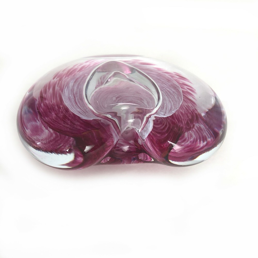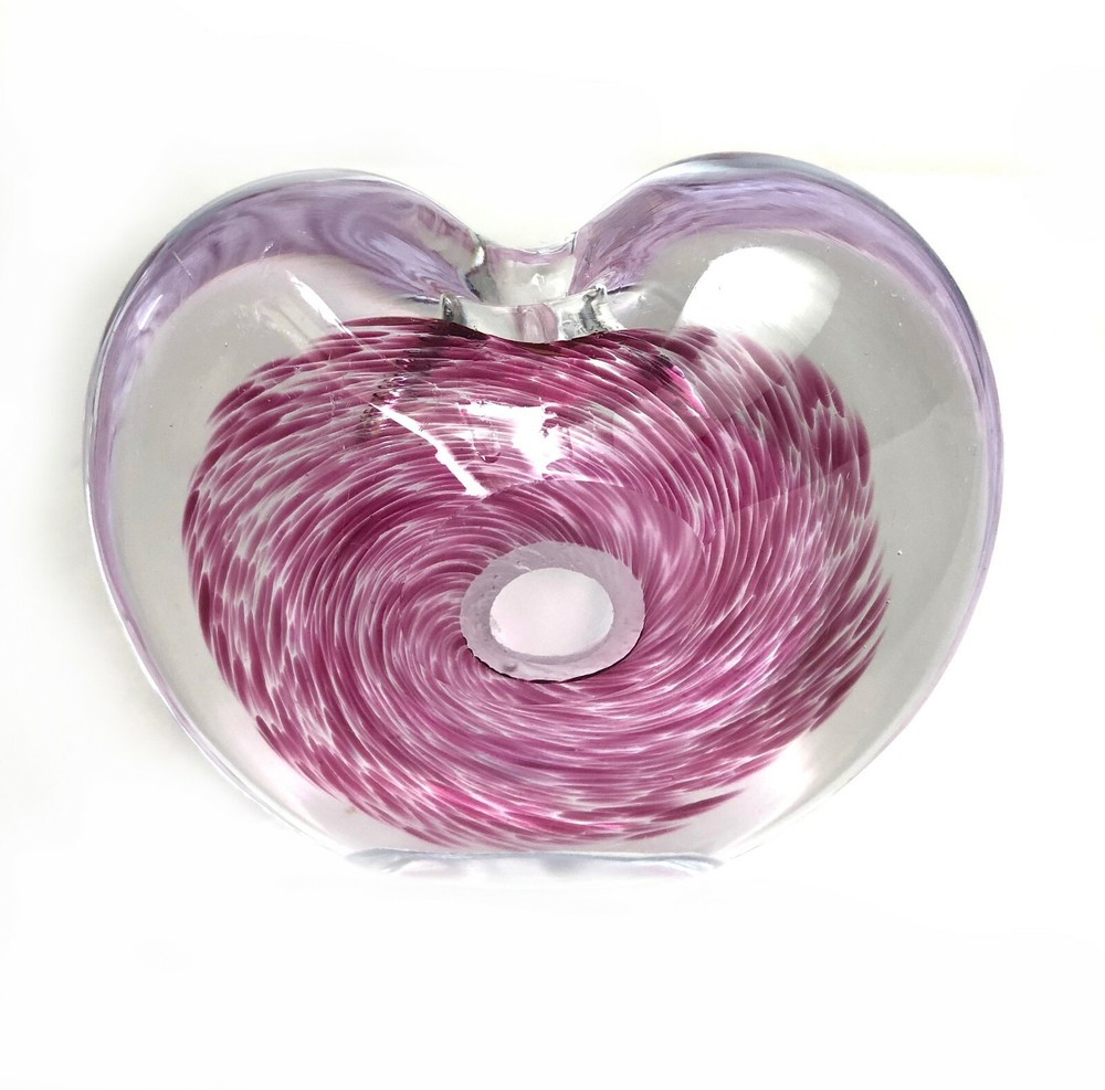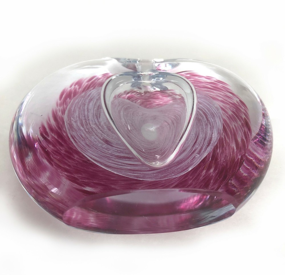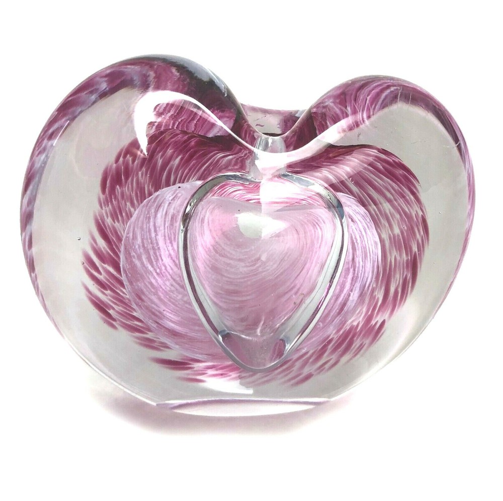 Hand Blown Studio Art Glass Pink Heart Shaped Perfume Bottle Vase No Dauber Has a flat side so it can sit vertical or horizontal as a paperweight. Measures approximately 4" tall x 4" wide