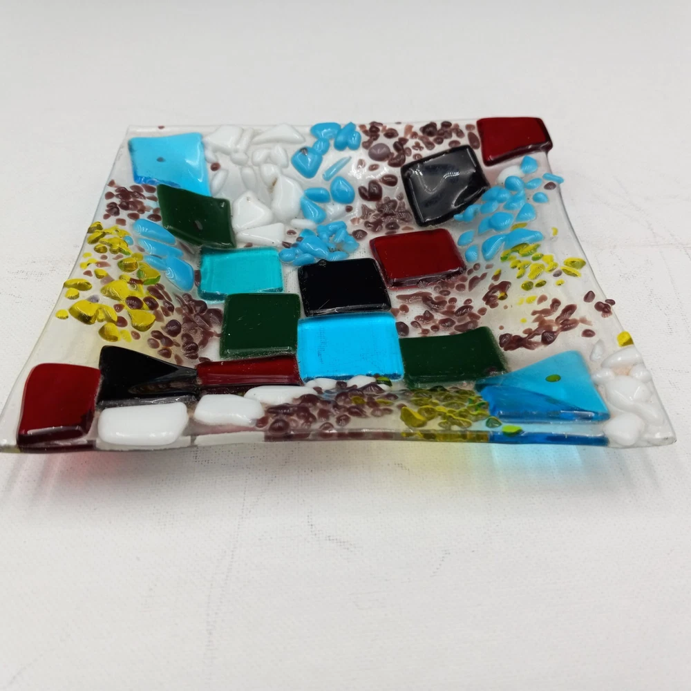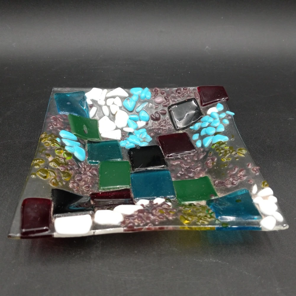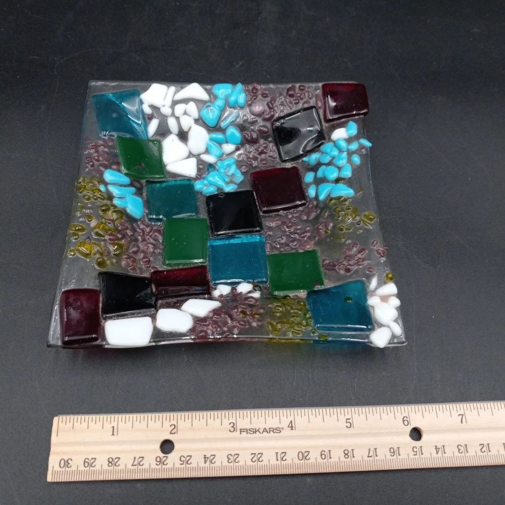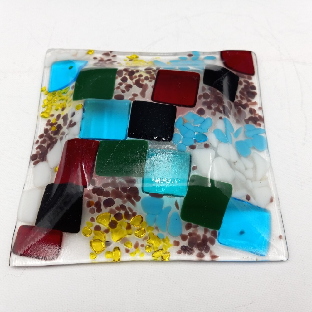 This hand crafted art studio fused glass abstract mosaic tile trinket/candy dish is a stunning piece that would make a great addition to any collection. This square dish is 6x6 inches and features beautiful multicolor glass. The dish is handmade using a production technique called fused glass, and features a stunning patchwork pattern. This beautiful art glass is in excellent condiiton with no chips cracks or scratches and would look lovely with any home decor.