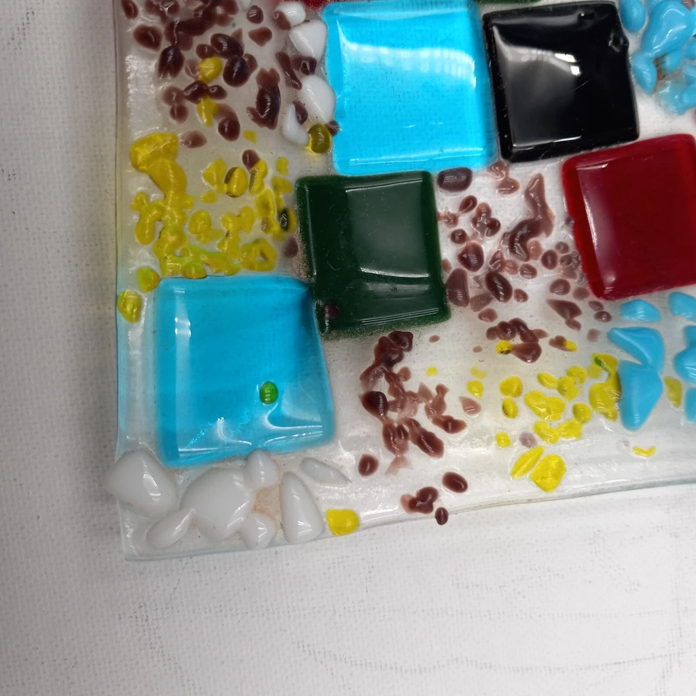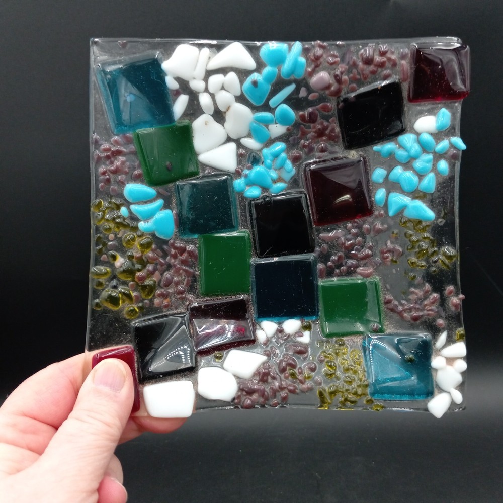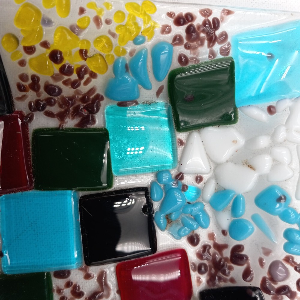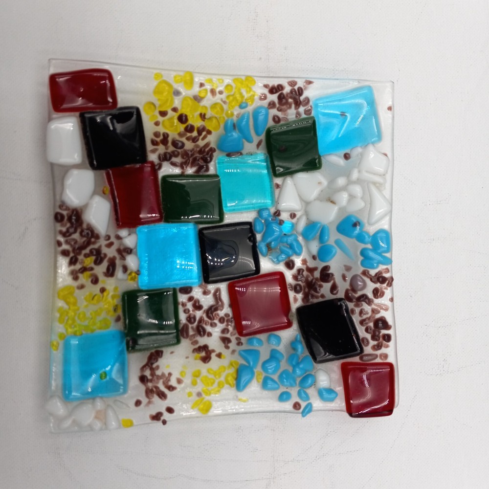 This hand crafted art studio fused glass abstract mosaic tile trinket/candy dish is a stunning piece that would make a great addition to any collection. This square dish is 6x6 inches and features beautiful multicolor glass. The dish is handmade using a production technique called fused glass, and features a stunning patchwork pattern. This beautiful art glass is in excellent condiiton with no chips cracks or scratches and would look lovely with any home decor.