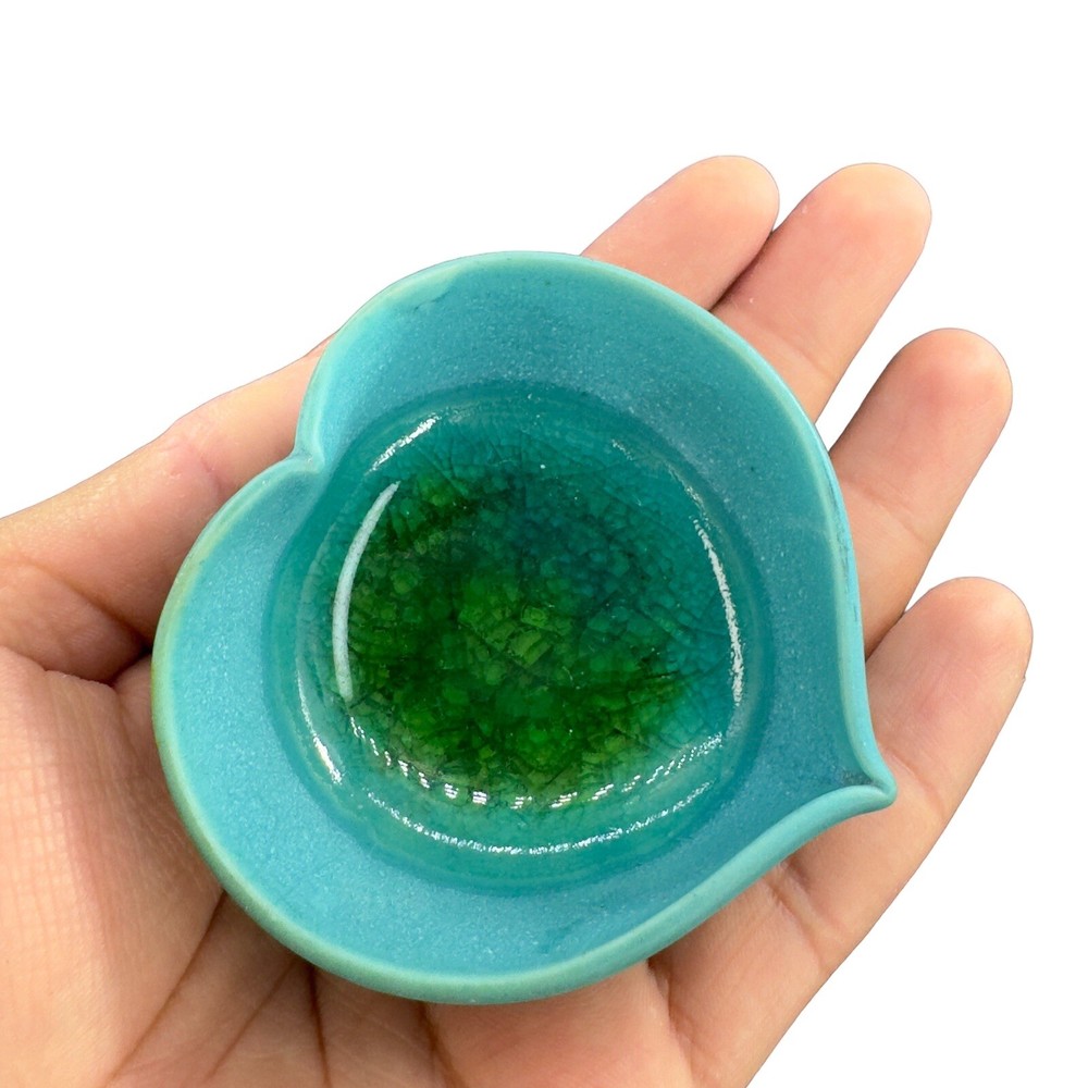 This adorable little heart-shaped dish is absolutely charming! The stunning crystalline blue and green glaze gives it a unique, artistic look, and the handcrafted details make it feel special. Perfect for holding jewelry, trinkets, or even a small candle—it's both functional and beautiful. The size is just right for a delicate touch to any space. Love the handmade pottery vibe!