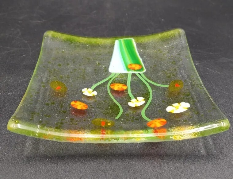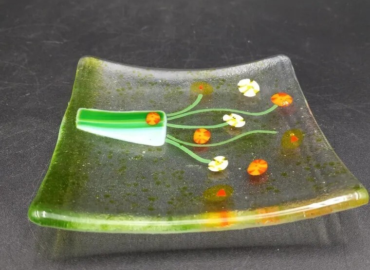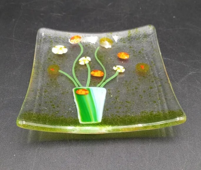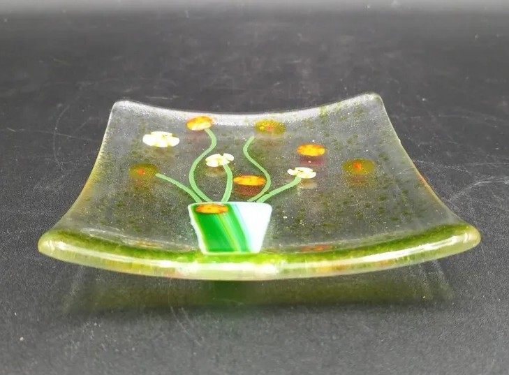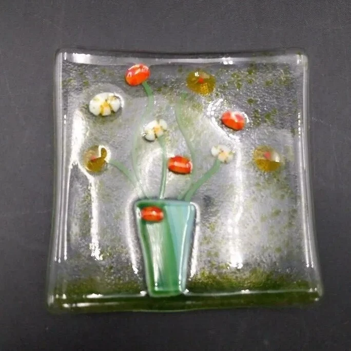 Display your jewelry or small trinkets in this stunning square fused glass dish. Expertly handcrafted by artisans with a beautiful floral bouquet fused into the glass. The glossy finish highlights the intricate details of the artwork, making it a perfect decorative piece for any room. This beautiful piece of art glass is in excellent condition with no chips, cracks or scratches. The glass appears clearbut at an angle the edges glow a yellowish green. The back is frosted.
