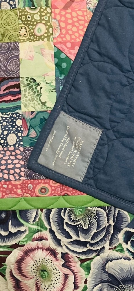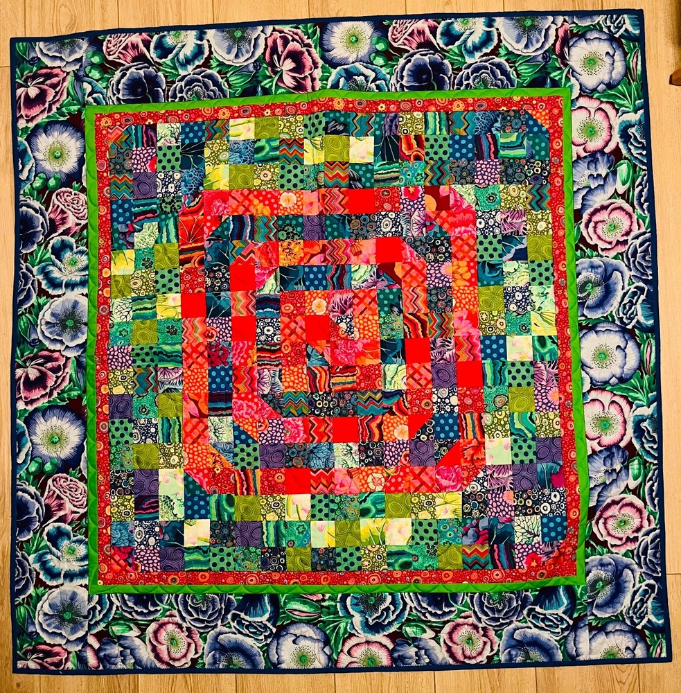 This beautiful handmade patchwork quilt is a unique addition to any room. With a modern style, bold colors, and geometric and flower themed Kaffe Fassett fabrics, it is perfect for both adults and kids. The quilt is made of 100% cotton and is filled with warm and cozy material. Measuring 50 inches in length and width, it is the perfect size for wrapping up or covering your lap. The quilt is easy to care for and can be machine washed cold, tumble dried on low heat, ironed medium, and do not bleach. This original quilt was handmade with patchwork, stitching , and quilting in my home studio. It is an ideal item to give as a gift or to keep for yourself.