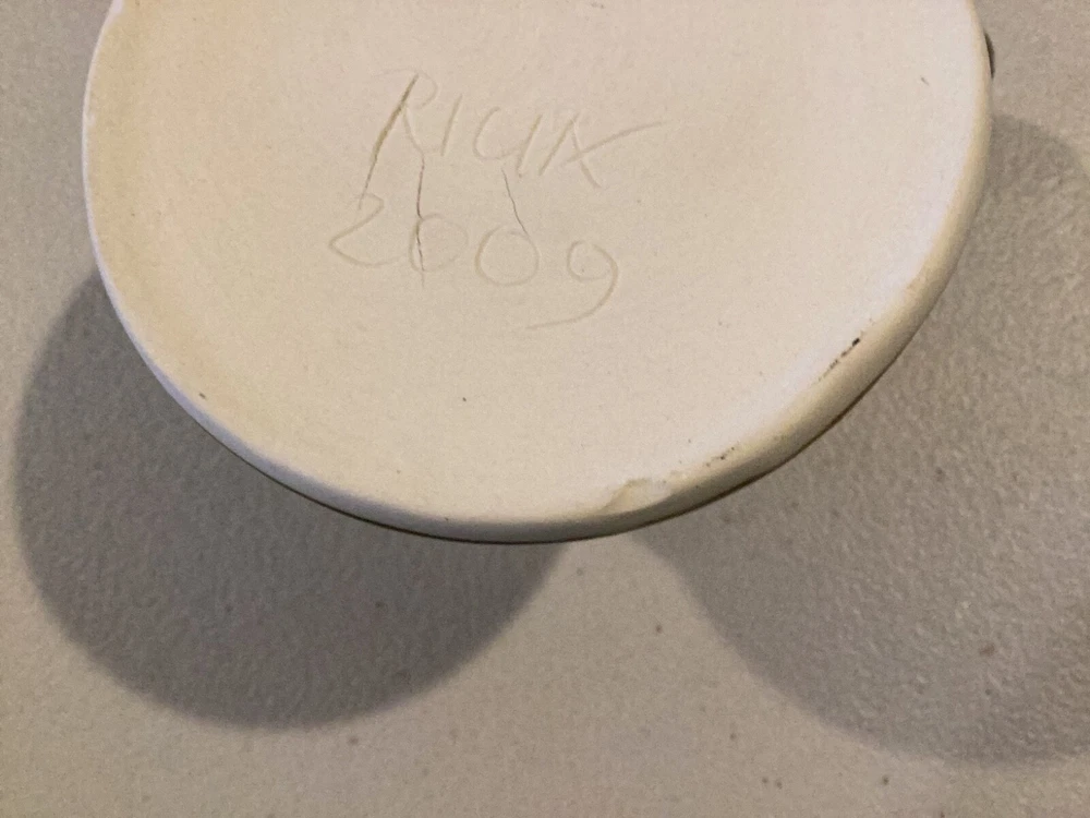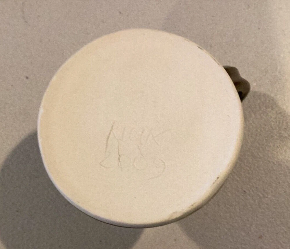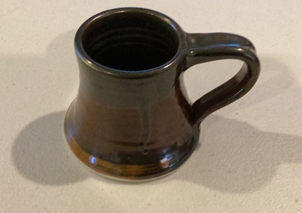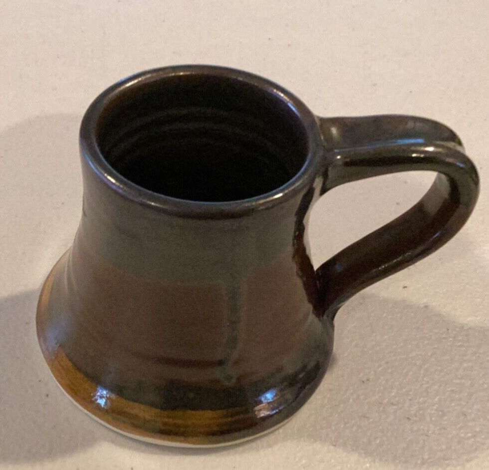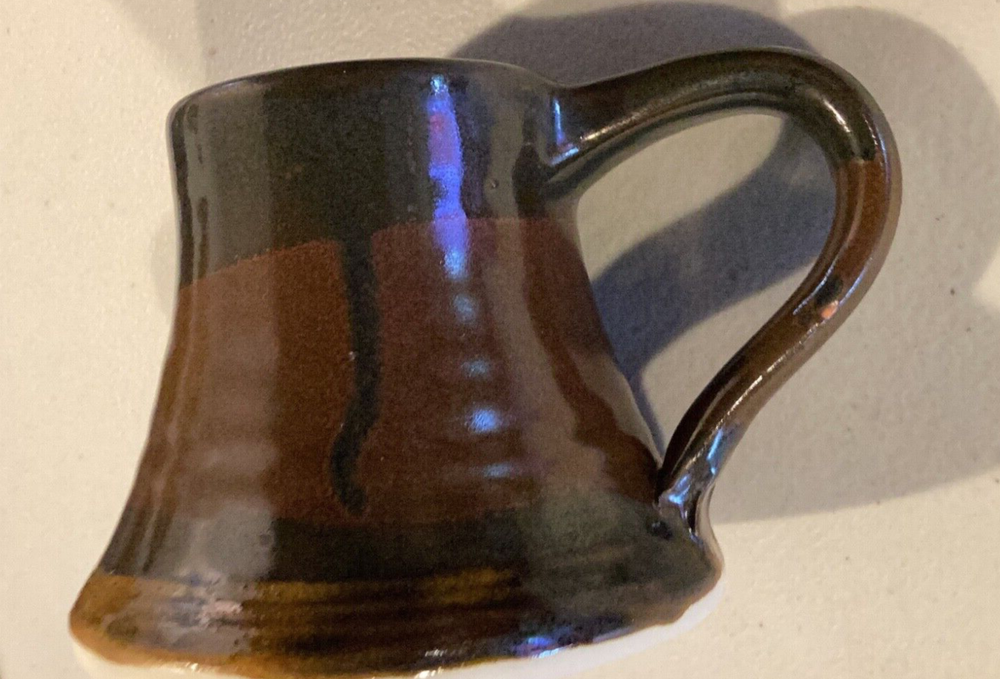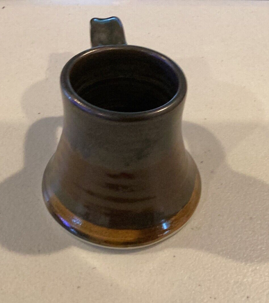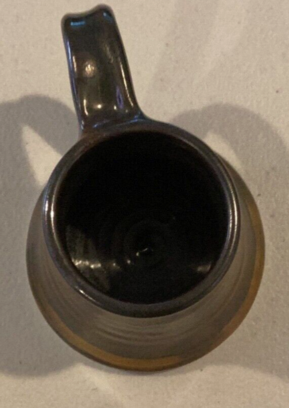 Signed by Artist on base. Mouth to handle is 4 1/2”. Base is 4”. Height is 3 1/4”. Nice coffee mug made in 2009. There is a small chip that doesn’t distract or hurt the integrity of mug. See pics pls. Black brown drip glaze. Very comfortable feel to drink out of mug. We try our best to take enough pictures to show all aspects of the item so look carefully as the photos are part of the description. Photos show details where words can't and show you exactly what you are bidding on. Shipping charges are not refundable. Any returned item by buyer will pay the return postage and will not be refunded. Only price paid (minus the shipping) will be refunded by Seller. Almost l00% of what we sell is vintage/antique or used. We accept PayPal only. We use recycled bubble wrap, paper and boxes. Thanks for looking.