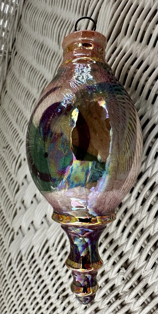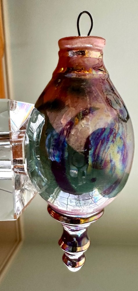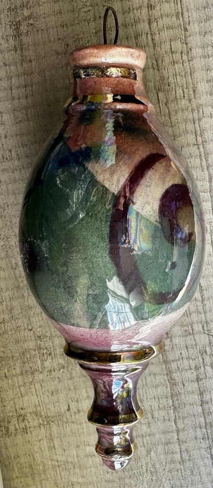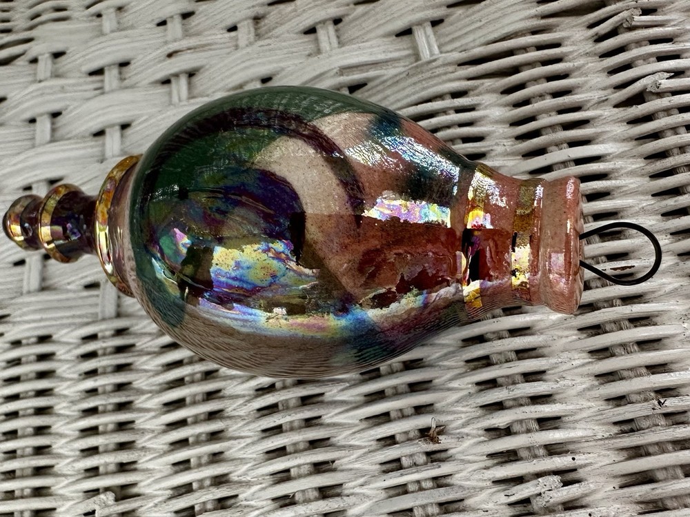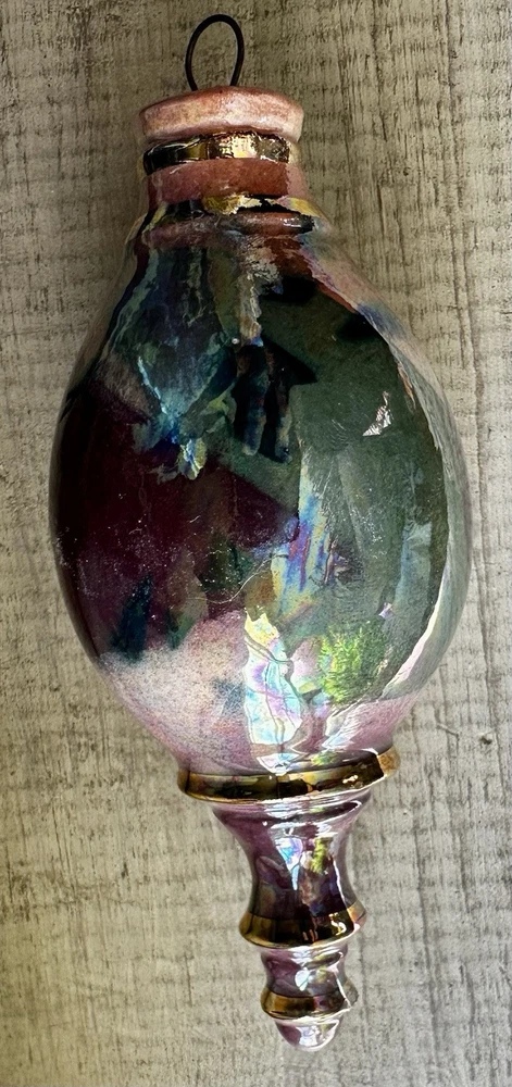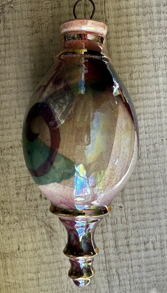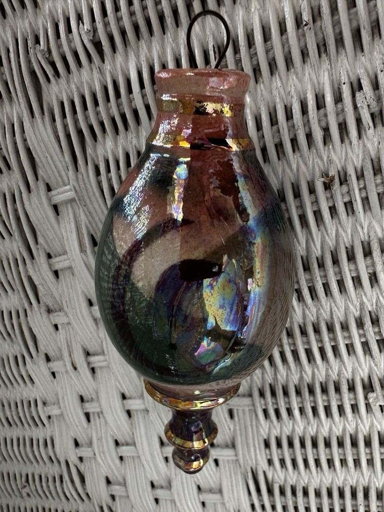 Beautiful hand crafted ornament or hanging decoration, amazing colors, hand painted with pinks, neutrals, green, blues and a gorgeous glaze that gives the or ornament a glossy, iridescent shine. Measures 5.5” tall x 2.25” at the widest. Excellent used condition!