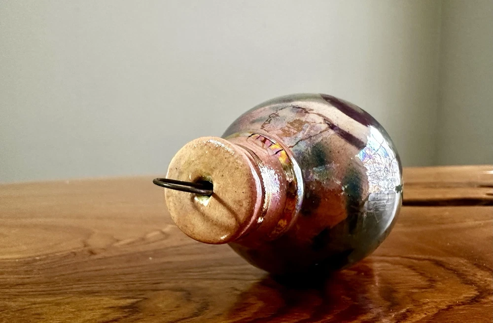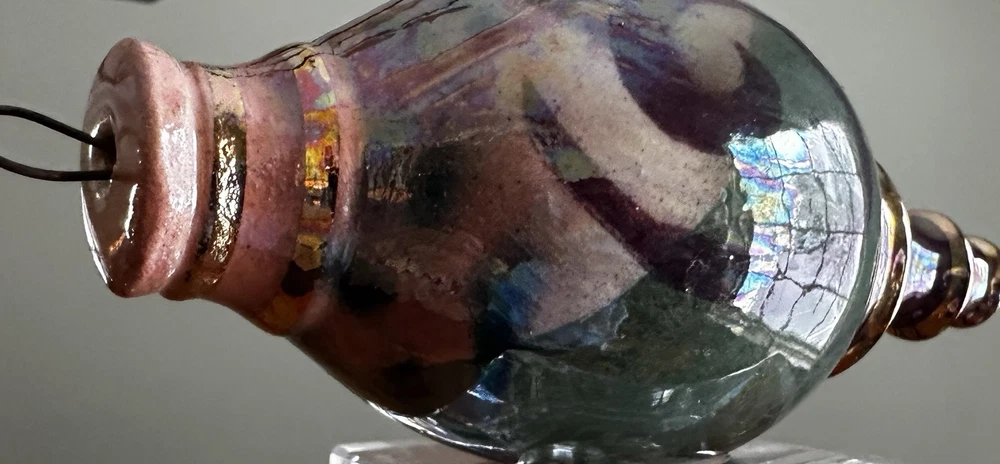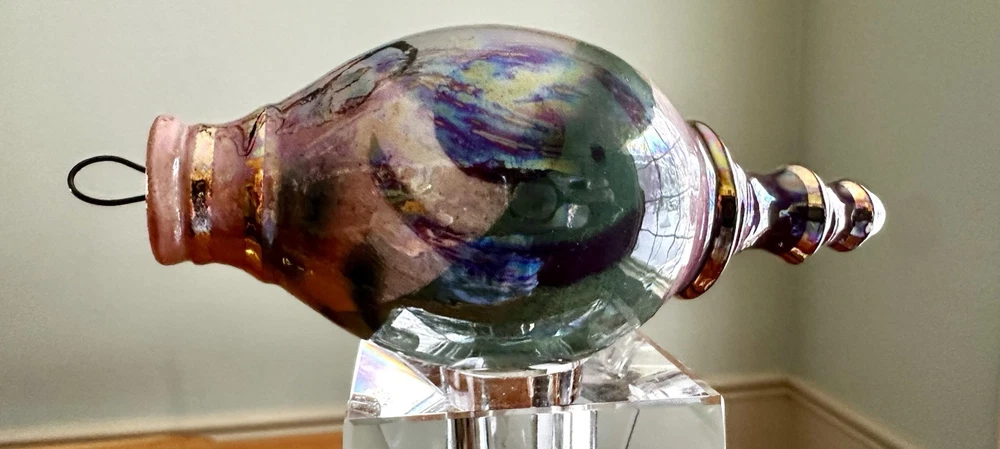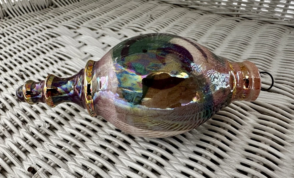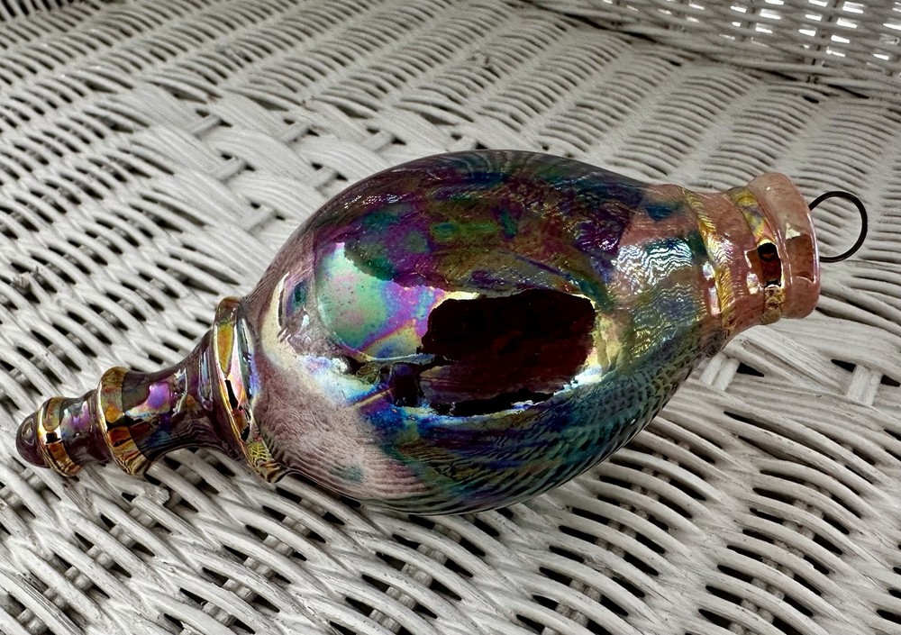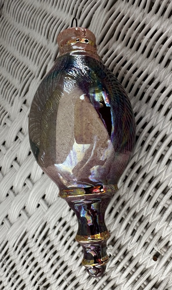 Beautiful hand crafted ornament or hanging decoration, amazing colors, hand painted with pinks, neutrals, green, blues and a gorgeous glaze that gives the or ornament a glossy, iridescent shine. Measures 5.5” tall x 2.25” at the widest. Excellent used condition!
