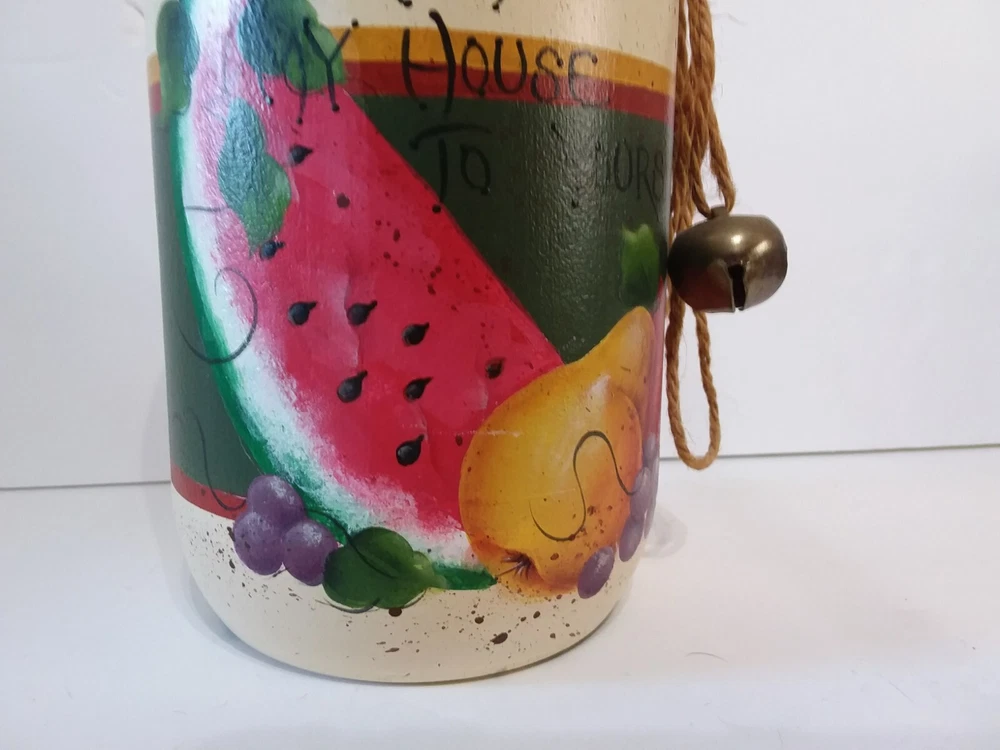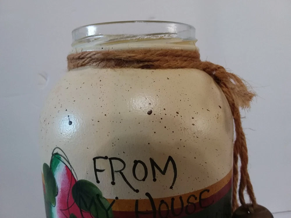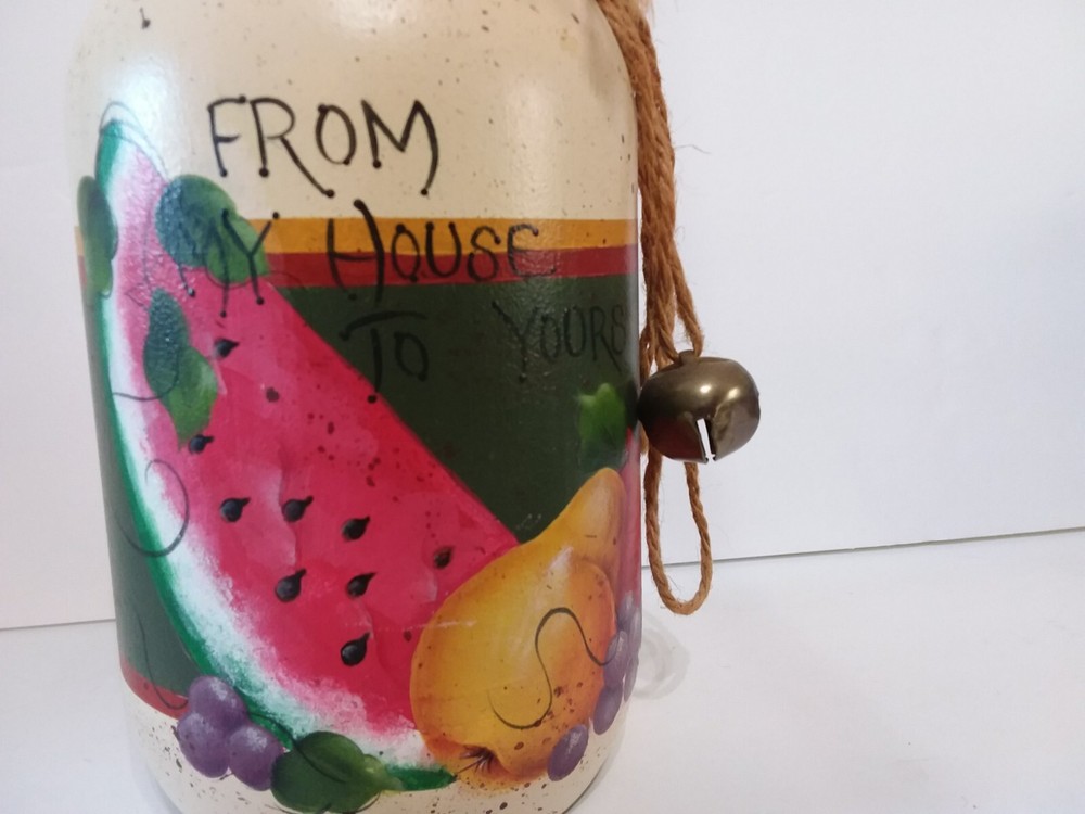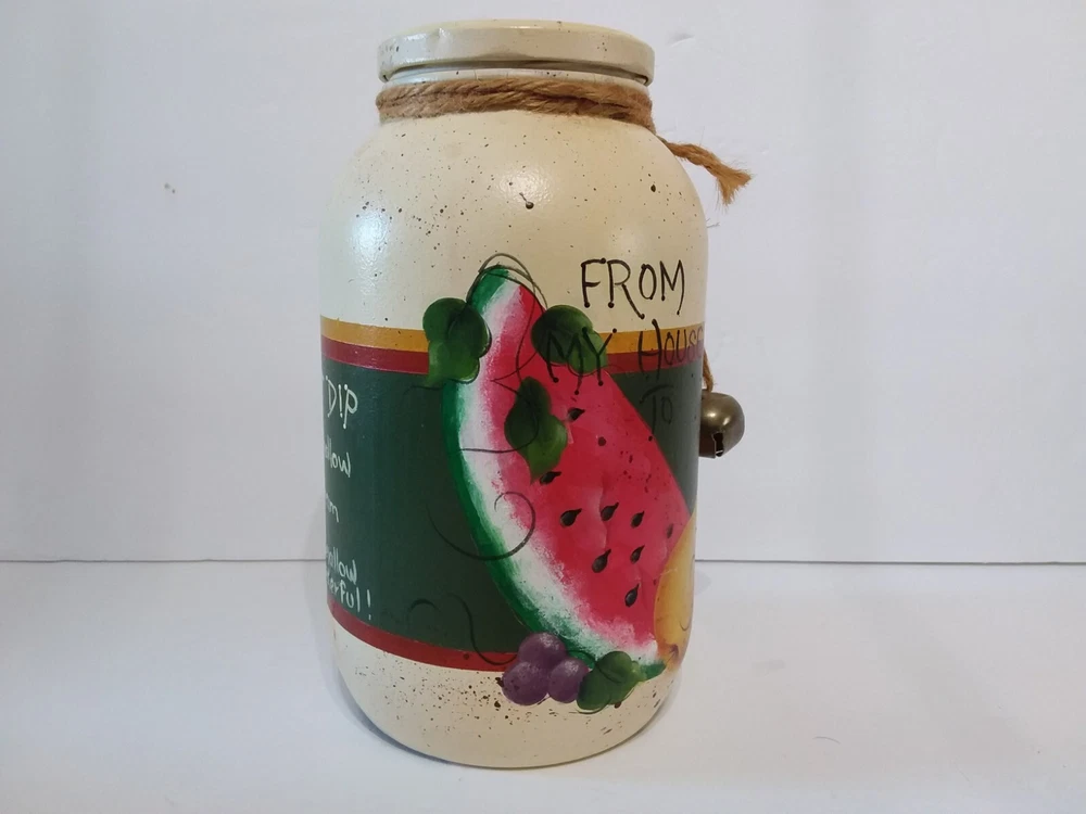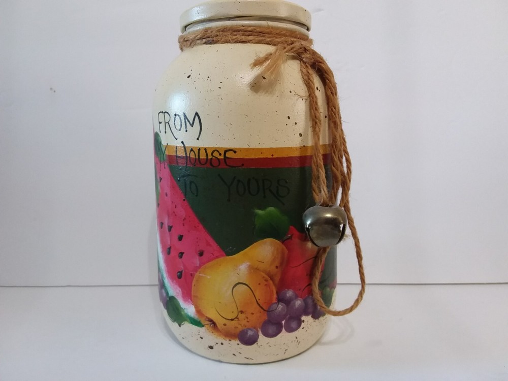 Hand Painted Glass Fruit Jar - FROM MY HOUSE TO YOURS - Watermelon Grapes Apple. GREAT GIFT FILL IT WITH THIS EASY DELICIOUS RECIPE WRITTEN ON THE BACK. HAND PAINTED FRUIT " FROM MY HOUSE TO YOURS" . TERRIFIC COUNTRY KITCHEN DECOR. VIEW ALL PICTURES FOR A BETTER VISUAL DESCRIPTION, SMOKE FREE HOME PLEASE FEEL FREE TO ASK QUESTIONS.