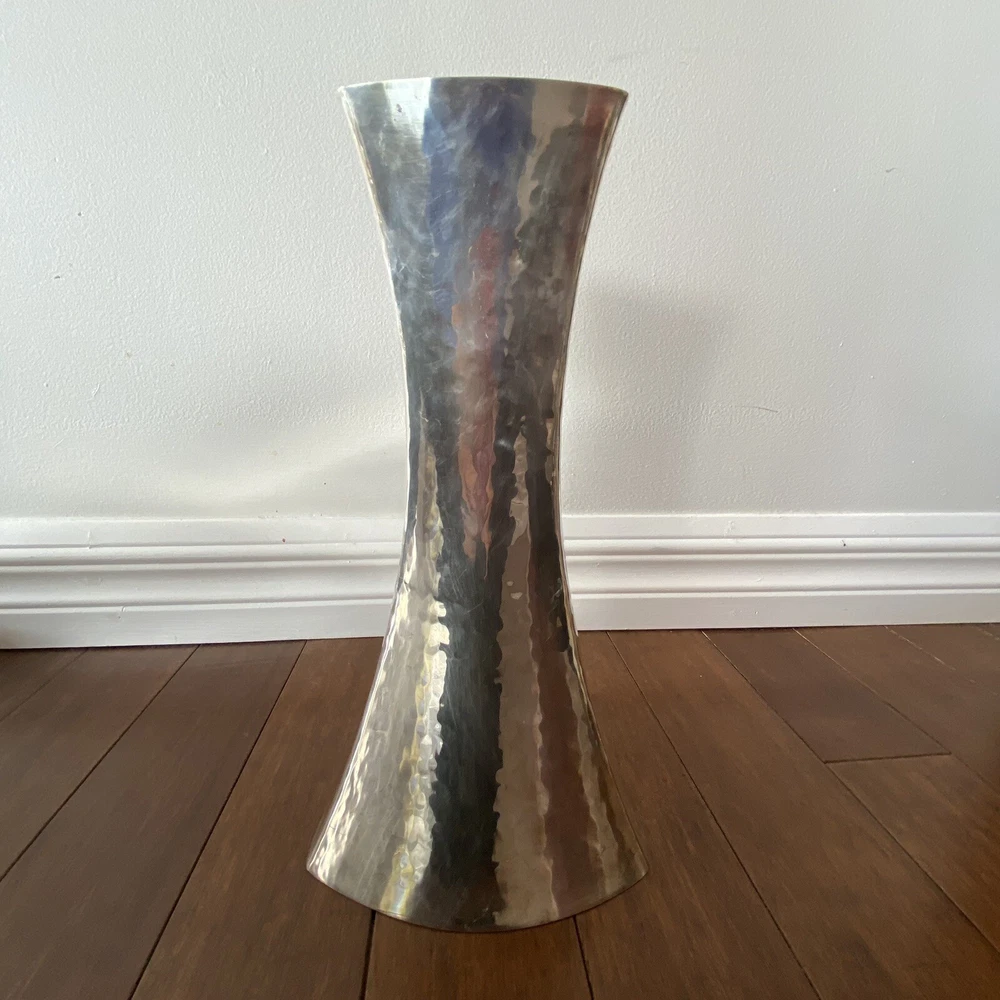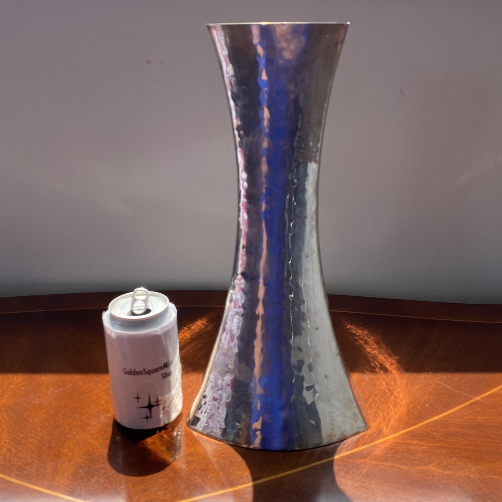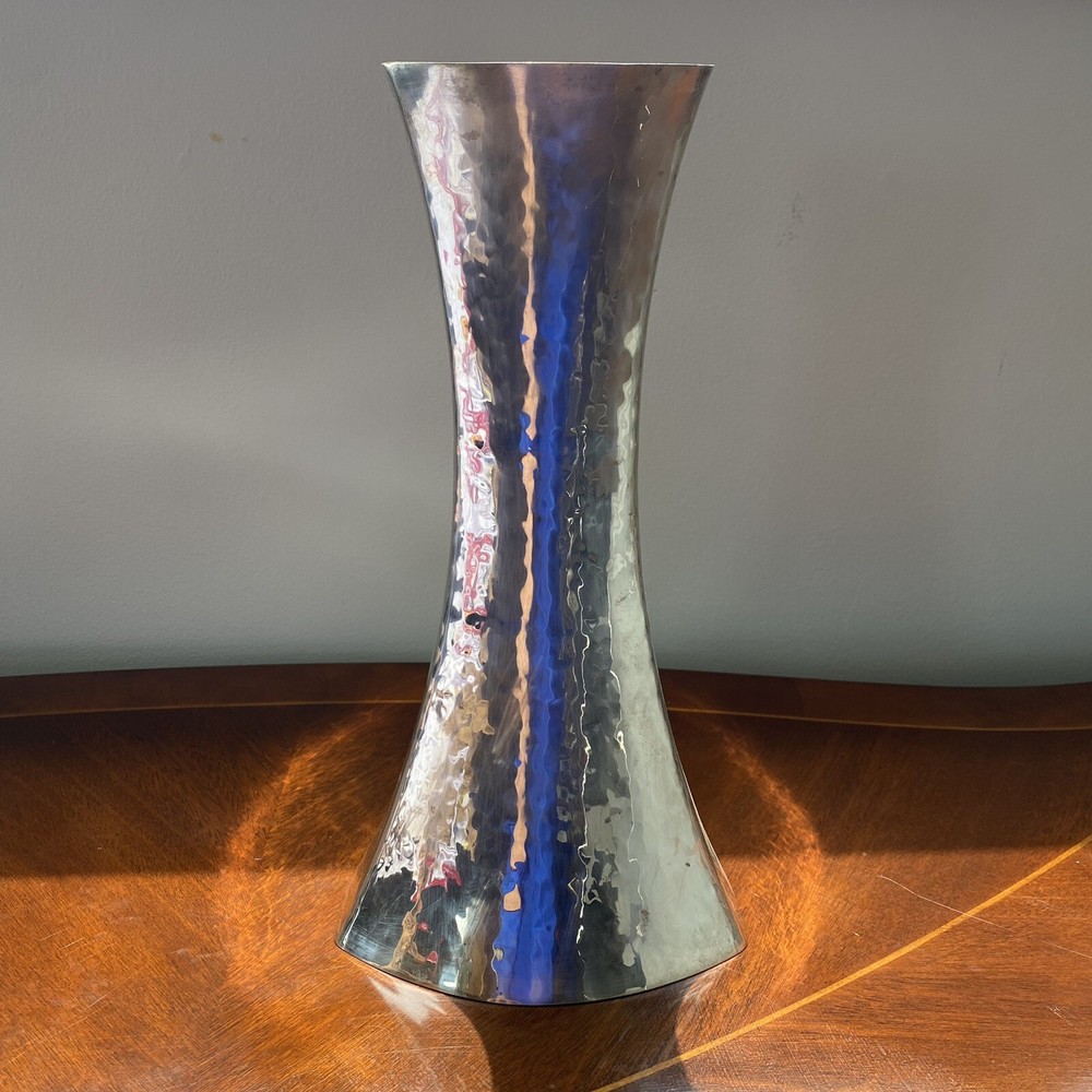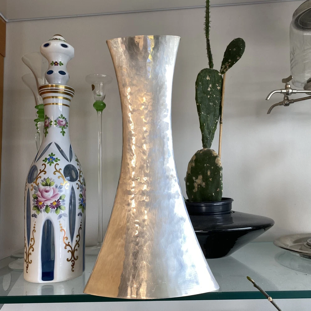 Handcrafted Hammered Silver ZANETTO STUDIO concave shaped Vase Italy vintage In good vintage condition, some wear, some scratches Very shiny mirrored surfaces This vase is boasting a very unique silhouette I've research Zanetto studio and their products are very expensive but I couldn't find a comparable for this one It looks like it's silver plated, but I'm not sure but lots or their vases are in brass plated by a special alloy that does not tarnish