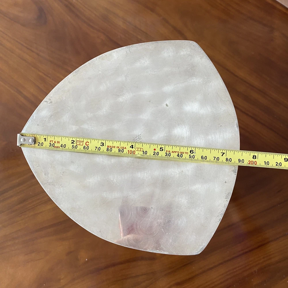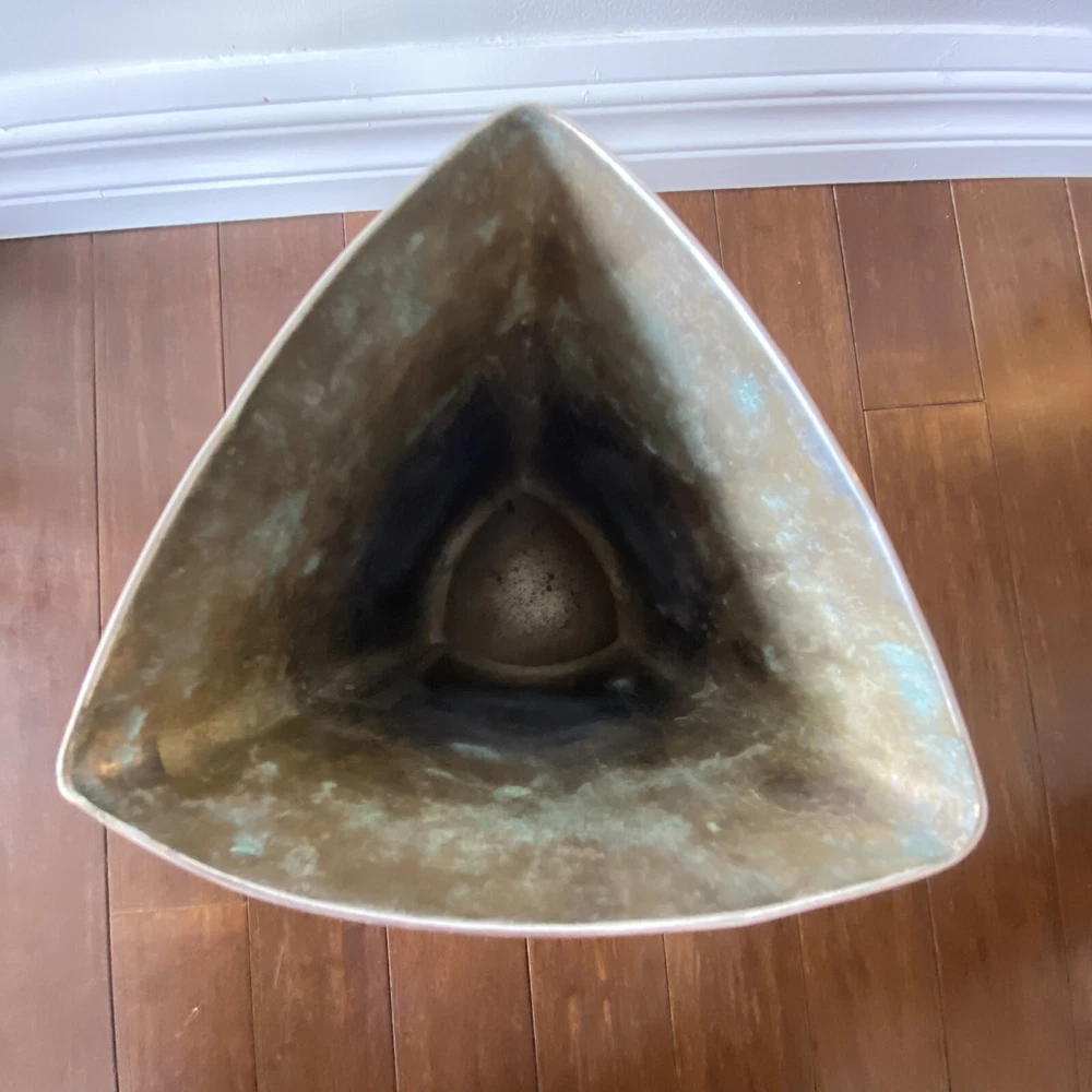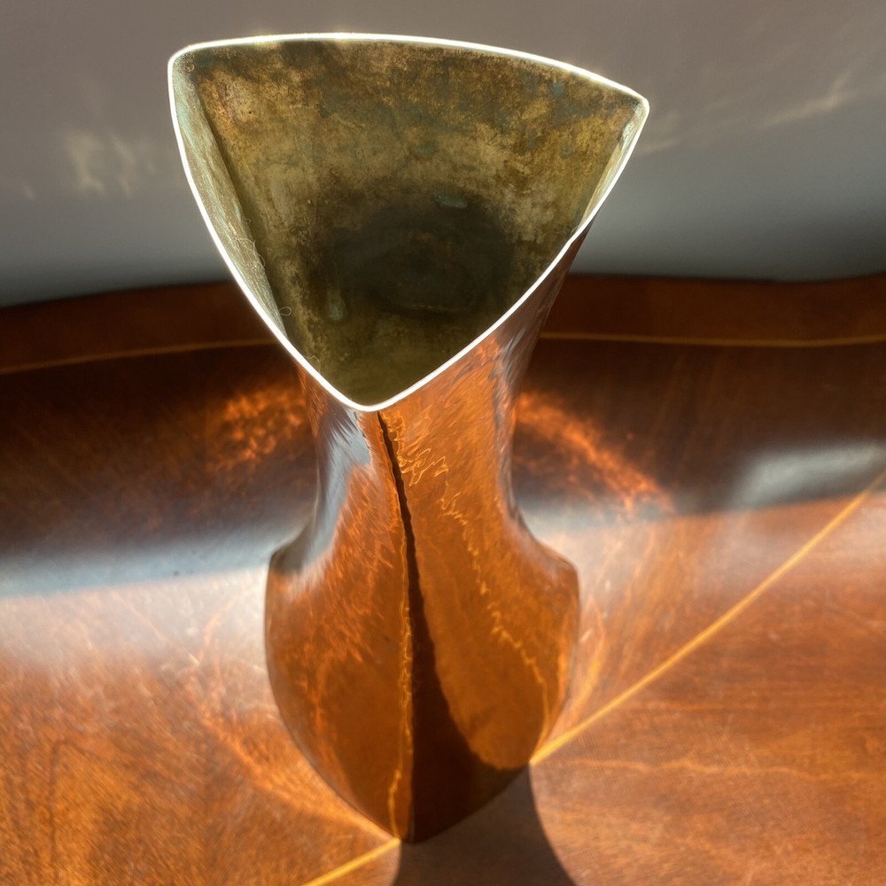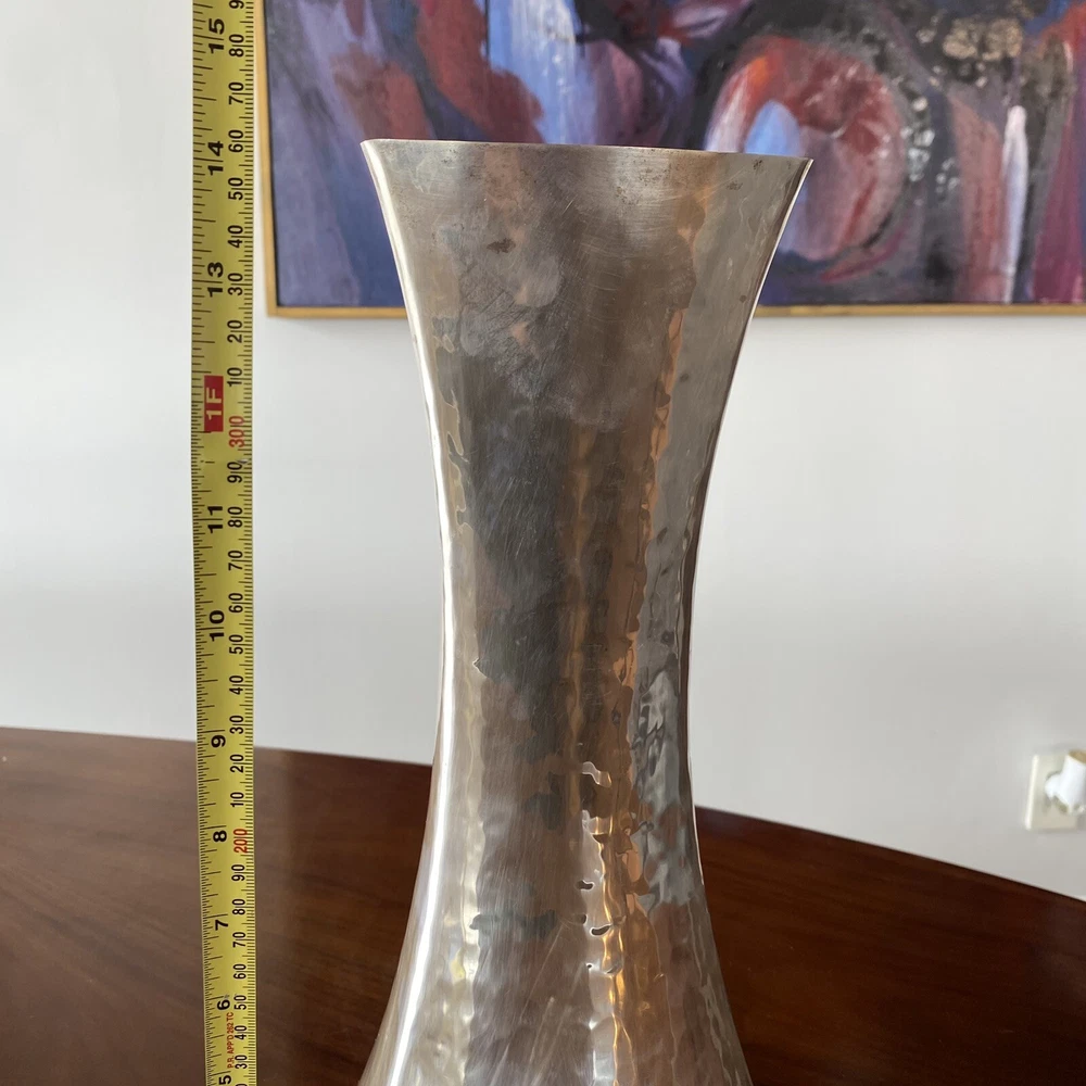 Handcrafted Hammered Silver ZANETTO STUDIO concave shaped Vase Italy vintage In good vintage condition, some wear, some scratches Very shiny mirrored surfaces This vase is boasting a very unique silhouette I've research Zanetto studio and their products are very expensive but I couldn't find a comparable for this one It looks like it's silver plated, but I'm not sure but lots or their vases are in brass plated by a special alloy that does not tarnish