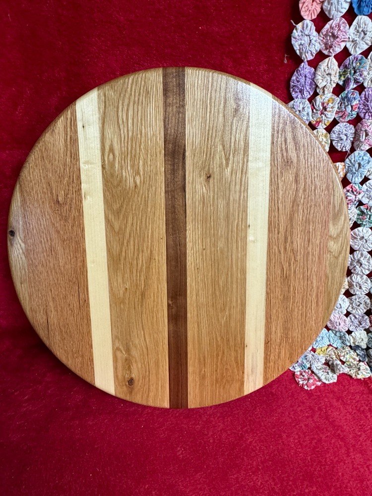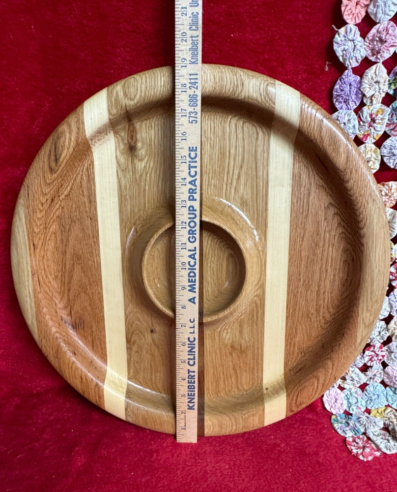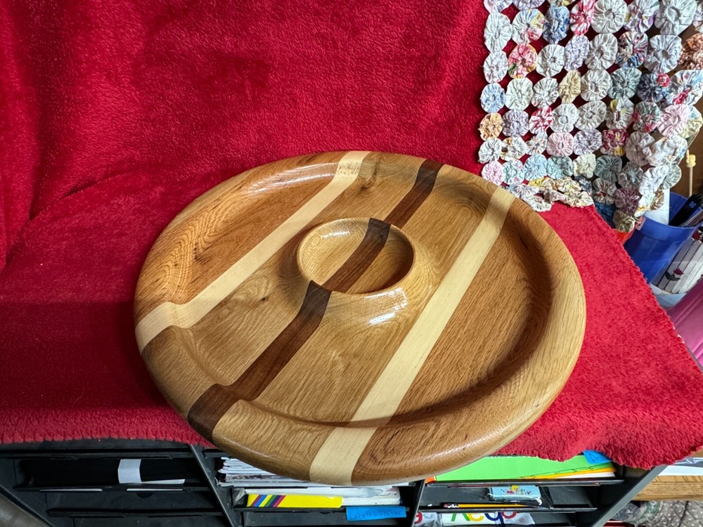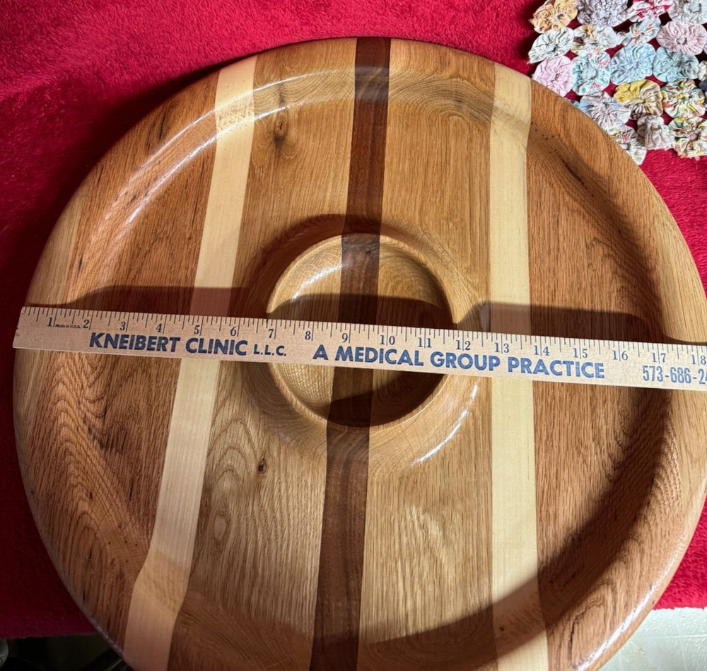 You are looking at a large handcrafted chip & dip serving bowl tray. This features nine stripes of various woods--red oak, white oak, walnut, maple, etc. This measures about 19 7/8" across x about 1 1/2" tall. This uniquely made one of a kind piece was made by my husband here at Ratpack Ranch. If you have any questions please contact me and thank you for looking. (2F-24p2)6lb5.2o (R)