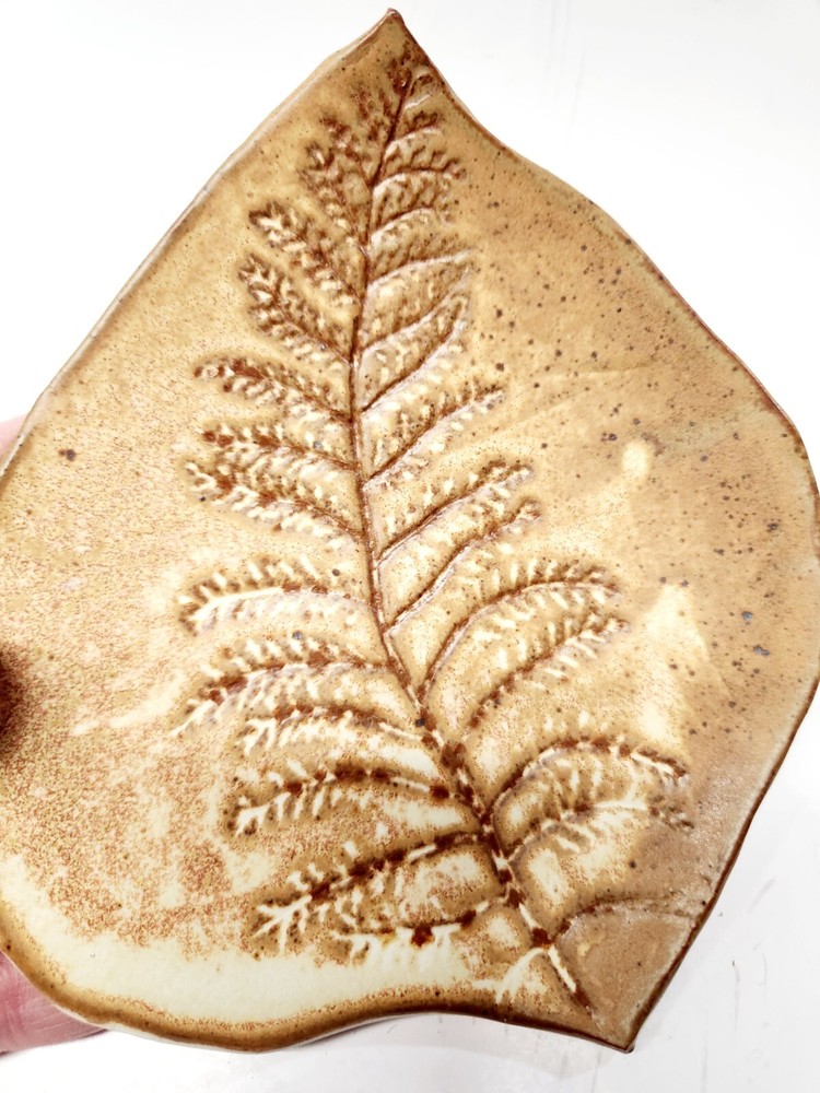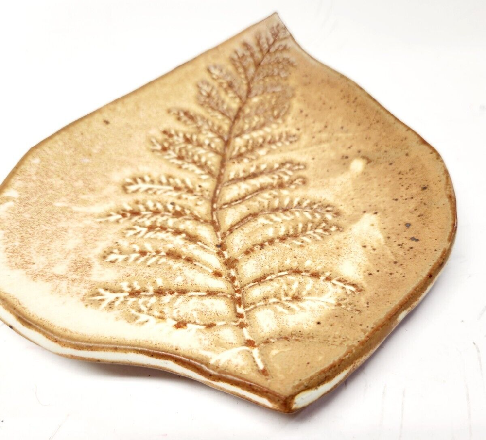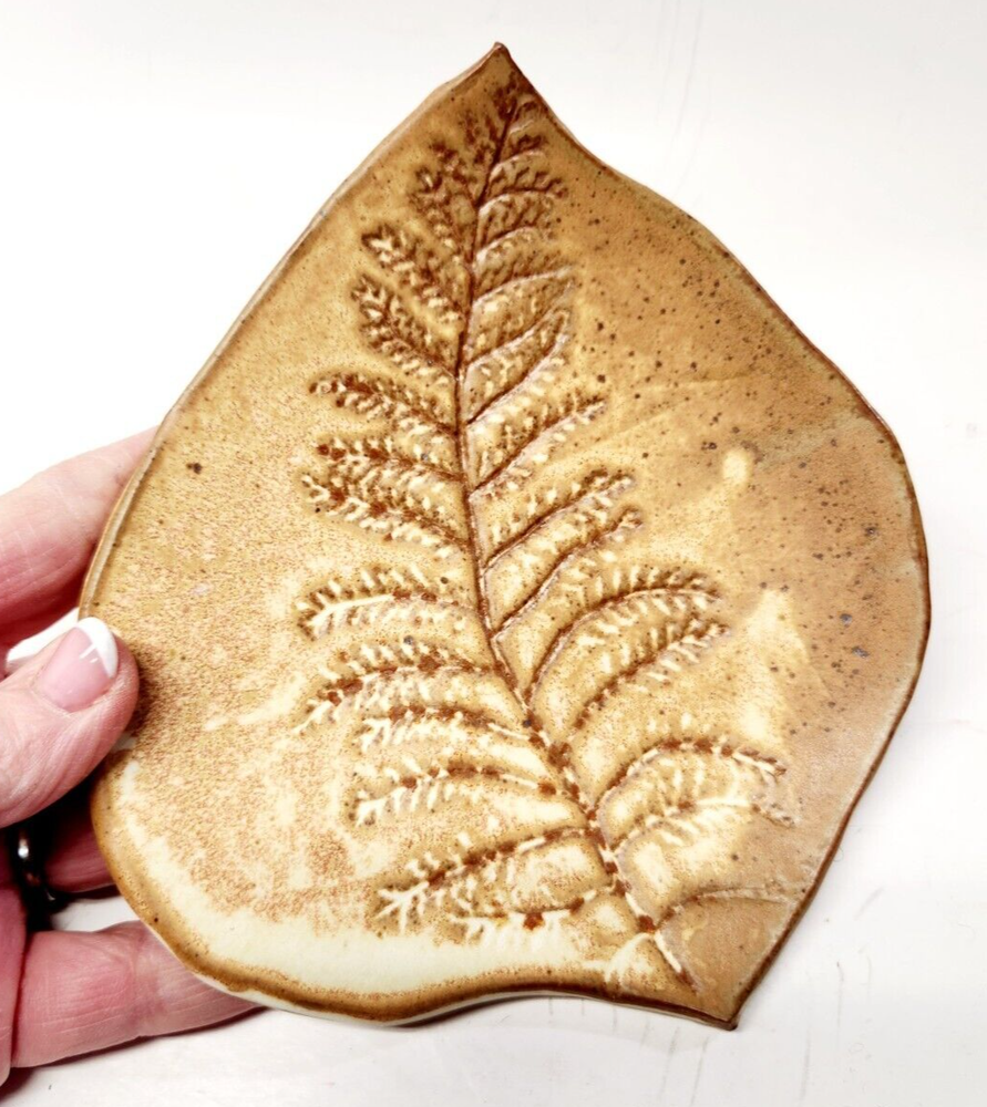 Lovely handcrafted studio pottery leaf shaped dish with fern imprint. Pretty glaze and artist signed. Preowned and in great condition, it measures 6 1/2" long X 6" wide and weighs 6 ounces. This will be carefully packed for the journey from my home to yours! Ships on same or next business day from Vermont and I always combine shipping on multiple purchases! ** To get combined shipping, add the items to your cart on the Checkout page, click Request Invoice. An invoice with updated shipping will be sent to you. RETURNS : If you should have any problems with the item please contact me immediately and I will fully refund your purchase costs. If on the other hand, you are returning the item simply because you no longer want or like it then you will be responsible for the original shipping cost and I will cover the shipping fees associated with returning the item as I have a Free Return policy. **Be sure to check out my store, THRIFTY ADVENTURES, VT where I have a collection of unique vintage finds, clothing, household & decor items, table linens, bedding, art work and much more!