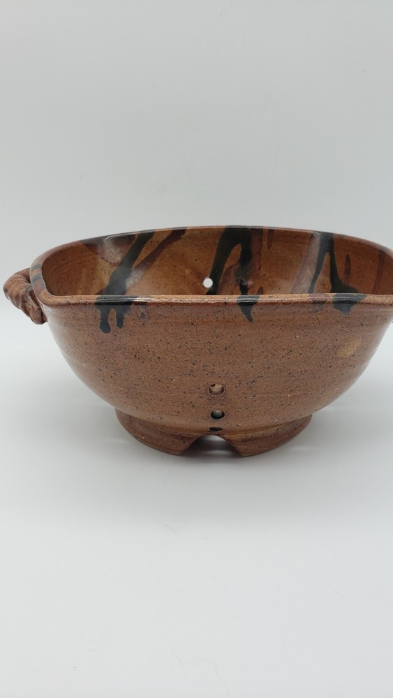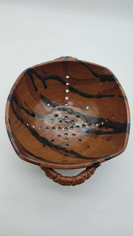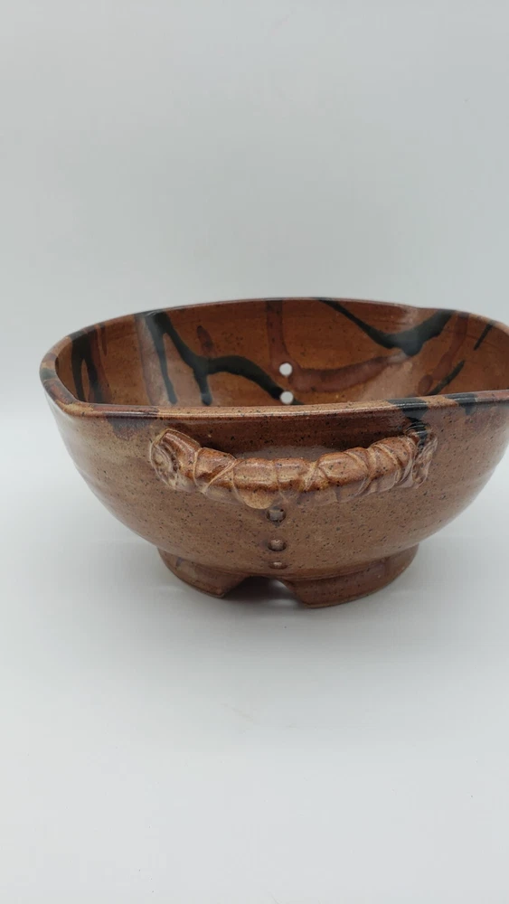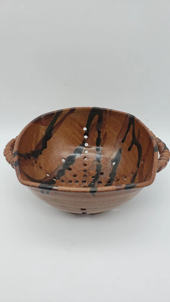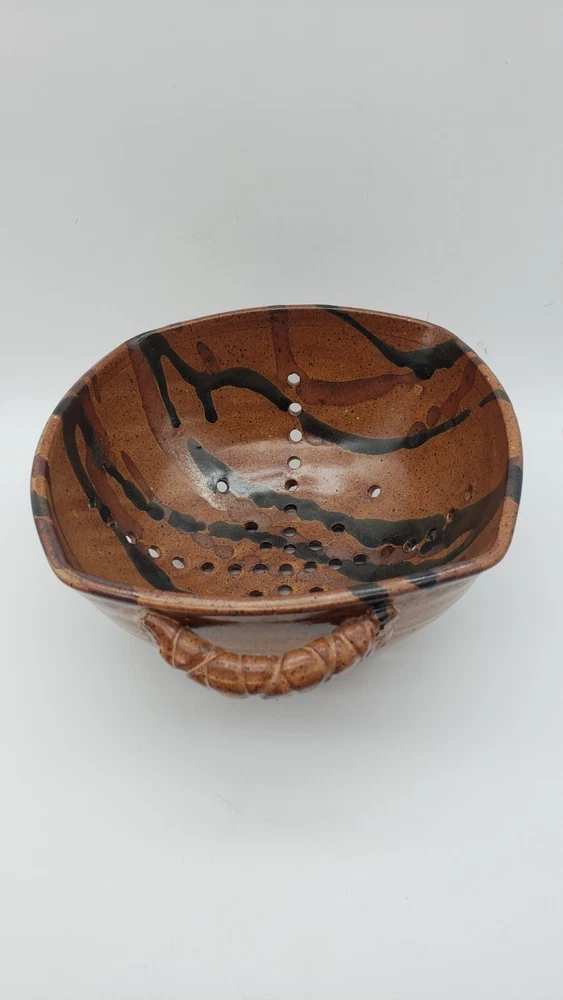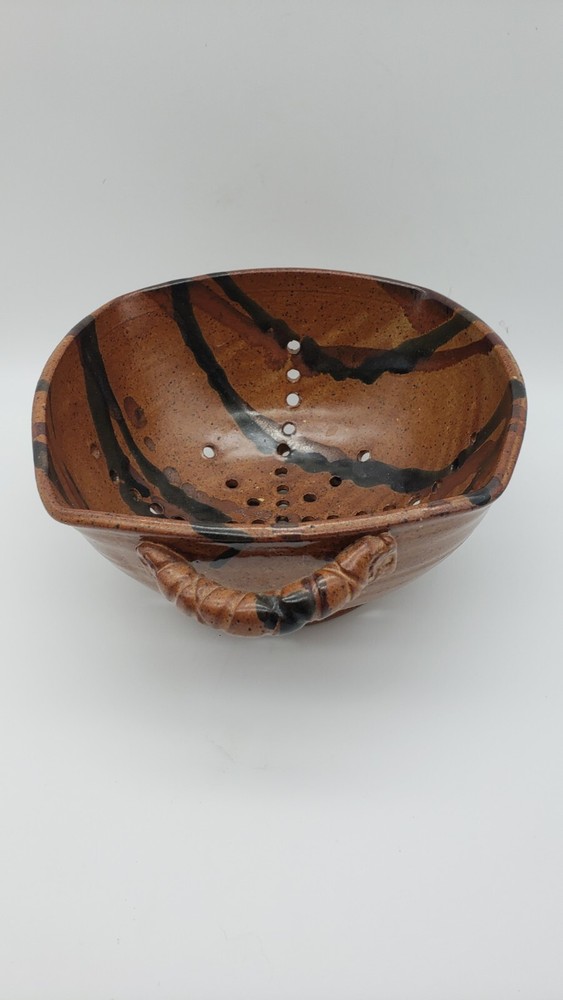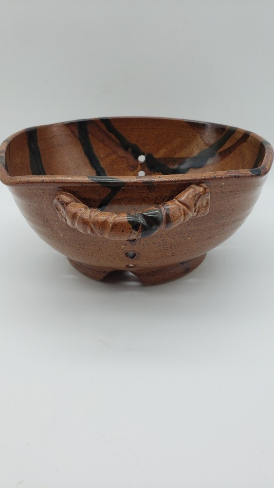I have a great studio art pottery berry bowl looking for a new home. This wonderful piece of art pottery is square in shape and glazed in brown with darker brown and black stripes on the inside and handles. The handles are hand formed and string wrapped and applied before firing. It is signed by the artist on the bottom, but I have not been able to decipher it. It is about 6.75 inches across and 3.25 inches tall. It is in very nice condition with no chips or cracks. It is coming from a smoke free, cat friendly home. Please feel free to message me if you have any questions. Please visit my store, Tennessee Valley Collectables, for more items, both vintage and new.