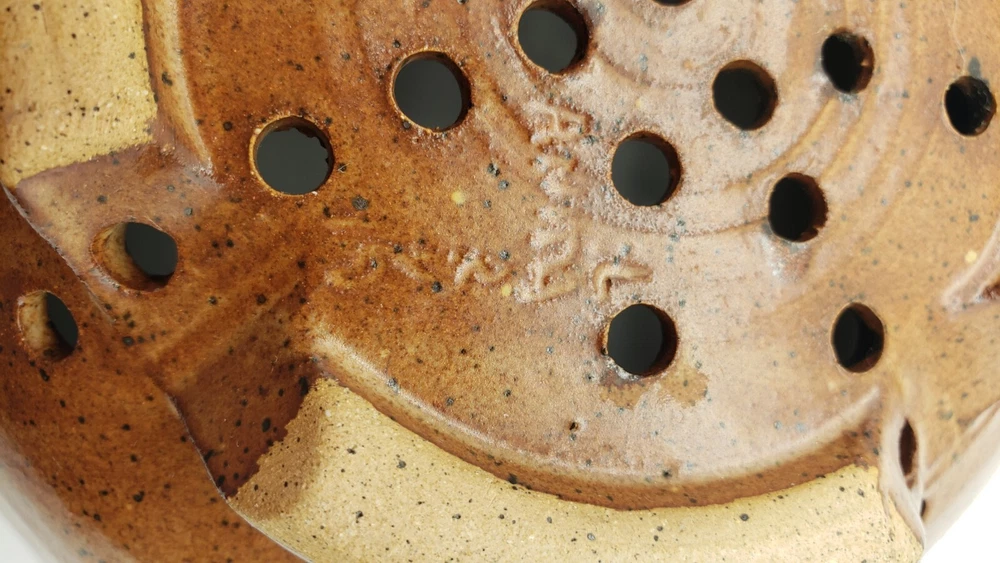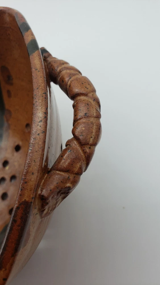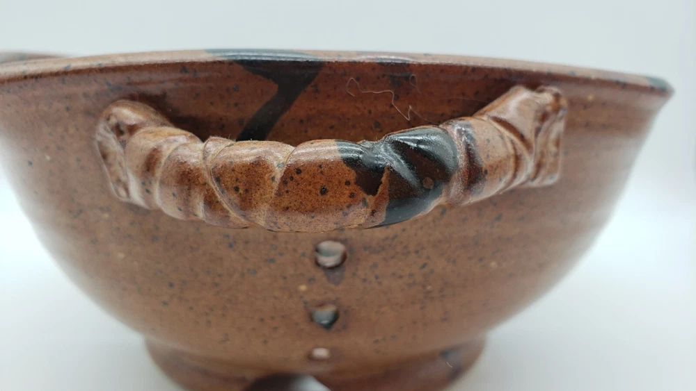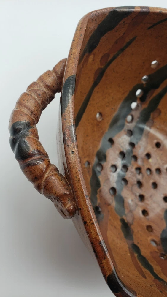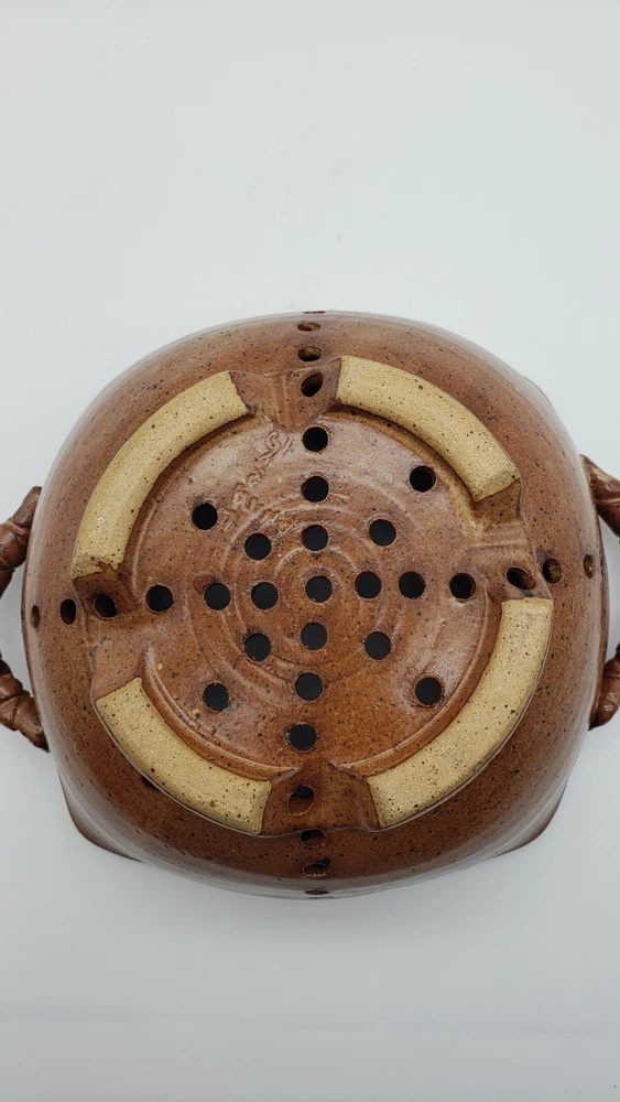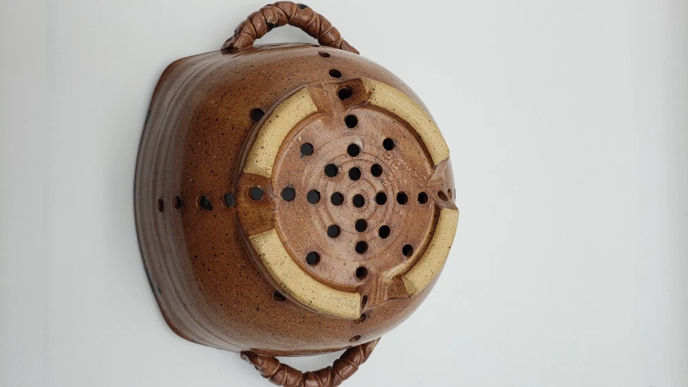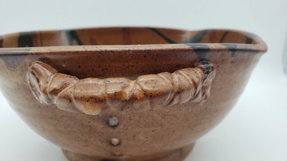 I have a great studio art pottery berry bowl looking for a new home. This wonderful piece of art pottery is square in shape and glazed in brown with darker brown and black stripes on the inside and handles. The handles are hand formed and string wrapped and applied before firing. It is signed by the artist on the bottom, but I have not been able to decipher it. It is about 6.75 inches across and 3.25 inches tall. It is in very nice condition with no chips or cracks. It is coming from a smoke free, cat friendly home. Please feel free to message me if you have any questions. Please visit my store, Tennessee Valley Collectables, for more items, both vintage and new.