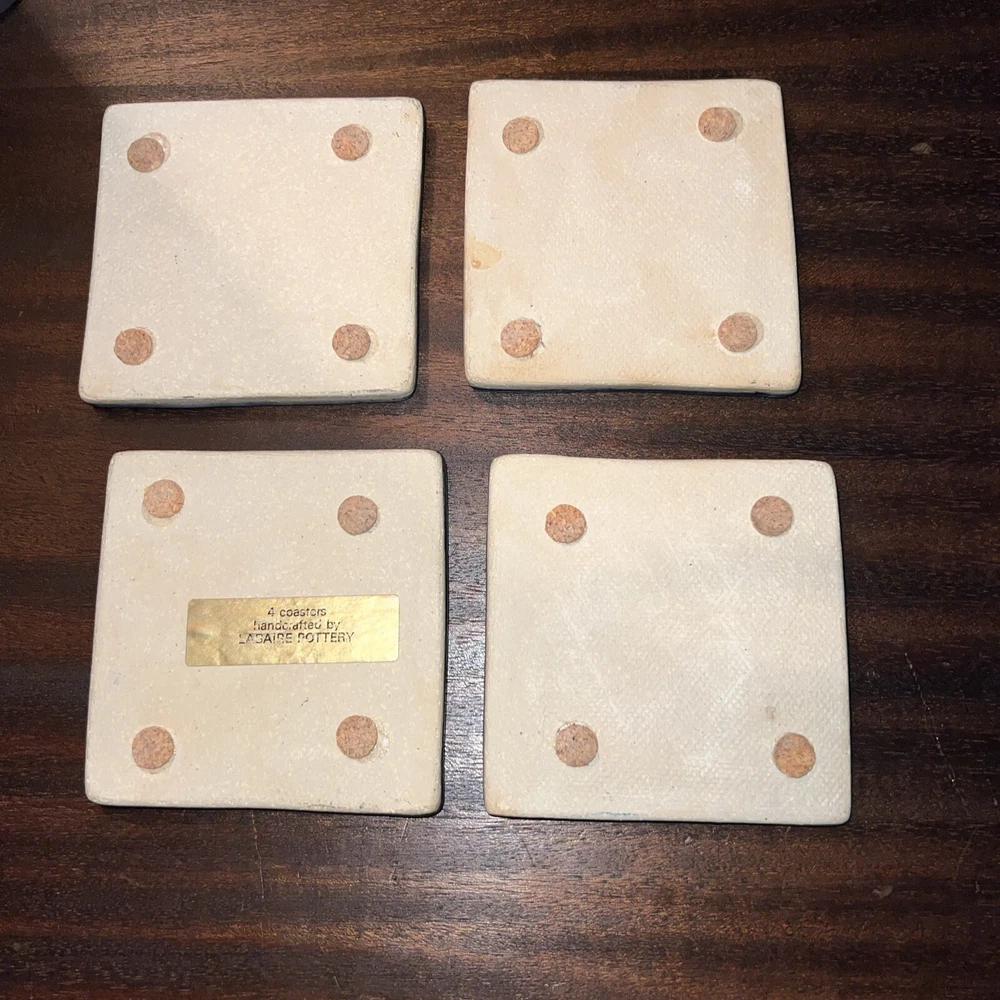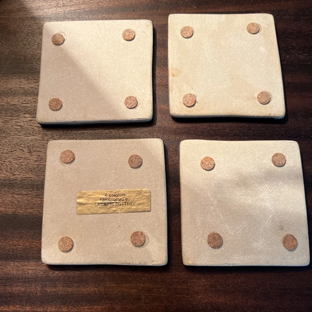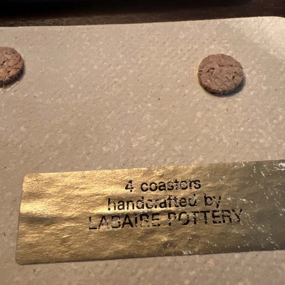 Set your drinks down on these beautiful handmade ceramic coasters by Labaire Pottery. This unique set of four coasters measures 3 3/8 inches square and is sure to add an artistic touch to any bar or living space. The handmade nature of each coaster means that no two are exactly alike, so you can be sure that you're getting a truly unique product. These coasters make a great gift for any occasion and are sure to be appreciated. These look new and are free from any sign of wear or damage.