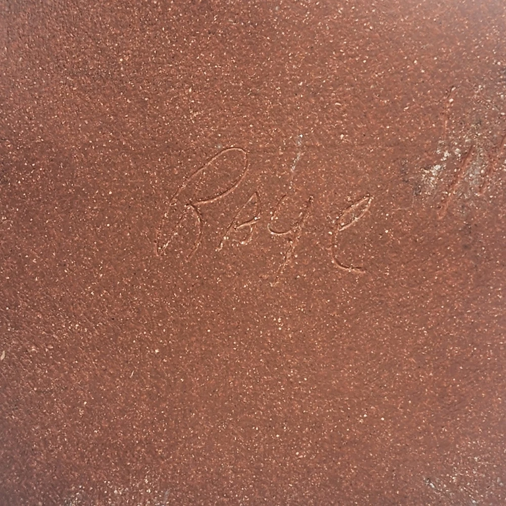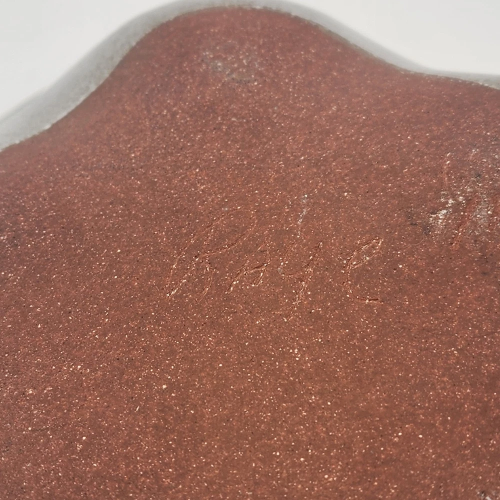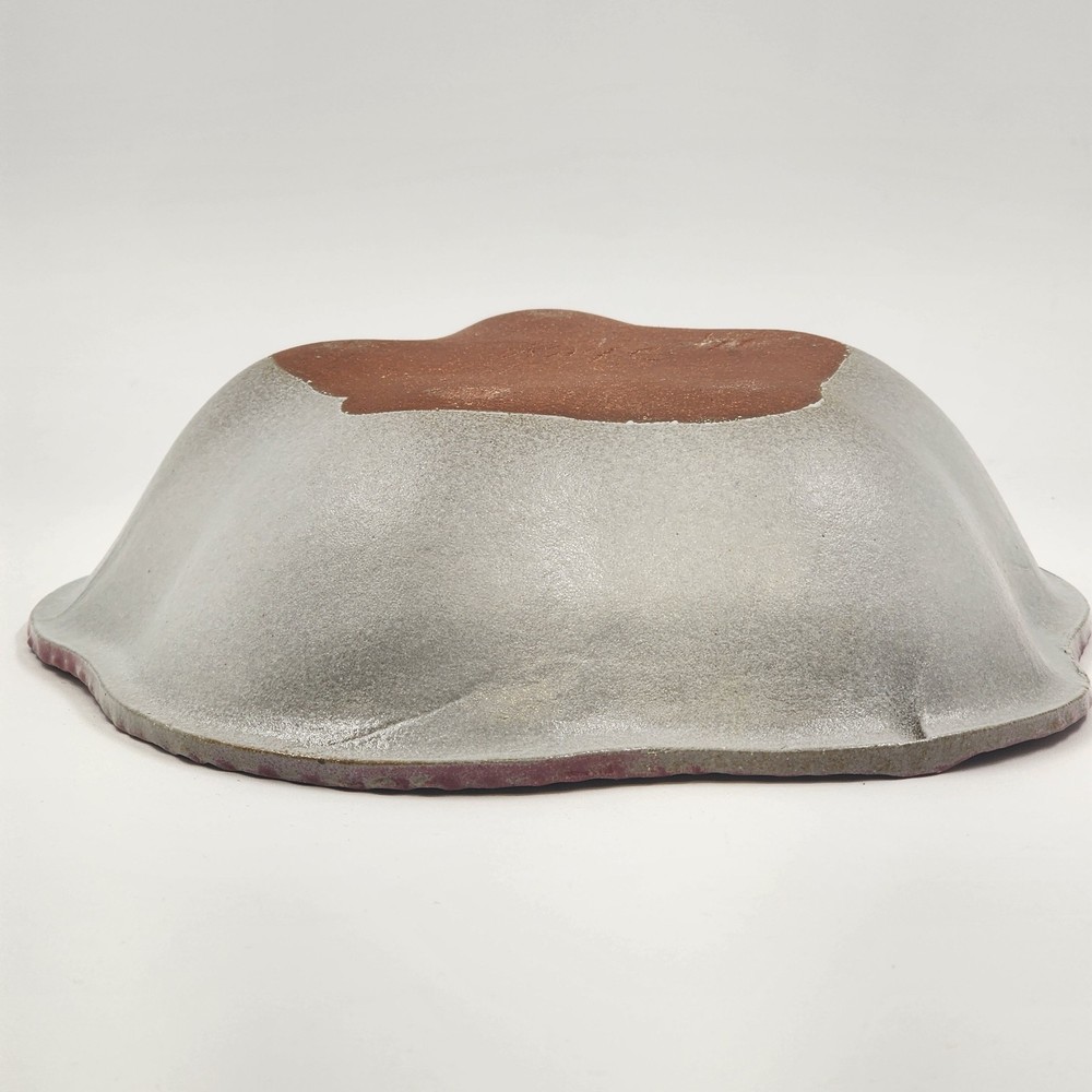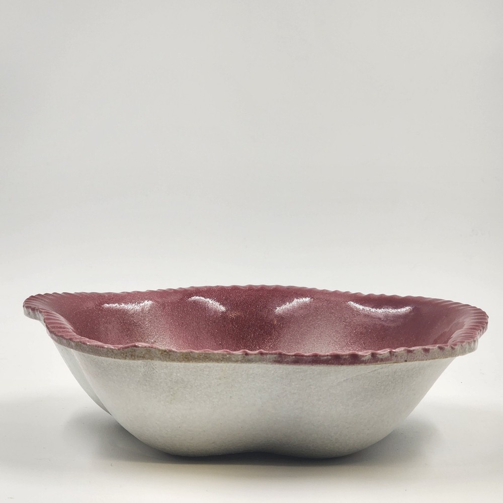 This is a unique handmade serving bowl made of red clay, with a pink to white glaze. It has a 5 sided to round shape, measuring 9 inches in diameter and 2.5 inches in height. The bowl is signed by the artist Raye and is part of a limited edition production. It features a semi-gloss finish and is designed in an eclectic style. This art pottery piece is hand-shaped and hand-glazed, making it a one-of-a-kind addition to any collection. Shipping weight is 2.25 Lbs