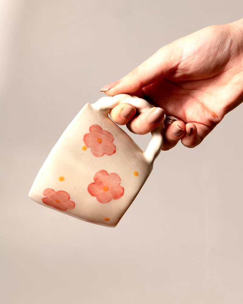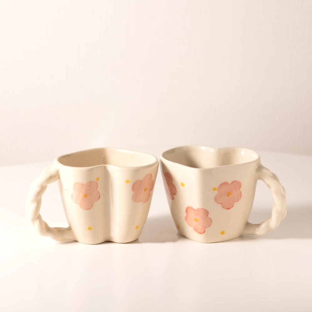 Versatile Heart-Shaped Mug: Handmade Braided Handle Studio Pottery adorned with an elegant Pink Flower Motif, perfect for commemorating special occasions such as Christmas, New Year, Women's Day, Valentine's Day, birthdays, anniversaries, or daily expressions of gratitude and love. Sentimental Symbolism: Exuding femininity and grace, this hand-painted porcelain cup is more than drinkware. Its heart-shaped design embodies sentimental value, symbolizing cherished memories and meaningful connections. Braided Handle Elegance: Alongside its heart-shaped form, the mug features a meticulously crafted braided handle, adding a unique touch of elegance to its hand-painted design. Enhanced Drinking Experience: Suitable for any beverage, this hand-painted Feminine Ceramic Cup elevates every sip, making shared moments during festive seasons or special events more memorable. Artisan Craftsmanship: Meticulous hand-painted artisan crafting ensures intricate attention to detail, crafting a unique and treasured piece of art, perfect for conveying care and sentimentality. Perfect Gift Choice: Whether for Christmas joy, New Year aspirations, Women's Day empowerment, Valentine's romance, birthdays, anniversaries, or daily expressions of love and gratitude, this exquisite hand-painted mug with a braided handle is an ideal gift capturing the essence of various occasions. Volume : 200 ml Rim Diameter : 3.5 inch Height : 3 inch handle : 1 inch Gap to hold : 0.75 inch