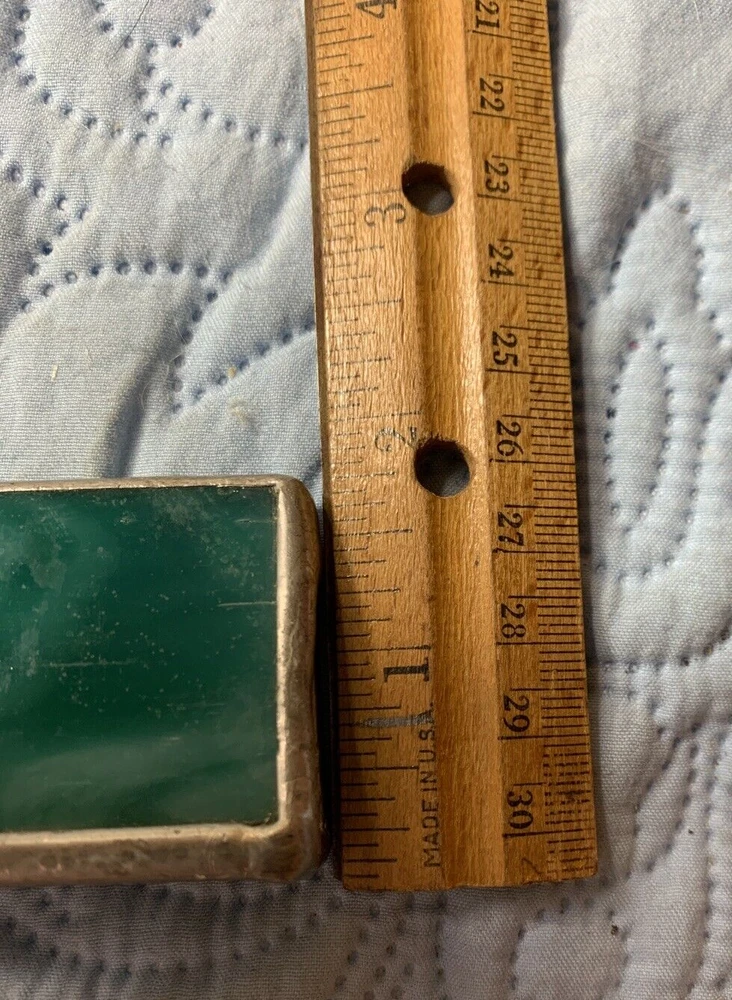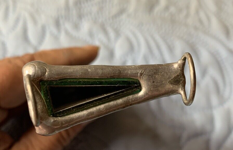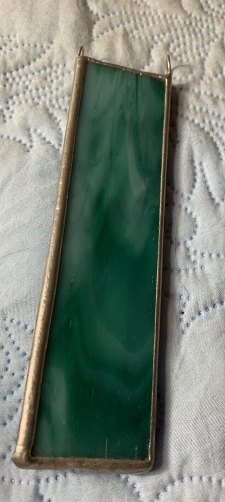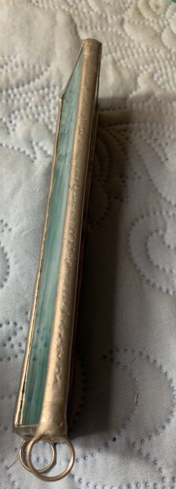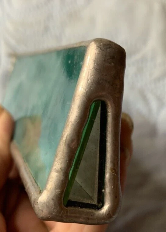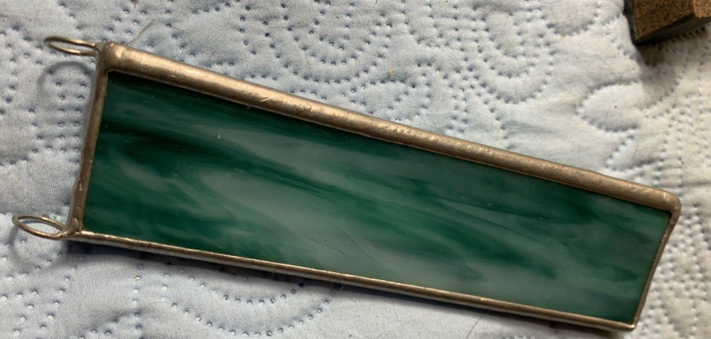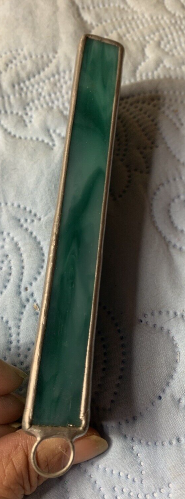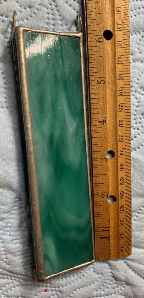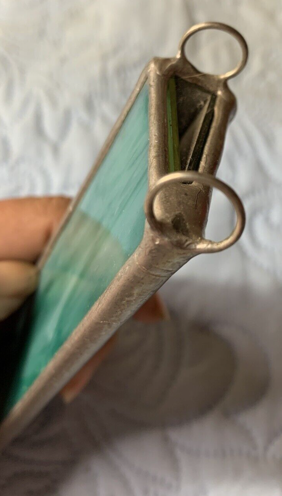 What do I have here? I have no idea. I have had it for many years. I'm sure I picked it up because I liked the glass. I believe is what is called slag glass. It is triangle shaped and is 3 pieces of glass with lead holding it together. The top has 2 hanging loops. I'm not sure if it is just a nice peice of glass intended to be hung or if it was part of a larger object. Its too heavy to be a necklace pendant. It measures 6" long or 6.5" long if you count the metal loops. The short side is 1/2" wide while the longer sides are 1.75". Please see the pictures for the best description. If you know what this is, PLEASE TELL ME. I didn't know where else to list it except in art glass.