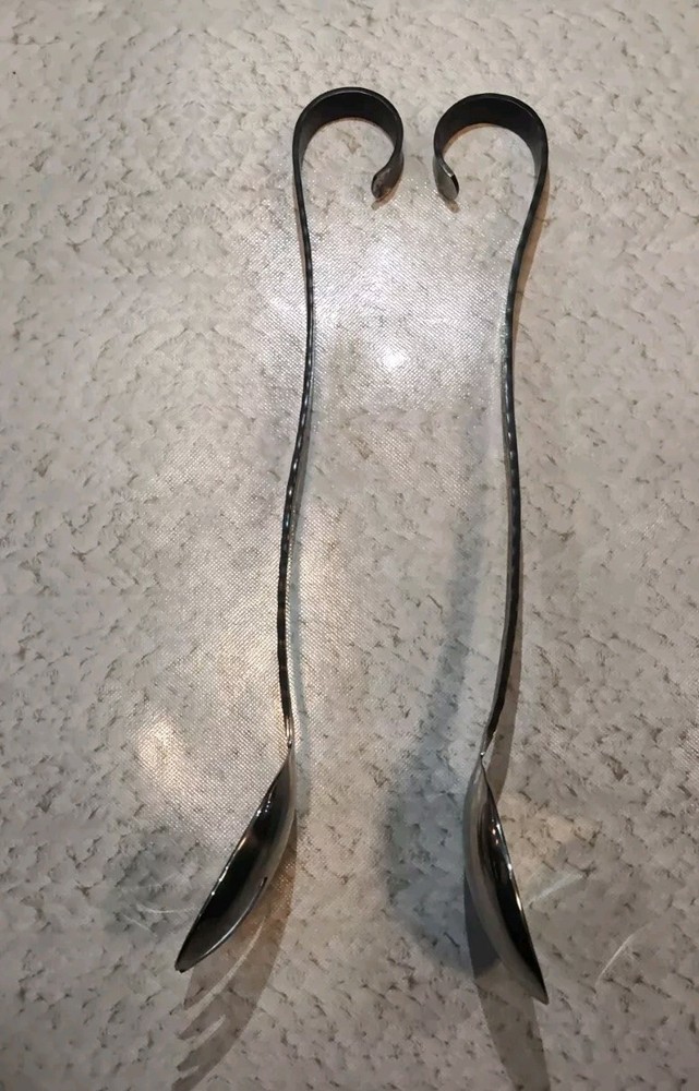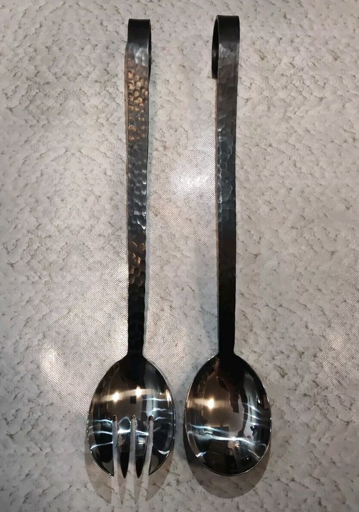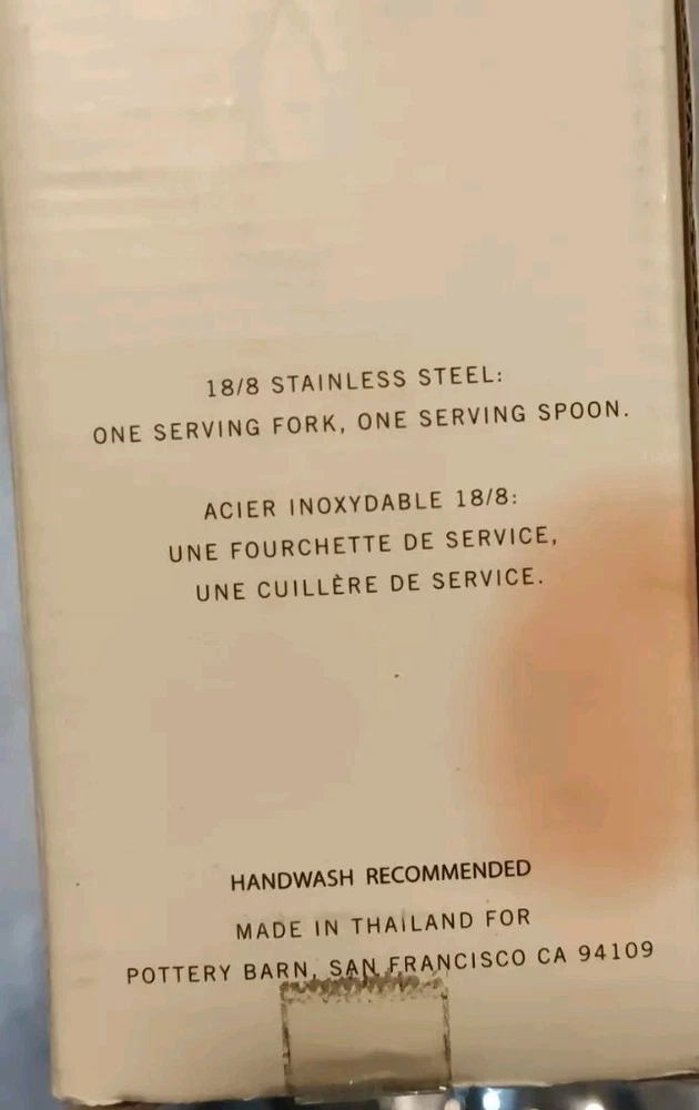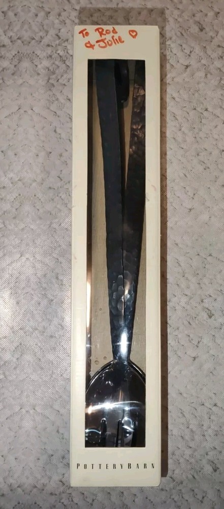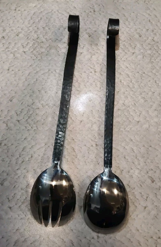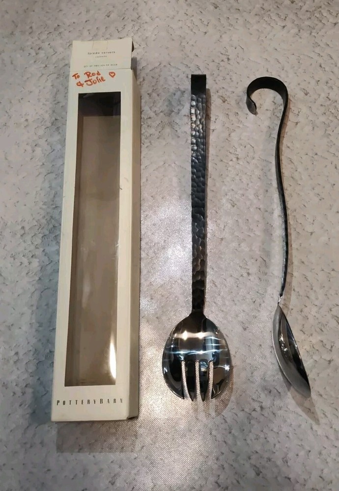 Pottery Barn Loredo Servers Serving Utensils Set of Two This set is used in the original box. Set is about 15" long. The handles are the venetian bronze color and the ends of the spoon and fork are silver. They are made of 18/8 stainless steel. Handwashing is recommended. The end of the handles have a curve as well as you should be able to see in the pics above. This is a very nice set that is very hard to find.