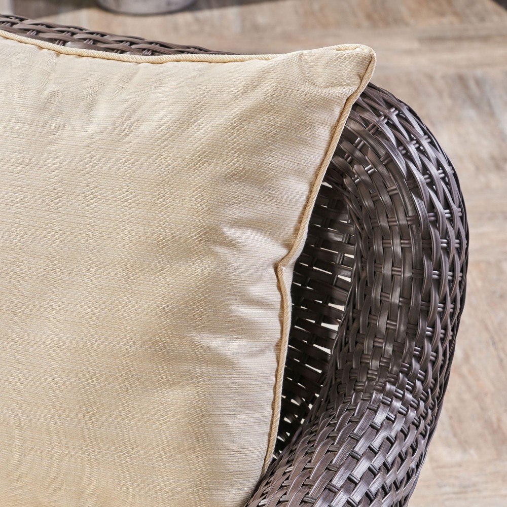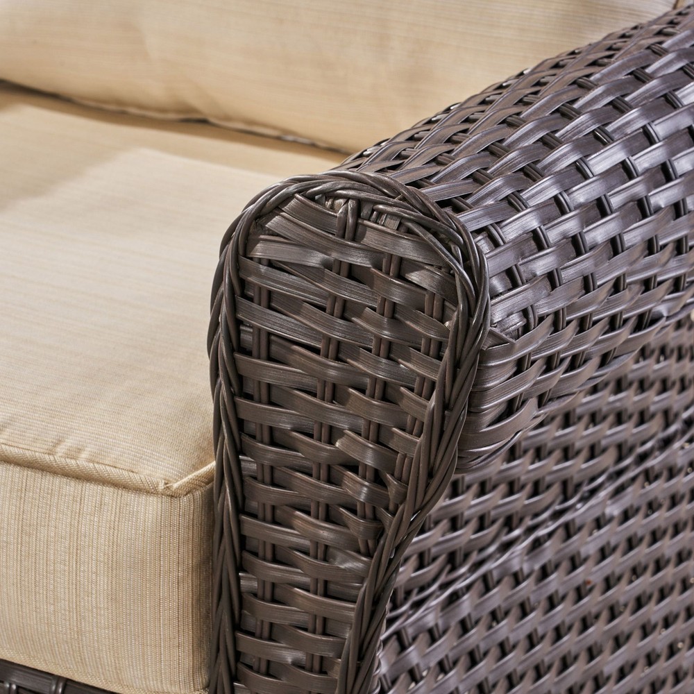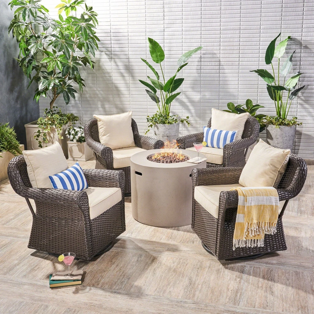 Elevating the classic bonfire to luxurious new heights, this five-piece outdoor gas fire pit set will make your backyard the place to be every weekend. Weather-resistant and constructed with care, this arrangement is sure to last as long as the friends you surround it with. With four lavishly cushioned seats to share, there will be room for everybody on your invite list. Includes: Four (4) Club Chairs and One (1) Fire Pit Chair Material: Polyethylene Wicker Chair Frame Material: Iron Chair Cushion Material: Water Resistant Fabric Composition: 100% Polyester Fire Pit Material: Light Weight Concrete Wicker Finish: Dark Brown Cushion Color: Beige Fire Pit Finish: Dark Gray BTU: 40,000 No Assembly Required Hand Crafted Details Chair Dimensions: 32.25 inches deep x 30.50 inches wide x 33.25 inches high Seat Dimensions: 23.75 inches deep x 21.00 inches wide x 15.25 inches high Arm Height: 26.00 Fire Pit Dimensions: 31.10 inches deep x 31.00 inches wide x 24.50 inches high PROP 65 WARNING
