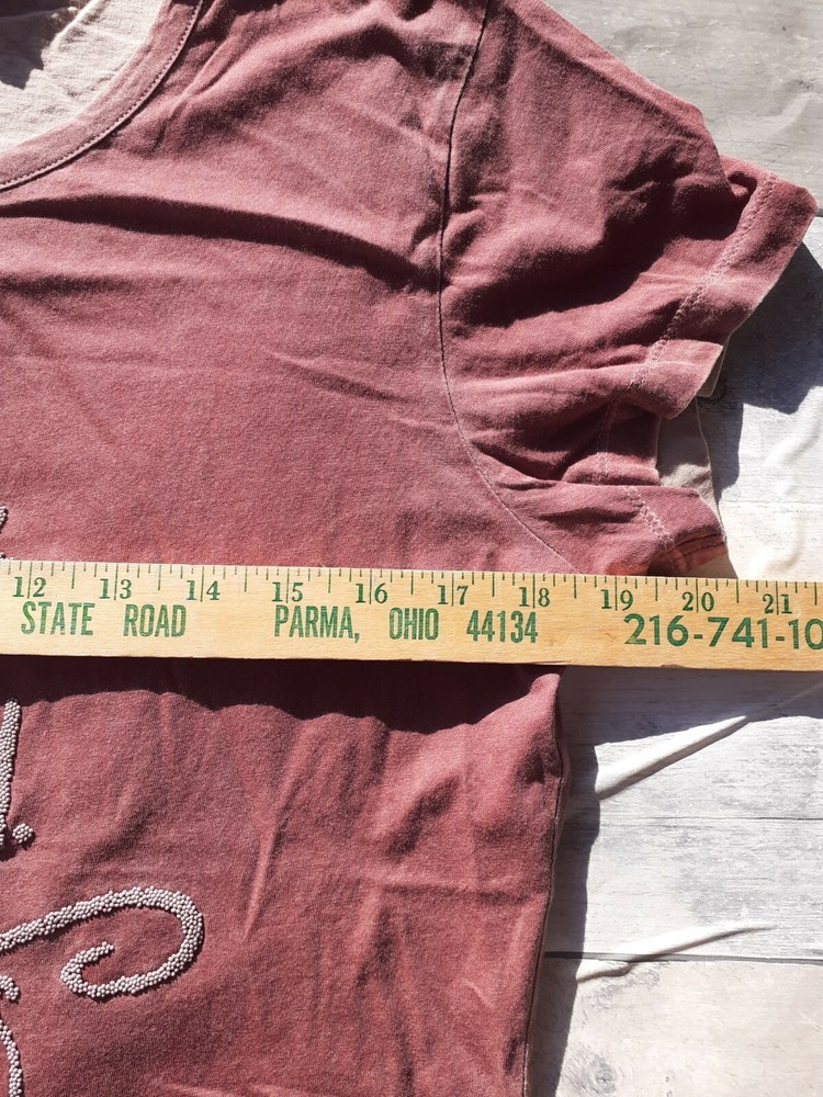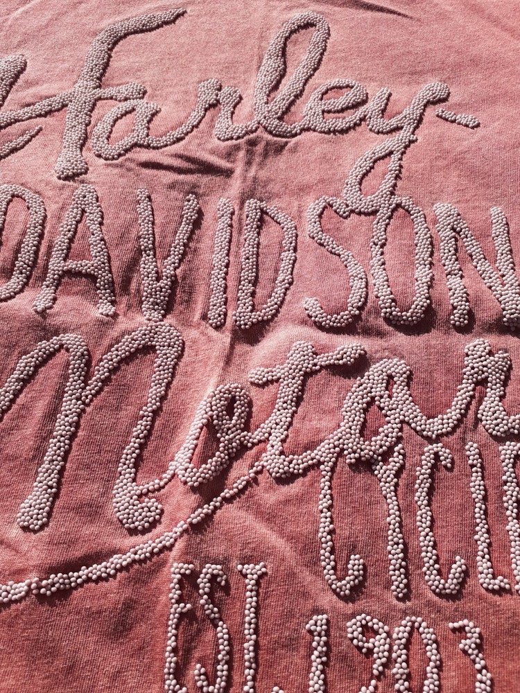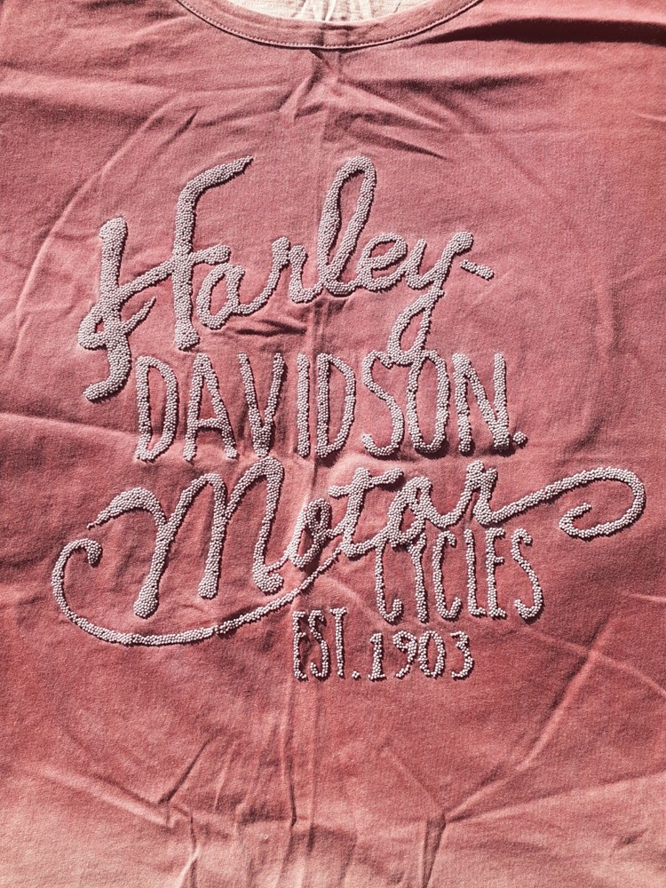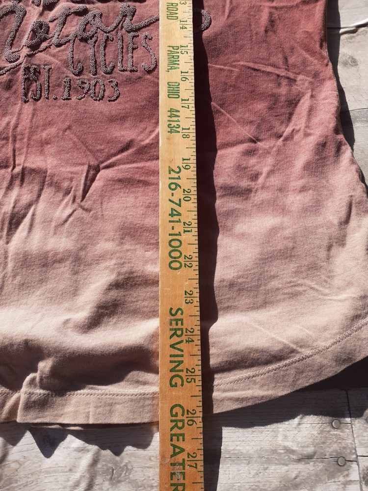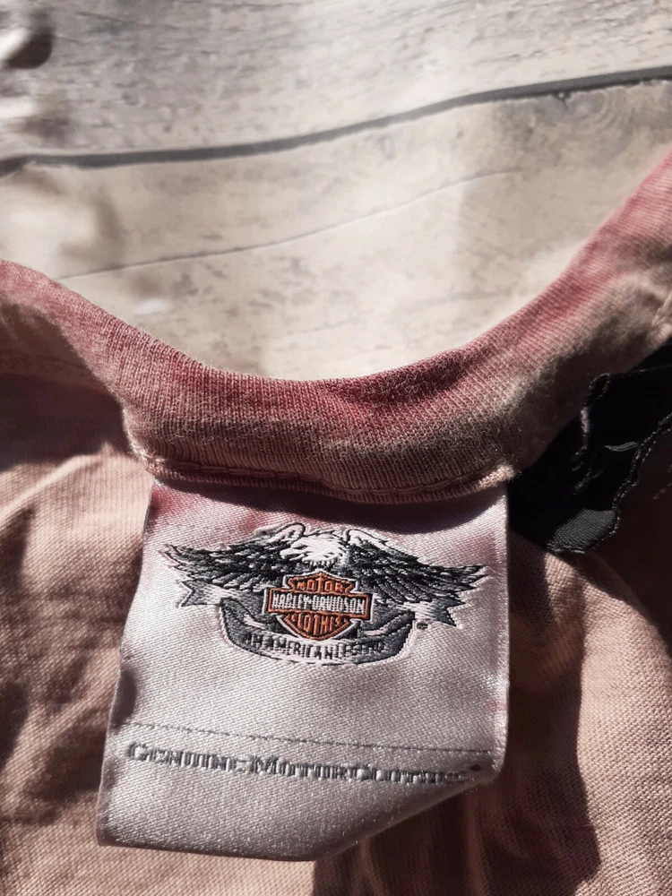 This Harley-Davidson women's tee shirt features a beautiful rose ombre effect that fades to gray, making it a perfect addition to any biker or classic themed outfit. The shirt is made from a comfortable cotton blend material that is lightweight and breathable, making it perfect for summer, fall, or spring. It has a crew neckline, short sleeves, and a pullover closure, with a regular fit that is machine washable for easy care. The shirt is a size large and ideal for casual occasions. The tee shirt is not vintage, but it still has a timeless appeal that will make you stand out in any crowd. Whether you're riding your Harley or just hanging out with friends, this tee shirt is a must-have for any woman's wardrobe. The lettering on the shirt is raised and textured . Womans size large.